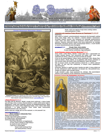 WSTAŃCIE, NIE LĘKAJCIE SIĘ…« » NR XII/2011 (466) GAZETKA PARAFII ŚW. ZYGMUNTA W SŁOMCZYNIE 20 MARCA 2011 Przemienienie Chrystusa ma na celu umocnienie wiary Apostołów ze względu na przyszłą mękę wyjście na „wysoką górę” jest przygotowaniem do wejścia na Kalwarię. Chrystus, Głowa Kościoła, ukazuje to, co zawiera Jego Ciało i czym promieniuje w sakramentach: „nadzieję chwały”Kol 1, 27, por. św. Leon Wielki. [KKK, 568] DRUGA NIEDZIELA WIELKIEGO POSTU Panie, niech nas ogarnie Twoja łaska według nadziei, którą pokładamy w Tobie. Z DRUGIEGO LISTU ŚWIĘTEGO PAWŁA APOSTOŁA DO TYMOTEUSZA2 Tm 1,8b–109 Najdroższy: Weź udział w trudach i przeciwnościach znoszonych dla Ewangelii według danej mocy Boga, który nas wybawił i wezwał świętym wezwaniem, nie dzięki naszym czynom, lecz stosownie do własnego postanowienia i łaski, która nam dana została w Chrystusie Jezusie przed wiecznymi czasami. Ukazana natomiast została teraz przez pojawienie się naszego Zbawiciela, Chrystusa Jezusa, który przezwyciężył śmierć, a rzucił światło na życiei nieśmiertelność przez Ewangelię. AKLAMACJAMt 17,5 Chwała Tobie, Królu wieków Z obłoku świetlanego odezwał się głos: »To jest mój Syn umiłowany, Jego słuchajcie«. SŁOWA EWANGELII WEDŁUG ŚWIĘTEGO MATEUSZAMt 17,1–9 Jezus wziął z sobą Piotra, Jakuba i brata jego Jana i zaprowadził ich na górę wysoką osobno. Tam przemienił się wobec nich: twarz Jego zajaśniała jak słońce, odzienie zaś stało się białe jak światło. A oto im się ukazali Mojżesz i Eliasz, którzy rozmawiali z Nim. Wtedy Piotr rzekł do Jezusa: „Panie, dobrze, że tu jesteśmy; jeśli chcesz, postawię tu trzy namioty: jeden dla Ciebie, jeden dla Mojżesza i jeden dla Eliasza”. Gdy on jeszcze mówił, oto obłok świetlany osłonił ich, a z obłoku odezwał się głos: »To jest mój Syn umiłowany, w którym mam upodobanie, Jego słuchajcie«. Uczniowie, słysząc to, upadli na twarz i bardzo się zlękli. A Jezus zbliżył się do nich, dotknął ich i rzekł: »Wstańcie, nie lękajcie się«. Gdy podnieśli oczy, nikogo nie widzieli, tylko samego Jezusa. A gdy schodzili z góry, Jezus przykazał im, mówiąc: »Nie opowiadajcie nikomu o tym widzeniu, aż Syn Człowieczy zmartwychwstanie«. PATRONKA TYGODNIA: ŚW. ALEKSANDRA, MĘCZENNICA PRZEMIENIENIE PAŃSKIE, BLOIS, Abraham de (1679-1720) i PICART, Bernard (1673, Paryż – 1733, Amsterdam), rycina, ilustracja z Biblii opublikowanej przez P. de Hondta, Haga, 1728; źródło Bizzell Bible Collection, University of Oklahoma Libraries, www.mythfolklore.net Z KSIĘGI RODZAJU Rdz 12,1–4a Pan Bóg rzekł do Abrama: »Wyjdź z twojej ziemi rodzinnej i z domu twego ojca do kraju, który ci ukażę. Uczynię bowiem z ciebie wielki naród, będę ci błogosławił i twoje imię rozsławię: staniesz się błogosławieństwem. Będę błogosławił tym, którzy ciebie błogosławić będą, a tym, którzy tobie będą złorzeczyli, i Ja będę złorzeczył. Przez ciebie będą otrzymywały błogosławieństwo ludy całej ziemi«. Abram udał się w drogę, jak mu Pan rozkazał, a z nim poszedł i Lot. PSALM RESPONSORYJNYPs 33 REFREN: Mamy nadzieję w miłosierdziu Pana Słowo Pana jest prawe, a każde Jego dzieło godne zaufania. On miłuje prawo i sprawiedliwość, ziemia jest pełna Jego łaski. Oczy Pana zwrócone na bogobojnych, na tych, którzy czekają na Jego łaskę,a by ocalił ich życie od śmierci i żywił ich w czasie głodu. Dusza nasza oczekuje Pana, jest naszą pomocą i tarczą. Wydanie internetowe: www.swzygmunt.knc.pl Pochodziła z okolic Ancyry (dzisiejsza Ankara), ówcześnie należącej do prowincji Galacji w Azji Mniejszej imperium rzymskiego. Żyła na przełomie III i IV w., w czasach cesarza Dioklecjana. W 303 zaczął obowiązywać wydany przez tegoż władcę edykt zakazujący praktyk chrześcijańskich. Zgodnie z nim miejscowy zarządca, gubernator Teoktenus, nakazał przedkładać i poświęcać bóstwom pogańskim wszystkie dobra, którymi handlowano w mieście. Zarządził obowiązkowe procesje ku czci owych bóstw. Pragnął, jak tylu przed i po nim, wytępić wiarę z powierzchni ziemi… W Ancyrze prześladowania przybrały szczególnie okrutną formę. Część chrześcijan uciekła z miasta na pustynię. Na ulicach grasowały gangi wyszukujące wiernych i wymuszające oddawanie czci bożkom. Słabsi i starsi pozostali. Wśród nich była i mająca prawdopodobnie ok. 60 lat, żyjąca w dziewictwie, Aleksandra. Przechwycono ją (ok. 303/4) i próbowano zmusić groźbami do odstępstwa. Nie ugięła się. Oddano ją więc na pohańbienie młodym libertynom i zaprowadzono, wraz z sześcioma towarzyszkami (zapis w Martyrologii RzymskiejActa SS., maj,IV, 147 zachował imiona owych starszych niewiast: Tekusa, Klaudia, Faina, Eufrazja, Matrona i Julita), do domu publicznego. Bezskutecznie: udało im się przekonać - mogących być wszak ich synami - napastników i zachowały dziewictwo… Postanowiono zmusić je zatem do wzięcia udziału w procesji ku czci, i z posążkami, które obmywano w lokalnym stawie, bóstw Artemidy i Ateny. Odmówiły świadcząc publicznie wobec pogańskich kapłanek o Jezusie. Odrzuciły ofiarowane im piękne, pogańskie ceremonialne szaty… Zawleczono je więc na wozach, wystawiając nagie na pośmiewisko pospólstwa, nad znajdujące się w okolicy grzęzawiska. Następnie obciążono ich szyje wielkimi kamieniami i utopiono… W nocy ich ciała wydobył z wody Teodot (jedna z nich, Tekusa, była jego ciotką), aby im sprawić chrześcijański pogrzeb. Zdradził go jednakże jeden z sąsiadów… Teodota aresztowano. Ciała męczennic spalono. Uwięzionego poddano torturom i po paru dniach ścięto (jego szczątki utajniona społeczność chrześcijańska miała uratować i przenieść do pobliskiego Malos, gdzie je pochował lokalny kapłan, niejaki Fronto)… (uroczystość 20 marca) i