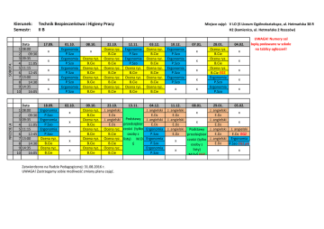 NIEDZIELA SOBOTA Kierunek: Semestr: Technik Bezpieczeństwa i Higieny Pracy II B 17.09. 1 2 3 4 5 6 7 8 9 10 Data 08:00 09:30 09:35 11:05 11:15 12:45 13:00 14:30 14:35 16:05 1 2 3 4 5 6 7 8 9 10 Data 08:00 09:30 09:35 11:05 11:15 12:45 13:00 14:30 14:35 16:05 18.09. Ergonomia P.Szo Ergonomia P.Szo Ergonomia P.Szo Ocena ryz. B.Cie Ocena ryz. B.Cie x x x x x 01.10. Ergonomia P.Szo Ergonomia P.Szo Ergonomia P.Szo Ergonomia P.Szo Ergonomia P.Szo 02.10. x x x x x 08.10. Miejsce zajęć: V LO (5 Liceum Ogólnokształcące, ul. Hetmańska 38 Rzeszów H2 (kamienica, ul. Hetmańska 2 Rzeszów) Ocena ryz. B.Cie Ocena ryz. B.Cie Ocena ryz. B.Cie Ocena ryz. B.Cie 22.10. Ocena ryz. B.Cie Ocena ryz. B.Cie Ocena ryz. B.Cie Ocena ryz. B.Cie Ocena ryz. B.Cie 09.10. Ocena ryz. B.Cie Ocena ryz. B.Cie Ocena ryz. B.Cie Ocena ryz. B.Cie Ocena ryz. B.Cie 23.10. 13.11. 04.12. J. angielski J. angielski E.Dz E.Dz J. angielski Podstawy J. angielski przedsiębior E.Dz E.Dz Ocena ryz. czości (tylko Ergonomia B.Cie osoby z P.Szo Ocena ryz. listy) M.D- Ergonomia B.Cie P.Szo Ś Ocena ryz. Ergonomia B.Cie P.Szo x Zatwierdzono na Radzie Pedagogicznej: 31.08.2016 r. UWAGA! Zastrzegamy sobie możliwość zmiany planu zajęć. 12.11. Ergonomia P.Szo Ergonomia P.Szo Ocena ryz. B.Cie Ocena ryz. B.Cie Ocena ryz. B.Cie 03.12. Ocena ryz. B.Cie Ocena ryz. B.Cie Ocena ryz. B.Cie Ocena ryz. B.Cie Ocena ryz. B.Cie 10.12. Ergonomia P.Szo Ergonomia P.Szo Ergonomia P.Szo Ergonomia P.Szo 07.01. x x x x x x 11.12. 08.01. J. angielski x E.Dz J. angielski x E.Dz J. angielski Podstawy E.Dz przedsiębior czości (tylko x osoby z listy) x M.D-Ś EGZ 28.01. Ocena ryz. B.Cie Ocena ryz. B.Cie Ocena ryz. B.Cie EGZ Ergonomia P.Szo Ergonomia P.Szo 04.02. x x x x x 29.01. 05.02. J. angielski x E.Dz J. angielski x E.Dz J. angielski J. angielski E.Dz E.Dz EGZ J. angielski Ergonomia E.Dz P.Szo EGZ pis x x UWAGA! Numery sal będą podawane w szkole na tablicy ogłoszeń! 38 Rzeszów)