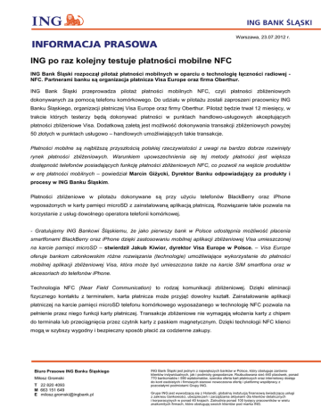 Warszawa, 23.07.2012 r. ING po raz kolejny testuje płatności mobilne NFC ING Bank Śląski rozpoczął pilotaż płatności mobilnych w oparciu o technologię łączności radiowej NFC. Partnerami banku są organizacja płatnicza Visa Europe oraz firma Oberthur. ING Bank Śląski przeprowadza pilotaż płatności mobilnych NFC, czyli płatności zbliżeniowych dokonywanych za pomocą telefonu komórkowego. Do udziału w pilotażu zostali zaproszeni pracownicy ING Banku Śląskiego, organizacji płatniczej Visa Europe oraz firmy Oberthur. Pilotaż będzie trwał 12 miesięcy, w trakcie których testerzy będą dokonywać płatności w punktach handlowo-usługowych akceptujących płatności zbliżeniowe Visa. Dodatkową zaletą jest możliwość dokonywania transakcji zbliżeniowych powyżej 50 złotych w punktach usługowo – handlowych umożliwiających takie transakcje. Płatności mobilne są najbliższą przyszłością polskiej rzeczywistości z uwagi na bardzo dobrze rozwinięty rynek płatności zbliżeniowych. Warunkiem upowszechnienia się tej metody płatności jest większa dostępność telefonów posiadających funkcję płatności zbliżeniowych NFC, co pozwoli na wejście produktów w erę płatności mobilnych – powiedział Marcin Giżycki, Dyrektor Banku odpowiadający za produkty i procesy w ING Banku Śląskim. Płatności zbliżeniowe w pilotażu dokonywane są przy użyciu telefonów BlackBerry oraz iPhone wyposażonych w karty pamięci microSD z zainstalowaną aplikacją płatniczą. Rozwiązanie takie pozwala na korzystanie z usług dowolnego operatora telefonii komórkowej. - Gratulujemy ING Bankowi Śląskiemu, że jako pierwszy bank w Polsce udostępnia możliwość płacenia smartfonami BlackBerry oraz iPhone dzięki zastosowaniu mobilnej aplikacji zbliżeniowej Visa umieszczonej na karcie pamięci microSD – stwierdził Jakub Kiwior, dyrektor Visa Europe w Polsce. – Visa Europe oferuje bankom członkowskim różne rozwiązania (technologie) umożliwiające wykorzystanie do płatności mobilnej aplikacji zbliżeniowej Visa, która może być umieszczona także na karcie SIM smartfona oraz w akcesoriach do telefonów iPhone. Technologia NFC (Near Field Communication) to rodzaj komunikacji zbliżeniowej. Dzięki eliminacji fizycznego kontaktu z terminalem, karta płatnicza może przyjąć dowolny kształt. Zainstalowanie aplikacji płatniczej na karcie pamięci microSD telefonu komórkowego wyposażanego w technologię NFC pozwala na pełnienie przez niego funkcji karty płatniczej. Transakcje zbliżeniowe nie wymagają włożenia karty z chipem do terminala lub przeciągnięcia przez czytnik karty z paskiem magnetycznym. Dzięki technologii NFC klienci mogą w szybszy wygodny i bezpieczny sposób płacić za codzienne zakupy. Biuro Prasowe ING Banku Śląskiego Miłosz Gromski T 22 820 4093 M 663 151 649 E [email protected] ING Bank Śląski jest jednym z największych banków w Polsce, który obsługuje zarówno klientów indywidualnych, jak i podmioty gospodarcze. Rozbudowana sieć 440 placówek, ponad 770 bankomatów i 590 wpłatomatów, szeroka oferta kart płatniczych oraz internetowy dostęp do kont osobistych i firmowych stanowi nowoczesna ofertę i platformę współpracy z pozostałymi podmiotami Grupy ING. Grupa ING jest wywodzącą się z Holandii, globalną instytucją finansową świadczącą usługi z zakresu bankowości, ubezpieczeń i zarządzania aktywami dla klientów detalicznych i korporacyjnych w ponad 40 krajach. Zatrudnia ponad 100 tysięcy pracowników w wielu znakomitych firmach, które obsługują swoich klientów pod marka ING.