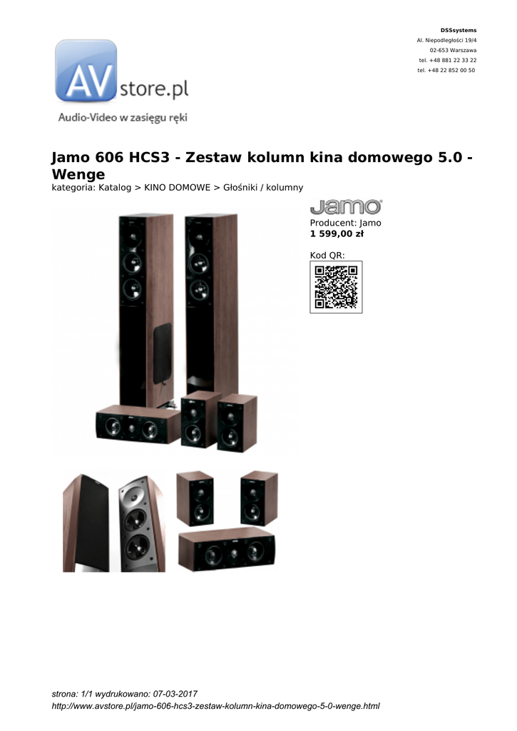 DSSsystems Al. Niepodległości 19/4 02-653 Warszawa tel. +48 881 22 33 22 tel. +48 22 852 00 50 Jamo 606 HCS3 - Zestaw kolumn kina domowego 5.0 Wenge kategoria: Katalog > KINO DOMOWE > Głośniki / kolumny Producent: Jamo 1 599,00 zł Kod QR: strona: 1/1 wydrukowano: 07-03-2017 http://www.avstore.pl/jamo-606-hcs3-zestaw-kolumn-kina-domowego-5-0-wenge.html