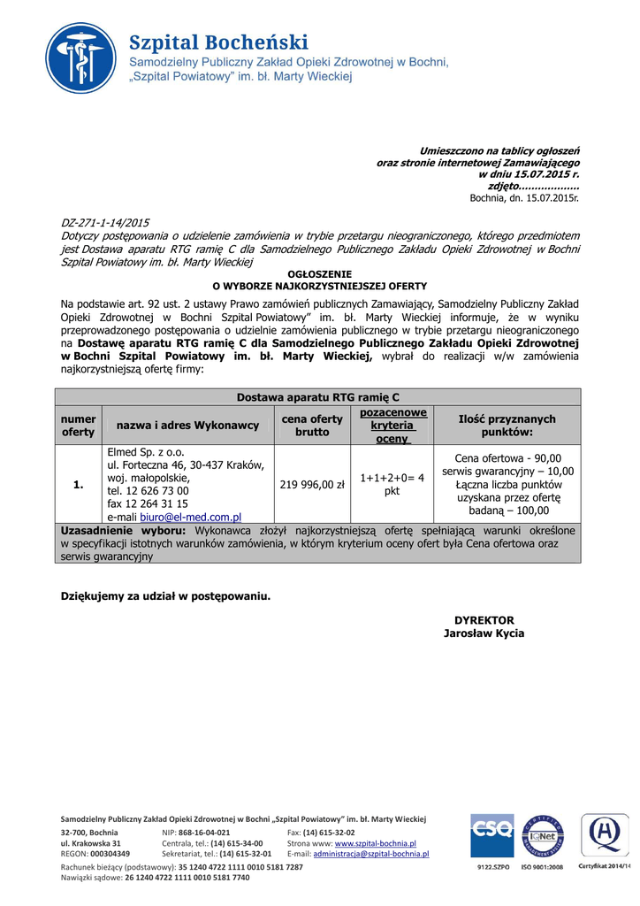 Umieszczono na tablicy ogłoszeń oraz stronie internetowej Zamawiającego w dniu 15.07.2015 r. zdjęto………………. Bochnia, dn. 15.07.2015r. DZ-271-1-14/2015 Dotyczy postępowania o udzielenie zamówienia w trybie przetargu nieograniczonego, którego przedmiotem jest Dostawa aparatu RTG ramię C dla Samodzielnego Publicznego Zakładu Opieki Zdrowotnej w Bochni Szpital Powiatowy im. bł. Marty Wieckiej OGŁOSZENIE O WYBORZE NAJKORZYSTNIEJSZEJ OFERTY Na podstawie art. 92 ust. 2 ustawy Prawo zamówień publicznych Zamawiający, Samodzielny Publiczny Zakład Opieki Zdrowotnej w Bochni Szpital Powiatowy” im. bł. Marty Wieckiej informuje, Ŝe w wyniku przeprowadzonego postępowania o udzielnie zamówienia publicznego w trybie przetargu nieograniczonego na Dostawę aparatu RTG ramię C dla Samodzielnego Publicznego Zakładu Opieki Zdrowotnej w Bochni Szpital Powiatowy im. bł. Marty Wieckiej, wybrał do realizacji w/w zamówienia najkorzystniejszą ofertę firmy: Dostawa aparatu RTG ramię C pozacenowe numer cena oferty Ilość przyznanych nazwa i adres Wykonawcy kryteria oferty brutto punktów: oceny Elmed Sp. z o.o. Cena ofertowa - 90,00 ul. Forteczna 46, 30-437 Kraków, serwis gwarancyjny – 10,00 woj. małopolskie, 1+1+2+0= 4 219 996,00 zł 1. Łączna liczba punktów tel. 12 626 73 00 pkt uzyskana przez ofertę fax 12 264 31 15 badaną – 100,00 e-mali [email protected] Uzasadnienie wyboru: Wykonawca złoŜył najkorzystniejszą ofertę spełniającą warunki określone w specyfikacji istotnych warunków zamówienia, w którym kryterium oceny ofert była Cena ofertowa oraz serwis gwarancyjny Dziękujemy za udział w postępowaniu. DYREKTOR Jarosław Kycia Samodzielny Publiczny Zakład Opieki Zdrowotnej w Bochni „Szpital Powiatowy” im. bł. Marty Wieckiej 32-700, Bochnia ul. Krakowska 31 REGON: 000304349 NIP: 868-16-04-021 Centrala, tel.: (14) 615-34-00 Sekretariat, tel.: (14) 615-32-01 Fax: (14) 615-32-02 Strona www: www.szpital-bochnia.pl E-mail: [email protected] Rachunek bieżący (podstawowy): 35 1240 4722 1111 0010 5181 7287 Nawiązki sądowe: 26 1240 4722 1111 0010 5181 7740