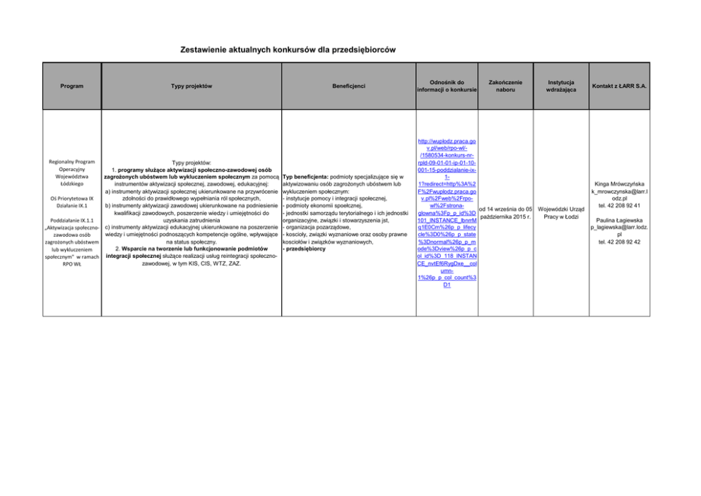 Zestawienie aktualnych konkursów dla przedsiębiorców Program Regionalny Program Operacyjny Województwa Łódzkiego Typy projektów Typy projektów: 1. programy służące aktywizacji społeczno-zawodowej osób zagrożonych ubóstwem lub wykluczeniem społecznym za pomocą instrumentów aktywizacji społecznej, zawodowej, edukacyjnej: a) instrumenty aktywizacji społecznej ukierunkowane na przywrócenie Oś Priorytetowa IX zdolności do prawidłowego wypełniania ról społecznych, Działanie IX.1 b) instrumenty aktywizacji zawodowej ukierunkowane na podniesienie kwalifikacji zawodowych, poszerzenie wiedzy i umiejętności do Poddziałanie IX.1.1 uzyskania zatrudnienia „Aktywizacja społeczno- c) instrumenty aktywizacji edukacyjnej ukierunkowane na poszerzenie wiedzy i umiejętności podnoszących kompetencje ogólne, wpływające zawodowa osób na status społeczny. zagrożonych ubóstwem 2. Wsparcie na tworzenie lub funkcjonowanie podmiotów lub wykluczeniem społecznym" w ramach integracji społecznej służące realizacji usług reintegracji społecznozawodowej, w tym KIS, CIS, WTZ, ZAZ. RPO WŁ Beneficjenci Typ beneficjenta: podmioty specjalizujące się w aktywizowaniu osób zagrożonych ubóstwem lub wykluczeniem społecznym: - instytucje pomocy i integracji społecznej, - podmioty ekonomii spoełcznej, - jednostki samorządu terytorialnego i ich jednostki organizacyjne, związki i stowarzyszenia jst, - organizacja pozarządowe, - koscioły, związki wyznaniowe oraz osoby prawne kosciołów i związków wyznaniowych, - przedsiębiorcy Odnośnik do informacji o konkursie Zakończenie naboru http://wuplodz.praca.go v.pl/web/rpo-wl//1580534-konkurs-nrrpld-09-01-01-ip-01-10001-15-poddzialanie-ix11?redirect=http%3A%2 F%2Fwuplodz.praca.go v.pl%2Fweb%2Frpowl%2Fstronaod 14 września do 05 glowna%3Fp_p_id%3D października 2015 r. 101_INSTANCE_lbnrrM q1E0Cm%26p_p_lifecy cle%3D0%26p_p_state %3Dnormal%26p_p_m ode%3Dview%26p_p_c ol_id%3D_118_INSTAN CE_nvtEf6RygDxe__col umn1%26p_p_col_count%3 D1 Instytucja wdrażająca Wojewódzki Urząd Pracy w Łodzi Kontakt z ŁARR S.A. Kinga Mrówczyńska [email protected] odz.pl tel. 42 208 92 41 Paulina Łagiewska [email protected]. pl tel. 42 208 92 42 Program Operacyjny Inteligentny Rozwój Działania 2.3 „Proinnowacyjne usługi dla przedsiębiorstw" Poddziałania 2.3.2 „Bony na innowacje dla MŚP" . W ramach Działania 2.3 Poddziałania 2.3.2 dofinansowanie przeznaczone jest na realizację projektów obejmujących zakup od wykonawcy usługi polegającej na opracowaniu nowego lub znacząco ulepszonego wyrobu, usługi, technologii produkcji lub nowego projektu wzorniczego. Program Operacyjny Inteligentny Rozwój Działania 3.2 „Wsparcie wdrożeń wyników prac B+R" Poddziałania 3.2.1 „Badania na rynek" w ramach III Osi priorytetowej: „Wsparcie innowacji w przedsiębiorstwach" Programu Operacyjnego Inteligentny Rozwój 2014 - 2020 przeznaczone jest na realizację projektów dotyczących wdrożenia wyników prac badawczo-rozwojowych przeprowadzonych przez wnioskodawcę samodzielnie lub na jego zlecenie, prowadzących do wprowadzenia na rynek nowych bądź znacząco ulepszonych produktów (wyrobów lub usług). Program Operacyjny Inteligentny Rozwój INNOMED w ramach działania 1.2 „Sektorowe programy B+R”. Projekty B+R w obszarze innowacyjnej medycyny. Finansowanie badań naukowych i prac rozwojowych w zakresie poszukiwania innowacyjnych leków, nowoczesnych metod terapeutycznych, a także nowych technologii produkcji leków generycznych. Program Operacyjny Inteligentny Rozwój Projekty inwestycyjne związane z tworzeniem lub rozwojem centrów badawczo-rozwojowych. Przez inwestycję typu centrum badawczorozwojowe należy rozumieć jednostkę organizacyjną lub wyodrębnioną organizacyjnie jednostkę rozpoczynającą lub rozwijającą działalność, której głównym zadaniem jest prowadzenie przez wykwalifikowaną kadrę badań naukowych i prac rozwojowych w wydzielonych i przystosowanych do tego typu działalności pomieszczeniach oraz z wykorzystaniem infrastruktury badawczo-rozwojowej. MŚP http://poir.parp.gov.pl/n aborod 31 sierpnia do 30 wnioskow/ogloszenie-o- grudnia 2015 r. (w konkursie-do-dzialania- ostatnim dniu naboru 2-3-poddzialania-2-3-2- do godz. 16:00:00). w-2015-r MŚP http://poir.parp.gov.pl/c ontent/ogloszenie-okonkursie-do-dzialania3-2-poddzialania-3-2-1w-2015-r Przedsiębiorcy, Działanie 2.1 PO IR skierowane jest do przedsiębiorstw. od 31 sierpnia do 30 września 2015 r. (w ostatnim dniu naboru do godz. 16:00:00). http://www.ncbir.pl/fund uszeod 1 września do 1 europejskie/poir/konkur października 2015 r. sy/konkurs2122015inno med/ http://www.poir.gov.pl/n abory/21-wsparcieinwestycji-winfrastrukture-brprzedsiebiorstw/ PARP Monika Więckowska tel. 724 544 020 e-mail: [email protected] dz.pl Bartłomiej Walczak [email protected] tel. 42 208 92 78 PARP Monika Więckowska tel. 724 544 020 e-mail: [email protected] dz.pl Bartłomiej Walczak [email protected] tel. 42 208 92 78 NCBR Monika Więckowska tel. 724 544 020 e-mail: [email protected] dz.pl Bartłomiej Walczak [email protected] tel. 42 208 92 78 Nabór od dnia 1 Ministerstwo września 2015 r. do Gospodarki dnia 30 października 2015 r. Wsparcie obejmuje inwestycje w aparaturę, sprzęt, technologie i inną niezbędną infrastrukturę. STRATEGICZNY PROGRAM BADAŃ NAUKOWYCH I PRAC ROZWOJOWYCH „PROFILAKTYKA I LECZENIE CHORÓB CYWILIZACYJNYCH” – STRATEGMED Celem głównym Programu jest uzyskanie zasadniczego postępu w zakresie zwalczania chorób cywilizacyjnych oraz medycyny Konsorcjum naukowe w rozumieniu art. 2 pkt 12 regeneracyjnej na bazie wyników badań naukowych i prac rozwojowych ustawy o zasadach finansowania nauki, tj. grupa prowadzonych w czterech obszarach: jednostek organizacyjnych, w skład której wchodzi co najmniej pięć podmiotów tj. jednostki naukowe, przedsiębiorcy, inne jednostki organizacyjne - kardiologii i kardiochirurgii prowad