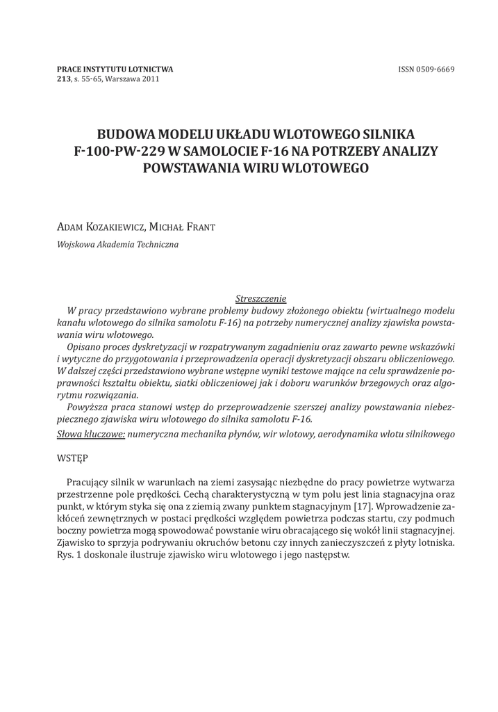 PRACE iNSTYTUTU LOTNiCTWA 213, s. 55-65, Warszawa 2011 ISSN 0509-6669 BUDOWA MODELU UKŁADU WLOTOWEGO SiLNiKA F-100-PW-229 W SAMOLOCiE F-16 NA POTRZEBY ANALiZY POWSTAWANiA WiRU WLOTOWEGO AdAm KozAKIeWIcz, mIchAł FrANt Wojskowa Akademia Techniczna Streszczenie W pracy przedstawiono wybrane problemy budowy złożonego obiektu (wirtualnego modelu kanału wlotowego do silnika samolotu F-16) na potrzeby numerycznej analizy zjawiska powstawania wiru wlotowego. Opisano proces dyskretyzacji w rozpatrywanym zagadnieniu oraz zawarto pewne wskazówki i wytyczne do przygotowania i przeprowadzenia operacji dyskretyzacji obszaru obliczeniowego. W dalszej części przedstawiono wybrane wstępne wyniki testowe mające na celu sprawdzenie poprawności kształtu obiektu, siatki obliczeniowej jak i doboru warunków brzegowych oraz algorytmu rozwiązania. Powyższa praca stanowi wstęp do przeprowadzenie szerszej analizy powstawania niebezpiecznego zjawiska wiru wlotowego do silnika samolotu F-16. Słowa kluczowe: numeryczna mechanika płynów, wir wlotowy, aerodynamika wlotu silnikowego WStĘP Pracujący silnik w warunkach na ziemi zasysając niezbędne do pracy powietrze wytwarza przestrzenne pole prędkości. cechą charakterystyczną w tym polu jest linia stagnacyjna oraz punkt, w którym styka się ona z ziemią zwany punktem stagnacyjnym [17]. Wprowadzenie zakłóceń zewnętrznych w postaci prędkości względem powietrza podczas startu, czy podmuch boczny powietrza mogą spowodować powstanie wiru obracającego się wokół linii stagnacyjnej. zjawisko to sprzyja podrywaniu okruchów betonu czy innych zanieczyszczeń z płyty lotniska. rys. 1 doskonale ilustruje zjawisko wiru wlotowego i jego następstw. 56 AdAm KozAKIeWIcz, mIchAł FrANt rys. 1. Wir wlotowy powstały na wlocie do silnika samolotu F-16 (a), uszkodzona sprężarka silnika turbinowego w wyniku zassania ciał obcych przez układ wlotowy silnika (b) Wspólną cechą współczesnych wlotów silnikowych samolotów wielozadaniowych jest dość niskie ich położenie, przykładowo: wlot miG-29 znajduje się na wysokości 90 cm nad powierzchnią lotniska i nawet zastosowanie specjalnych żaluzji wlotowych i wykorzystywanie dodatkowych wlotów na górnej powierzchni kadłuba nie zabezpiecza przed niekorzystnymi zjawiskami zassania „ciał obcych” do kanału silnika. W przypadku samolotu F-16 jest to wysokość rzędu 100 cm. W wyniku czego występuje konieczność prowadzenia badań mających na celu zabezpieczenie silnika przed uszkodzeniami. Jeżeli odwołamy się do danych amerykańskich dotyczących tego samolotu to np. wypadki lotnicze kategorii B (kalectwo ludzi lub straty powyżej 200 tyś. $) związane z zassaniem ciała obcego w roku 1996 wynosiły 5, a w 2001 r. było już ich 38 (wzrost 7 - krotny). zagadnienia dotyczące powstawania wiru wlotowego i zasysania ciał obcych przez turbinowe silniki odrzutowe było analizowane przez polskich pracowników naukowych lecz dotyczyły one wcześniej eksploatowanych statków powietrznych takich jak mig-21, tS-11 Iskra czy samolot Iryda [13¸16]. 1. BudoWA modelu uKłAdu WlotoWeGo Badania numeryczne aerodynamiki (opływu) obiektów niezależnie od metody wymagają budowy wirtualnego obiektu badań oraz budowy siatek obliczeniowych. Na obecnym etapie rozwoju zaawansowanych programów (pakietów) cAd (z ang. computer Aided design – komputerowe wspomaganie projektowania) na ogół wystarczy zbudować jeden obiekt wykorzystywany następnie w całym cyklu procesów projektowych i optymalizacyjnych powstającej konstrukcji. W każdym zagadnieniu badawczym pierwszym czynnikiem warunkującym otrzymanie poprawnego rozwiązania jest dokładne odwzorowanie geometrii badanego obiektu. Proces budowy wirtualnego modelu wlotu samolotu F-16, zwany także modelowaniem bryłowym, podzielić można na kilka etapów i są nimi: - przygotowanie wszystkich niezbędnych danych geometrycznych modelowanego obiektu; - ocena dopuszczalności i możliwości uproszczenia obiektu do badań numerycznych; - wprowadzenie niezbędnych punktów geometrycznych oraz krawędzi na których rozpostarte zostają płaszczyzny (płaszczyzny obrysu zewnętrznego lub płaszczyzny przekroju); - budowa obiektu 3d. Niestety, zawarte w pakiecie Fluent [1] oprogramowanie do budowy wirtualnych obiektów badań (Gambit) umożliwia jedynie budowę prostych obiektów 3d. W programie Gambit do- BudoWA modelu uKłAdu WlotoWeGo SIlNIKA F-100-PW-229... 57 stępne są jedynie podstawowe funkcje programowe modelowania 3d. Brak jest możliwości budowy obiektów bardziej skomplikowanych. dlatego w przypadku bardziej skomplikowanych obiektów często niezbędne jest zastosowanie specjalizowanego oprogramowania cAd. W niniejszej pracy do tych celów użyto specjalizowanych pakietów unigraphics oraz Solid edge. Budowa wirtualnego modelu samolotu F-16 była zadaniem niezmiernie trudnym. Problem wystąpił już na wstępie, ponieważ okazało się, iż trudno o zebranie szczegółowych danych geometrycznych obiektu. Wszystkie więc niezbędne dane w zakresie wymiarów obiektu warunkujące rozpoczęcie procesu budowy wirtualnego modelu tego samolotu, uzyskano na podstawie procesu trójwymiarowego skanowania rzeczywistego obiektu, przeglądu dostępnej literatury [2], [3], [4], planów modelarskich oraz dokładnych zdjęć. Na podstawie tych samych materiałów źródłowych zbudowany był również model do badań tunelowych. Podobnie jak w budowie modelu do badań doświadczalnych również w tym procesie budowy nie odtwarzano niektórych elementów obiektu takich jak: osłona anteny w górnej części usterzenia pionowego, osłony działka itp. które nie mają wpływu na wyniki badań, które będą przeprowadzone. Proces budowy wirtualnego modelu wlotu samolotu F-16, z uwagi na jego skomplikowany układ aerodynamiczny został podzielony na etapy: budowano poszczególne elementy by później zbudować z nich model bryłowy samolotu. Przykładowe e
