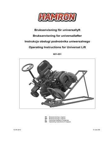 Bruksanvisning för universallyft Bruksanvisning for universalløfter Instrukcja obsługi podnośnika uniwersalnego Operating Instructions for Universal Lift 601-051 SV NO PL EN 12.06.2012 Bruksanvisning i original Bruksanvisning i original Instrukcja obsługi w oryginale Operating instructions in original © Jula AB SVENSKA SVENSK A SÄKERHETSANVISNINGAR Läs bruksanvisningen noggrant innan användning! Spara bruksanvisningen för framtida referens. Överbelasta aldrig produkten. Använd produkten endast på plant och hårt underlag. Produkten är endast avsedd för lyft. Palla omedelbart lasten efter lyft. Försök aldrig flytta lasten när den vilar på produkten. Om inte alla anvisningar och säkerhetsanvisningar följs finns risk för personskada och/eller egendomsskada. Använd endast avsedda lyftpunkter. Vistas aldrig under upplyft last. Ändra aldrig produkten på något sätt. Använd aldrig produkten om den är skadad eller sliten eller inte fungerar normalt. Lämna den till behörig servicerepresentant för kontroll och eventuell reparation. Ändra aldrig produkten på något sätt. Använd endast tillbehör som rekommenderas av tillverkaren. Kontroll Kontrollera produkten före varje användning med avseende på sprickor i svetsfogar samt skadade, lösa, slitna eller saknade delar. Utför övriga kontroller i enlighet med anvisningarna. Kontrollera omedelbart produkten om den utsatts för överbelastning eller slag. Eventuella reparationer ska utföras av behörig servicerepresentant eller annan kvalificerad personal, som använder identiska reservdelar. Före varje användning Kontrollera produkten före varje användning med avseende på sprickor i svetsfogar samt skadade, lösa, slitna eller saknade delar. Håll andra personer, i synnerhet barn, och husdjur på säkert avstånd från arbetsområdet. Använd inte produkten om den inte är ren och fungerar korrekt. Använd produkten endast på stabilt, plant och horisontellt underlag TEKNISKA DATA Max lastkapacitet Max lyfthöjd 300 kg 85 cm HANDHAVANDE OBS! Luft i hydraulsystemet kan försämra lyftens prestanda. Avluftning 1. 2. 3. 4. Vrid avlastningsventilen moturs högst 2 varv. Skruva långsamt ut oljepåfyllningspluggen. Pumpa snabbt pedalen flera gånger med hela slaglängden. Upprepa, om så behövs. Dra åt oljepåfyllningspluggen efter avslutad avluftning. Uppställning Placera lyften på den sida av maskinen där luftfiltret inte sitter. Slå av tändningen och avlägsna tändningsnyckeln. Demontera gräsuppsamlaren. Placera lyften bakom åkmaskinens bakhjul. Dra ut lyftramen. Placera åkmaskinen över lyftramen. Ansätt åkmaskinens parkeringsbroms. Framhjulen ska vara vända mot lyftmekanismen. 2 SVENSKA Lyftning 1. 2. 3. 4. Lås ett bakhjul vid lyftramsbygeln med ett spännband (ingår inte). Trampa 10–15 gånger på pedalen för att lyfta maskinen. Fortsätt trampa på pedalen tills säkerhetsanordningen löser ut. Placera säkerhetsstaget mellan lyftramen och basens ram. Sänkning 1. 2. 3. 4. Kontrollera att inga verktyg eller andra föremål finns under åkmaskinen. Trampa 2–3 gånger på pedalen och avlägsna säkerhetsstaget. Vrid spärren uppåt och öppna långsamt avlastningsventilen moturs tills lasten börjar sänkas. Låt lasten sänkas ned helt. Lossa remmen runt bakhjulet och avlägsna åkmaskinen från lyften. UNDERHÅLL Produkten ska underhållas i enlighet med anvisningarna. När produkten inte används ska den förvaras i helt nedsänkt läge. Håll produkten ren och dess rörliga delar rena. Smörj produkten var 3:e månad. Förvaring Tryck in lyftramen till basramen. Lyft produkten i handtaget och flytta den till förvaringsstället med hjälp av rullarna. Sätt i säkerhetsspärren och häng upp produkten. Förvara produkten skyddat. Håll produkten ren och smord. FELSÖKNING PROBLEM Domkraften sänks inte helt. Lasten sjunker. Domkraften når inte sin högsta höjd. Långsam lyftning. Lasten lyfts inte. ORSAK Luft i hydraulsystemet. Avlastningsventilen har fastnat. Avlastningsventilen öppen. För låg oljenivå. Luft i hydraulsystemet. Luft i hydraulsystemet. Förorenad olja. Avlastningsventilen är inte helt stängd. För tung last. Avlastningsventilen öppen. För låg oljenivå. 3 ÅTGÄRD Avlufta hydraulsystemet. Avlasta systemet och rengör ventilen. Stäng avlastningsventilen ordentligt. Fyll på till rätt nivå. Avlufta hydraulsystemet. Avlufta hydraulsystemet. Byt olja (använd kvalitet SAE W5). Stäng avlastningsventilen ordentligt. Minska belastningen eller använd en domkraft med större lyftkapacitet. Stäng ventilen moturs. Fyll på till rätt nivå. SVENSKA SPRÄNGSKISS Rätten till ändringar förbehålles. Vid eventuella problem, kontakta vår serviceavdelning på telefon 0200-88 55 88. Jula AB, Box 363, 532 24 SKARA www.jula.se 4 NORSK NORSK SIKKERHETSANVISNINGER Les bruksanvisningen nøye før bruk! Ta vare på bruksanvisningen for fremtidig bruk. Produktet må aldri overbelastes. Plasser alltid produktet på et jevnt og hardt underlag. Produktet er kun beregnet på løfting. Støtt alltid lasten etter løft. Forsøk aldri å flytte lasten når den hviler på produktet. Hvis ikke alle anvisninger og sikkerhetsanvisninger følges, er det fare for personskade og/eller skade på eiendom. Bruk løftepunkter egnet til formålet. Opphold deg aldri under løftet last. Ikke foreta endringer på produktet. Ikke bruk produktet hvis det er skadet eller slitt eller ikke fungerer normalt. Lever det til en autorisert servicerepresentant for kontroll og eventuell reparasjon. Ikke foreta endringer på produktet. Bruk kun tilbehør som anbefales av produsenten. Kontroll Kontroller produktet for sprekker i sveisefuger samt skadde, løse, slitte eller manglende deler før hver gangs bruk. Utfør øvrige kontroller i henhold til disse anvisningene. Produktet må kontrolleres med en gang hvis det utsettes for overbelastning eller slag. Eventuelle reparasjoner skal utføres av godkjent se