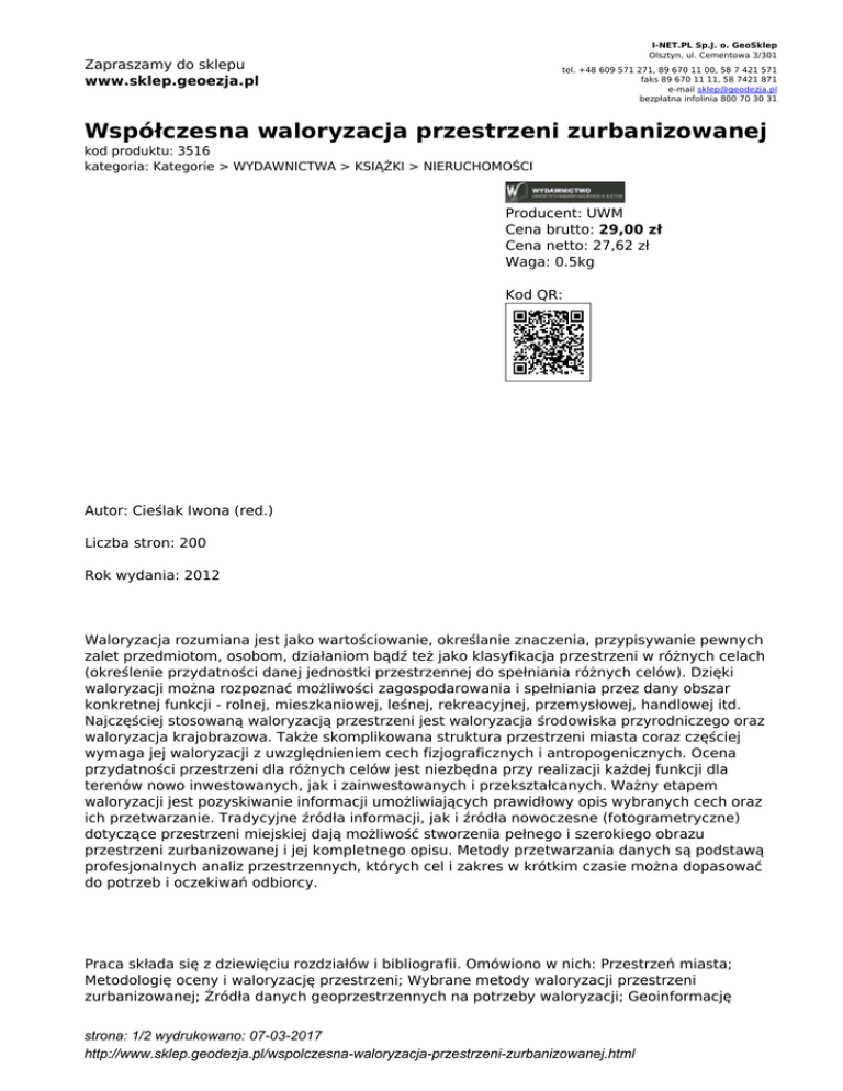I-NET.PL Sp.J. o. GeoSklep Olsztyn, ul. Cementowa 3/301 Zapraszamy do sklepu www.sklep.geoezja.pl tel. +48 609 571 271, 89 670 11 00, 58 7 421 571 faks 89 670 11 11, 58 7421 871 e-mail [email protected] bezpłatna infolinia 800 70 30 31 Współczesna waloryzacja przestrzeni zurbanizowanej kod produktu: 3516 kategoria: Kategorie > WYDAWNICTWA > KSIĄŻKI > NIERUCHOMOŚCI Producent: UWM Cena brutto: 29,00 zł Cena netto: 27,62 zł Waga: 0.5kg Kod QR: Autor: Cieślak Iwona (red.) Liczba stron: 200 Rok wydania: 2012 Waloryzacja rozumiana jest jako wartościowanie, określanie znaczenia, przypisywanie pewnych zalet przedmiotom, osobom, działaniom bądź też jako klasyfikacja przestrzeni w różnych celach (określenie przydatności danej jednostki przestrzennej do spełniania różnych celów). Dzięki waloryzacji można rozpoznać możliwości zagospodarowania i spełniania przez dany obszar konkretnej funkcji - rolnej, mieszkaniowej, leśnej, rekreacyjnej, przemysłowej, handlowej itd. Najczęściej stosowaną waloryzacją przestrzeni jest waloryzacja środowiska przyrodniczego oraz waloryzacja krajobrazowa. Także skomplikowana struktura przestrzeni miasta coraz częściej wymaga jej waloryzacji z uwzględnieniem cech fizjograficznych i antropogenicznych. Ocena przydatności przestrzeni dla różnych celów jest niezbędna przy realizacji każdej funkcji dla terenów nowo inwestowanych, jak i zainwestowanych i przekształcanych. Ważny etapem waloryzacji jest pozyskiwanie informacji umożliwiających prawidłowy opis wybranych cech oraz ich przetwarzanie. Tradycyjne źródła informacji, jak i źródła nowoczesne (fotogrametryczne) dotyczące przestrzeni miejskiej dają możliwość stworzenia pełnego i szerokiego obrazu przestrzeni zurbanizowanej i jej kompletnego opisu. Metody przetwarzania danych są podstawą profesjonalnych analiz przestrzennych, których cel i zakres w krótkim czasie można dopasować do potrzeb i oczekiwań odbiorcy. Praca składa się z dziewięciu rozdziałów i bibliografii. Omówiono w nich: Przestrzeń miasta; Metodologię oceny i waloryzację przestrzeni; Wybrane metody waloryzacji przestrzeni zurbanizowanej; Źródła danych geoprzestrzennych na potrzeby waloryzacji; Geoinformację strona: 1/2 wydrukowano: 07-03-2017 http://www.sklep.geodezja.pl/wspolczesna-waloryzacja-przestrzeni-zurbanizowanej.html obrazową (fotogrametria i teledetekcja w waloryzacji przestrzeni zurbanizowanej); System informacji geograficznej w ocenie i waloryzacji przestrzeni zurbanizowanej; Waloryzację przestrzeni miejskiej - ocena stanu zagospodarowania miasta; Waloryzację przestrzeni miejskiej ocena jakości użytkowej przestrzeni komunikacyjnej. strona: 2/2 wydrukowano: 07-03-2017 http://www.sklep.geodezja.pl/wspolczesna-waloryzacja-przestrzeni-zurbanizowanej.html