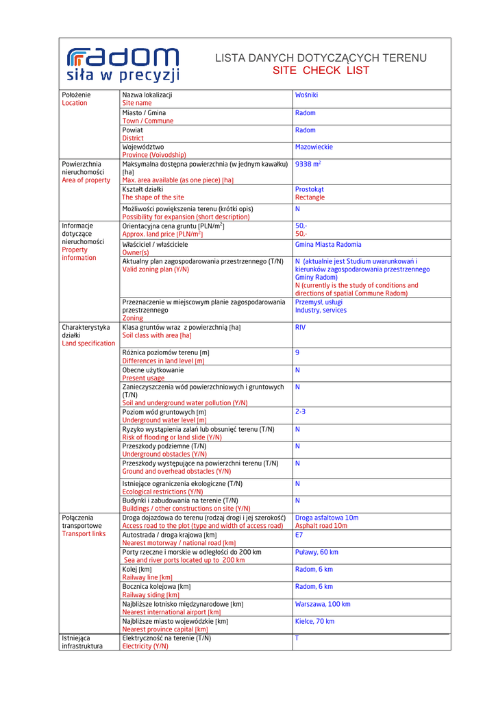 LISTA DANYCH DOTYCZĄCYCH TERENU SITE CHECK LIST Położenie Location Powierzchnia nieruchomości Area of property Informacje dotyczące nieruchomości Property information Charakterystyka działki Land specification Połączenia transportowe Transport links Istniejąca infrastruktura Nazwa lokalizacji Site name Wośniki Miasto / Gmina Town / Commune Powiat District Województwo Province (Voivodship) Maksymalna dostępna powierzchnia (w jednym kawałku) [ha] Max. area available (as one piece) [ha] Kształt działki The shape of the site Radom Możliwości powiększenia terenu (krótki opis) Possibility for expansion (short description) Orientacyjna cena gruntu [PLN/m2] Approx. land price [PLN/m2] N Właściciel / właściciele Owner(s) Aktualny plan zagospodarowania przestrzennego (T/N) Valid zoning plan (Y/N) Gmina Miasta Radomia Przeznaczenie w miejscowym planie zagospodarowania przestrzennego Zoning Klasa gruntów wraz z powierzchnią [ha] Soil class with area [ha] Radom Mazowieckie 9338 m2 Prostokąt Rectangle 50,50,- N (aktualnie jest Studium uwarunkowań i kierunków zagospodarowania przestrzennego Gminy Radom) N (currently is the study of conditions and directions of spatial Commune Radom) Przemysł, usługi Industry, services RIV Różnica poziomów terenu [m] Differences in land level [m] Obecne użytkowanie Present usage Zanieczyszczenia wód powierzchniowych i gruntowych (T/N) Soil and underground water pollution (Y/N) Poziom wód gruntowych [m] Underground water level [m] Ryzyko wystąpienia zalań lub obsunięć terenu (T/N) Risk of flooding or land slide (Y/N) Przeszkody podziemne (T/N) Underground obstacles (Y/N) Przeszkody występujące na powierzchni terenu (T/N) Ground and overhead obstacles (Y/N) 9 Istniejące ograniczenia ekologiczne (T/N) Ecological restrictions (Y/N) Budynki i zabudowania na terenie (T/N) Buildings / other constructions on site (Y/N) Droga dojazdowa do terenu (rodzaj drogi i jej szerokość) Access road to the plot (type and width of access road) Autostrada / droga krajowa [km] Nearest motorway / national road [km] Porty rzeczne i morskie w odległości do 200 km Sea and river ports located up to 200 km Kolej [km] Railway line [km] Bocznica kolejowa [km] Railway siding [km] Najbliższe lotnisko międzynarodowe [km] Nearest international airport [km] Najbliższe miasto wojewódzkie [km] Nearest province capital [km] Elektryczność na terenie (T/N) Electricity (Y/N) N N N 2-3 N N N N Droga asfaltowa 10m Asphalt road 10m E7 Puławy, 60 km Radom, 6 km Radom, 6 km Warszawa, 100 km Kielce, 70 km T Existing infrastructure Odległość przyłącza od granicy terenu Connection point (distance from boundary) [m] Napięcie Voltage [kV] Dostępna moc Available capacity [MW] Gaz na terenie (T/N) Gas (Y/N) Odległość przyłącza od granicy działki Connection point (distance from boundary) [m] Wartość kaloryczna Calorific value [MJ/Nm3] Średnica rury Pipe diameter [mm] Dostępna objętość Available capacity [Nm3/h] Woda na terenie (T/N) Water supply (Y/N) Odległość przyłącza od granicy teren Connection point (distance from boundary) [m] Dostępna objętość Available capacity [m3/24h] Kanalizacja na terenie (T/N) Sewage discharge (Y/N) Odległość przyłącza od granicy teren Connection point (distance from boundary) [m] Dostępna objętość Available capacity [m3/24h] Oczyszczalnia ścieków na terenie bądź w bezpośrednim sąsiedztwie Treatment plant (Y/N) 15 kV 2 MW T 34,43 MJ/m3 34,43 MJ/m3 125 800 T 1500 Ø 160 T Y 8 000 Tak 12 km na północ Yes 12 km to North Uwagi Comments Osoba przygotowująca ofertę Offer prepared by Osoby do kontaktu Contact person Zbigniew Krzesimowski, Kierownik w Wydziale Obsługi Radomskiej Strefy Gospodarczej, [email protected],+48 (48) 36 20 538 +48 48 600 166 144 Zbigniew Krzesimowski, Kierownik w Wydziale Obsługi Radomskiej Strefy Gospodarczej, [email protected],+48 (48) 36 20 538 +48 48 600 166 144