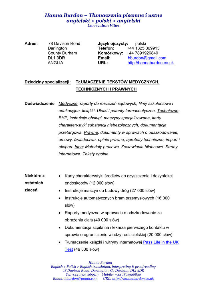Hanna Burdon – Tłumaczenia pisemne i ustne angielski > polski > angielski Curriculum Vitae Adres: 78 Davison Road Darlington County Durham DL1 3DR ANGLIA Dziedziny specjalizacji: Język ojczysty: polski Telefon: +44 1325 369913 Komórkowy: +44 7891926840 Email: [email protected] URL: http://hannaburdon.co.uk TŁUMACZENIE TEKSTÓW MEDYCZNYCH, TECHNICZNYCH I PRAWNYCH Doświadczenie Medyczne: raporty do roszczeń sądowych, filmy szkoleniowe i edukacyjne, książki. Ulotki i patenty farmaceutyczne. Techniczne: BHP, instrukcje obsługi, maszyny specjalizowane, karty charakterystyki substancji niebezpiecznych, dokumentacja przetargowa. Prawne: dokumenty w sprawach o odszkodowanie, umowy, świadectwa, opinie prawne, aprobaty techniczne, import i eksport. Inne: Materiały prasowe. Zestawienia bilansowe. Strony internetowe. Teksty ogólne. Niektóre z endoskopów (12 000 słów) ostatnich zleceń Karty charakterystyki środków do czyszczenia i dezynfekcji Instrukcje maszyn do budowy dróg (27 000 słów) Instrukcje automatycznych bram przemysłowych (16 000 słów) Raporty medyczne w sprawach o odszkodowanie za obrażenia ciała (40 000 słów) Dokumentacja szpitalna i lekarza pierwszego kontaktu w sprawie o ograniczenie władzy rodzicielskiej (20 000 słów) Tłumaczenie książki i witryny internetowej Pass Life in the UK Test (46 500 słów) Hanna Burdon English > Polish > English translation, interpreting & proofreading 78 Davison Road, Darlington, Co Durham, DL1 3DR Tel: +44 1325 369913 Mobile: +44 7891926840 Email: [email protected] URL: http://hannaburdon.co.uk Hanna Burdon – Tłumaczenia pisemne i ustne angielski > polski > angielski Curriculum Vitae Tłumaczenie brytyjskiego kodeksu drogowego (25 000 słów); książki i witryny internetowej Successful Driver (34 000 słów); nagranie narracji do filmów znajdujących się w witrynie Pliki pomocy do Guide – programu dla niewidomych i niedowidzących użytkowników komputerów (51 000 słów) Systemy bezpieczeństwa morskiego (11 000 słów) Leczenie udarów niedokrwiennych – badania kliniczne (5000 słów) Książki 2006 Wydawnictwo Rebis, Poznań “Dziecko. Pielęgnacja i wychowanie” (Benjamin Spock i Robert Needlman) 2004 Wydawnictwo Rebis, Poznań “Mówienie, słuchanie, kontakt” (Paul M. Rosen) 2003 Wydawnictwo Arlekin, Warszawa “Ucieczka z raju” (Rebecca Winters) 2002 Wydawnictwo Rebis, Poznań “Zacznij działać” (Susan Bixler i Lisa Scherrer) 2001 Wydawnictwo Rebis, Poznań “Dziecko” (Benjamin Spock i Steven J. Parker) 2000 Wydawnictwo Rebis, Poznań “Pozytywna dyscyplina” (Jane Nelsen); “Tai Chi” (Lam Kam Chuen) Tłumaczenia Tłumaczenia telefoniczne dla policji oraz szpitali i innych ustne placówek medycznych (w Wielkiej Brytanii i Stanach Zjednoczonych); tłumaczenia podczas spotkań biznesowych, targów międzynarodowych, warsztatów, w urzędach pracy, więzieniach, podczas egzaminów BHP itp. Hanna Burdon English > Polish > English translation, interpreting & proofreading 78 Davison Road, Darlington, Co Durham, DL1 3DR Tel: +44 1325 369913 Mobile: +44 7891926840 Email: [email protected] URL: http://hannaburdon.co.uk Hanna Burdon – Tłumaczenia pisemne i ustne angielski > polski > angielski Curriculum Vitae Wykształcenie 1995 – 2000 Uniwersytet Adama Mickiewicza w Poznaniu tytuł magistra filologii angielskiej, specjalizacja: tłumaczenie konferencyjne stypendium Unii Europejskiej w ramach programu TEMPUS: nauka w Northampton University, Wielka Brytania (kwiecień – lipiec 1998); Universidade de Aveiro, Portugalia (wrzesień 1998); Universität Wien, Austria (listopad 1999) 1999 – 2000 Uczestnictwo w projekcie naukowym Wydziału Informatyki Uniwersytetu Adama Mickiewicza: budowa systemu tłumaczenia maszynowego POLENG. Publikacja artykułu The Importance of Corpus Analysis for the Construction of an MT System w "Speech and Language Technology. Volume 4", Poznań 2000 Programy SDL Trados 2007 Suite (Workbench, TagEditor, MultiTerm), MS Office 2007 (Word, Excel) Hanna Burdon English > Polish > English translation, interpreting & proofreading 78 Davison Road, Darlington, Co Durham, DL1 3DR Tel: +44 1325 369913 Mobile: +44 7891926840 Email: [email protected] URL: http://hannaburdon.co.uk