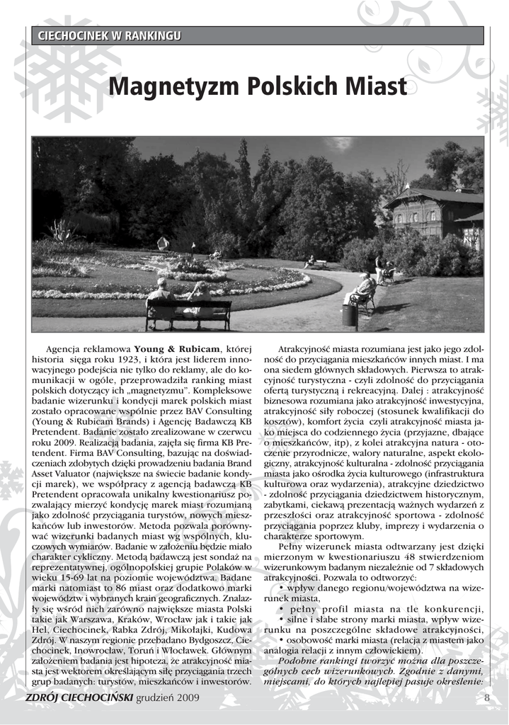 CIECHOCINEK W RANKINGU Magnetyzm Polskich Miast Agencja reklamowa Young & Rubicam, której historia si´ga roku 1923, i która jest liderem innowacyjnego podejÊcia nie tylko do reklamy, ale do komunikacji w ogóle, przeprowadzi∏a ranking miast polskich dotyczàcy ich „magnetyzmu”. Kompleksowe badanie wizerunku i kondycji marek polskich miast zosta∏o opracowane wspólnie przez BAV Consulting (Young & Rubicam Brands) i Agencj´ Badawczà KB Pretendent. Badanie zosta∏o zrealizowane w czerwcu roku 2009. Realizacjà badania, zaj´∏a si´ firma KB Pretendent. Firma BAV Consulting, bazujàc na doÊwiadczeniach zdobytych dzi´ki prowadzeniu badania Brand Asset Valuator (najwi´ksze na Êwiecie badanie kondycji marek), we wspó∏pracy z agencjà badawczà KB Pretendent opracowa∏a unikalny kwestionariusz pozwalajàcy mierzyç kondycj´ marek miast rozumianà jako zdolnoÊç przyciàgania turystów, nowych mieszkaƒców lub inwestorów. Metoda pozwala porównywaç wizerunki badanych miast wg wspólnych, kluczowych wymiarów. Badanie w za∏o˝eniu b´dzie mia∏o charakter cykliczny. Metodà badawczà jest sonda˝ na reprezentatywnej, ogólnopolskiej grupie Polaków w wieku 15-69 lat na poziomie województwa. Badane marki natomiast to 86 miast oraz dodatkowo marki województw i wybranych krain geograficznych. Znalaz∏y si´ wÊród nich zarówno najwi´ksze miasta Polski takie jak Warszawa, Kraków, Wroc∏aw jak i takie jak Hel, Ciechocinek, Rabka Zdrój, Miko∏ajki, Kudowa Zdrój. W naszym regionie przebadano Bydgoszcz, Ciechocinek, Inowroc∏aw, Toruƒ i W∏oc∏awek. G∏ównym za∏o˝eniem badania jest hipoteza, ˝e atrakcyjnoÊç miasta jest wektorem okreÊlajàcym si∏´ przyciàgania trzech grup badanych: turystów, mieszkaƒców i inwestorów. ZDRÓJ CIECHOCI¡SKI grudzieƒ 2009 AtrakcyjnoÊç miasta rozumiana jest jako jego zdolnoÊç do przyciàgania mieszkaƒców innych miast. I ma ona siedem g∏ównych sk∏adowych. Pierwsza to atrakcyjnoÊç turystyczna - czyli zdolnoÊç do przyciàgania ofertà turystycznà i rekreacyjnà. Dalej : atrakcyjnoÊç biznesowa rozumiana jako atrakcyjnoÊç inwestycyjna, atrakcyjnoÊç si∏y roboczej (stosunek kwalifikacji do kosztów), komfort ˝ycia czyli atrakcyjnoÊç miasta jako miejsca do codziennego ˝ycia (przyjazne, dbajàce o mieszkaƒców, itp), z kolei atrakcyjna natura - otoczenie przyrodnicze, walory naturalne, aspekt ekologiczny, atrakcyjnoÊç kulturalna - zdolnoÊç przyciàgania miasta jako oÊrodka ˝ycia kulturowego (infrastruktura kulturowa oraz wydarzenia), atrakcyjne dziedzictwo - zdolnoÊç przyciàgania dziedzictwem historycznym, zabytkami, ciekawà prezentacjà wa˝nych wydarzeƒ z przesz∏oÊci oraz atrakcyjnoÊç sportowa - zdolnoÊç przyciàgania poprzez kluby, imprezy i wydarzenia o charakterze sportowym. Pe∏ny wizerunek miasta odtwarzany jest dzi´ki mierzonym w kwestionariuszu 48 stwierdzeniom wizerunkowym badanym niezale˝nie od 7 sk∏adowych atrakcyjnoÊci. Pozwala to odtworzyç: • wp∏yw danego regionu/województwa na wizerunek miasta, • pe∏ny profil miasta na tle konkurencji, • silne i s∏abe strony marki miasta, wp∏yw wizerunku na poszczególne sk∏adowe atrakcyjnoÊci, • osobowoÊç marki miasta (relacja z miastem jako analogia relacji z innym cz∏owiekiem). Podobne rankingi tworzyç mo˝na dla poszczególnych cech wizerunkowych. Zgodnie z danymi, miejscami, do których najlepiej pasuje okreÊlenie: 8