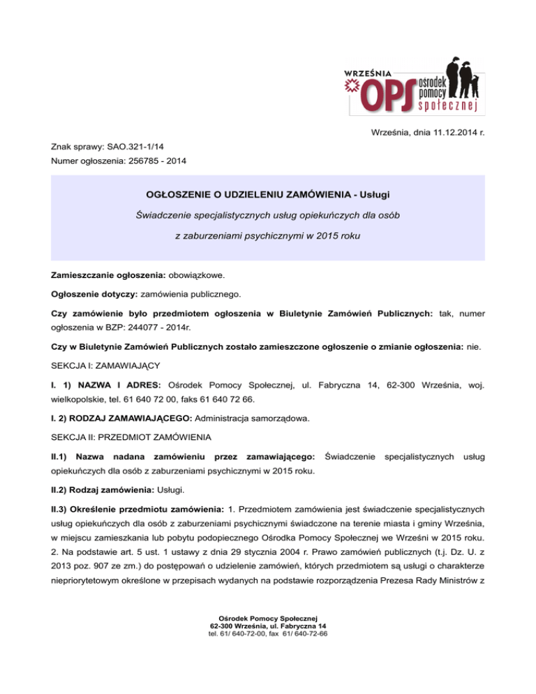 Września, dnia 11.12.2014 r. Znak sprawy: SAO.321-1/14 Numer ogłoszenia: 256785 - 2014 OGŁOSZENIE O UDZIELENIU ZAMÓWIENIA - Usługi Świadczenie specjalistycznych usług opiekuńczych dla osób z zaburzeniami psychicznymi w 2015 roku Zamieszczanie ogłoszenia: obowiązkowe. Ogłoszenie dotyczy: zamówienia publicznego. Czy zamówienie było przedmiotem ogłoszenia w Biuletynie Zamówień Publicznych: tak, numer ogłoszenia w BZP: 244077 - 2014r. Czy w Biuletynie Zamówień Publicznych zostało zamieszczone ogłoszenie o zmianie ogłoszenia: nie. SEKCJA I: ZAMAWIAJĄCY I. 1) NAZWA I ADRES: Ośrodek Pomocy Społecznej, ul. Fabryczna 14, 62-300 Września, woj. wielkopolskie, tel. 61 640 72 00, faks 61 640 72 66. I. 2) RODZAJ ZAMAWIAJĄCEGO: Administracja samorządowa. SEKCJA II: PRZEDMIOT ZAMÓWIENIA II.1) Nazwa nadana zamówieniu przez zamawiającego: Świadczenie specjalistycznych usług opiekuńczych dla osób z zaburzeniami psychicznymi w 2015 roku. II.2) Rodzaj zamówienia: Usługi. II.3) Określenie przedmiotu zamówienia: 1. Przedmiotem zamówienia jest świadczenie specjalistycznych usług opiekuńczych dla osób z zaburzeniami psychicznymi świadczone na terenie miasta i gminy Września, w miejscu zamieszkania lub pobytu podopiecznego Ośrodka Pomocy Społecznej we Wrześni w 2015 roku. 2. Na podstawie art. 5 ust. 1 ustawy z dnia 29 stycznia 2004 r. Prawo zamówień publicznych (t.j. Dz. U. z 2013 poz. 907 ze zm.) do postępowań o udzielenie zamówień, których przedmiotem są usługi o charakterze niepriorytetowym określone w przepisach wydanych na podstawie rozporządzenia Prezesa Rady Ministrów z Ośrodek Pomocy Społecznej 62-300 Września, ul. Fabryczna 14 tel. 61/ 640-72-00, fax 61/ 640-72-66 dnia 28 stycznia 2010 r. w sprawie wykazu usług o charakterze priorytetowym i niepriorytetowym, nie stosuje się przepisów ustawy dotyczących zakazu ustalania kryteriów oceny ofert na podstawie właściwości wykonawcy. 3. Specjalistyczne usługi opiekuńcze dla osób z zaburzeniami psychicznymi dostosowane są do szczególnych potrzeb, wynikających z rodzaju schorzenia lub niepełnosprawności. Wyodrębniono następujące rodzaje specjalistycznych usług opiekuńczych dla osób z zaburzeniami psychicznymi: 1) Uczenie i rozwijanie umiejętności niezbędnych do samodzielnego życia, w tym zwłaszcza: a) kształtowanie umiejętności zaspokajania podstawowych potrzeb życiowych i umiejętności społecznego funkcjonowania, motywowanie do aktywności, leczenia i rehabilitacji, prowadzenie treningów umiejętności samoobsługi i umiejętności społecznych oraz wspieranie, także w formie asystowania w codziennych czynnościach życiowych, w szczególności takich jak: samoobsługa, zwłaszcza wykonywanie czynności gospodarczych i porządkowych, w tym umiejętność utrzymania i prowadzenia domu, dbałość o higienę i wygląd, utrzymywanie kontaktów z domownikami, rówieśnikami w miejscu nauki i pracy oraz ze społecznością lokalną, wspólne organizowanie i spędzanie czasu wolnego, korzystanie z usług różnych instytucji, b) interwencje i pomoc w życiu w rodzinie, w tym: pomoc w radzeniu sobie w sytuacjach kryzysowych poradnictwo specjalistyczne, interwencje kryzysowe, wsparcie psychologiczne, rozmowy terapeutyczne, ułatwienie dostępu do edukacji i kultury, doradztwo, koordynacja działań innych służb na rzecz rodziny, której członkiem jest osoba uzyskująca pomoc w formie specjalistycznych usług, kształtowanie pozytywnych relacji osoby wspieranej z osobami bliskimi, współpraca z rodziną - kształtowanie odpowiednich postaw wobec osoby chorującej, niepełnosprawnej, c) pomoc w załatwianiu spraw urzędowych, w tym: w uzyskaniu świadczeń socjalnych, emerytalno-rentowych, w wypełnianiu dokumentów urzędowych, d) wspieranie i pomoc w uzyskaniu zatrudnienia, w tym zwłaszcza: w szukaniu informacji o pracy, pomoc w znalezieniu zatrudnienia lub alternatywnego zajęcia w szczególności uczestnictwo w zajęciach warsztatów terapii zajęciowej, zakładach aktywności zawodowej, środowiskowych domach samopomocy, centrach i klubach integracji społecznej, klubach pracy, w kompletowaniu dokumentów potrzebnych do zatrudnienia, w przygotowaniu do rozmowy z pracodawcą, wspieranie i asystowanie w kontaktach z pracodawcą, w rozwiązywaniu problemów psychicznych wynikających z pracy lub jej braku, e) pomoc w gospodarowaniu pieniędzmi, w tym: nauka planowania budżetu, asystowanie przy ponoszeniu wydatków, pomoc w uzyskaniu ulg w opłatach, zwiększenie umiejętności gospodarowania własnym budżetem oraz usamodzielnianie finansowe. 2) Pielęgnacja - jako wspieranie procesu leczenia, w tym: a) pomoc w dostępie do świadczeń zdrowotnych, b) uzgadnianie i pilnowanie terminów wizyt lekarskich, badań diagnostycznych, c) pomoc w wykupywaniu lub zamawianiu leków w aptece, d) współpraca ze specjalistami w zakresie wspierania psychologiczno-pedagogicznego i edukacyjno-terapeutycznego zmierzającego do wielostronnej aktywizacji osoby korzystającej ze specjalistycznych usług. 3) Pomoc mieszkaniowa, w tym: a) w uzyskaniu mieszkania, negocjowaniu i wnoszeniu opłat, b) w organizacji drobnych remontów, adaptacji, napraw, likwidacji barier architektonicznych, c)kształtowanie właściwych relacji osoby uzyskującej pomoc z sąsiadami i gospodarzem domu. 4) Zapewnienie dzieciom i młodzieży z zaburzeniami psychicznymi dostępu do zajęć rehabilitacyjnych i rewalidacyjno-wychowawczych, w wyjątkowych przypadkach, jeżeli nie mają możliwości uzyskania dostępu do zajęć, o których mowa w art.7 ustawy z dnia 19 sierpnia 1994 r. o ochronie zdrowia psychicznego (t.j. Dz. Ośrodek Pomocy Społecznej 62-300 Września, ul. Fabryczna 14 tel. 61/ 640-72-00, fax 61/ 640-72-66 U. z 2011 r. nr 231, poz. 1375 ze zm.). 4. Specjalistyczne usługi opiekuńcze mogą być świadczone tylko przez osoby posiadające kwalifikacje do wykonywania zawodu: psychologa, pedagoga, l