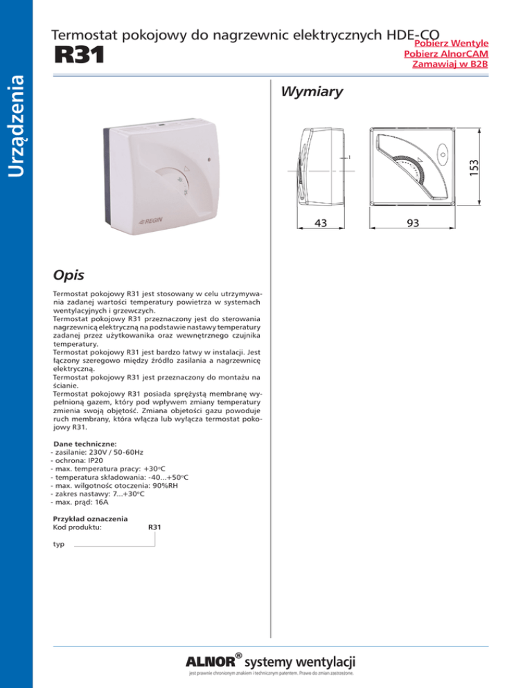 Termostat pokojowy do nagrzewnic elektrycznych HDE-CO Pobierz Wentyle R31 Urządzenia Pobierz AlnorCAM Zamawiaj w B2B Wymiary 153 1 80 44 43 Opis Termostat pokojowy R31 jest stosowany w celu utrzymywania zadanej wartości temperatury powietrza w systemach wentylacyjnych i grzewczych. Termostat pokojowy R31 przeznaczony jest do sterowania nagrzewnicą elektryczną na podstawie nastawy temperatury zadanej przez użytkowanika oraz wewnętrznego czujnika temperatury. Termostat pokojowy R31 jest bardzo łatwy w instalacji. Jest łączony szeregowo między źródło zasilania a nagrzewnicę elektryczną. Termostat pokojowy R31 jest przeznaczony do montażu na ścianie. Termostat pokojowy R31 posiada sprężystą membranę wypełnioną gazem, który pod wpływem zmiany temperatury zmienia swoją objętość. Zmiana objetości gazu powoduje ruch membrany, która włącza lub wyłącza termostat pokojowy R31. Dane techniczne: - zasilanie: 230V / 50-60Hz - ochrona: IP20 - max. temperatura pracy: +30oC - temperatura składowania: -40...+50oC - max. wilgotnośc otoczenia: 90%RH - zakres nastawy: 7...+30oC - max. prąd: 16A Przykład oznaczenia Kod produktu: R31 typ ALNOR® systemy wentylacji jest prawnie chronionym znakiem i technicznym patentem. Prawo do zmian zastrzeżone. 80 93 Termostat pokojowy do nagrzewnic elektrycznych HDE-CO Pobierz Wentyle R31 Pobierz AlnorCAM Zamawiaj w B2B Podłączenie termostatu pokojowego R31 z nagrzewnicą elektryczną HDE-CO ALNOR® systemy wentylacji jest prawnie chronionym znakiem i technicznym patentem. Prawo do zmian zastrzeżone. Urządzenia Schemat połączeń