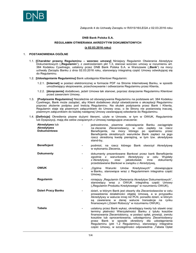 Załącznik 4 do Uchwały Zarządu nr R/015/16/LEGA z 02.03.2016 roku DNB Bank Polska S.A. REGULAMIN OTWIERANIA AKREDYTYW DOKUMENTOWYCH (z 02.03.2016 roku) 1. POSTANOWIENIA OGÓLNE 1.1. [Charakter prawny Regulaminu – wzorzec umowy] Niniejszy Regulamin Otwierania Akredytyw Dokumentowych („Regulamin”), z zastrzeżeniem pkt 1.3, stanowi wzorzec umowy w rozumieniu art. 384 Kodeksu Cywilnego, ustalony przez DNB Bank Polska S.A. w Warszawie („Bank”) na mocy uchwały Zarządu Banku z dnia 02.03.2016 roku, stanowiący integralną część Umowy odwołującej się do Regulaminu. 1.2. [Udostępnianie Regulaminu] Bank udostępnia Klientowi Regulamin: 1.2.1. [Internet] w postaci elektronicznej w formacie PDF na Stronie Internetowej Banku, w sposób umożliwiający skopiowanie, przechowywanie i odtwarzanie Regulaminu przez Klienta, 1.2.2. [doręczenie] dodatkowo, jeżeli Umowa tak stanowi, poprzez doręczenie Regulaminu Klientowi przed zawarciem Umowy. 1.3. [Podpisanie Regulaminu] Niezależnie od obowiązywania Regulaminu na podstawie art. 384 Kodeksu Cywilnego, Bank może zażądać, aby Klient dodatkowo złożył oświadczenie o akceptacji Regulaminu poprzez złożenie podpisu pod treścią Regulaminu. Na skutek podpisania przez Bank i Klienta, Regulamin staje się pisemnym załącznikiem do Umowy oraz, o ile Strony nie postanowią inaczej, pisemnym załącznikiem do każdej następnej Umowy zawierającej odwołanie do Regulaminu. 1.4. [Definicje] Określenia pisane dużymi literami, użyte w Umowie, w tym w OWUK, Regulaminie lub Dyspozycji, mają dla celów związanych z Umową następujące znaczenie: Akredytywa lub Akredytywa Dokumentowa - jednostronne, pisemne zobowiązanie Banku zaciągnięte na zlecenie Zleceniodawcy, w celu zapłaty na rzecz Beneficjenta, na mocy którego po spełnieniu przez Beneficjenta określonych warunków Bank zapłaci na jego rzecz określoną kwotę pieniężną, w tym tzw. akredytywa stand-by, Beneficjent - podmiot, na rzecz którego Bank otworzył Akredytywę w wykonaniu Zlecenia, Dokumenty - dokumenty prezentowane Bankowi przez bank Beneficjenta zgodnie z warunkami Akredytywy w celu Wypłaty z Akredytywy, oraz jakiekolwiek inne dokumenty przedstawiane Bankowi w związku z Akredytywą, OWUK - „Ogólne Warunki Umów Kredytowych” obowiązujące w Banku, stanowiące wraz z Regulaminem integralna część Umowy, Regulamin - niniejszy „Regulamin Otwierania Akredytyw Dokumentowych”, stanowiący wraz z OWUK integralną część Umowy („Regulamin Produktu Kredytowego” w rozumieniu OWUK), Dzień Pracy Banku - dzień, w którym Bank jest otwarty dla Zleceniodawców w celu prowadzenia działalności objętej Umową, a w przypadku Akredytywy w walucie innej niż PLN, ponadto dzień, w którym są zawierane w danej walucie transakcje na rynku finansowym („Dzień Roboczy” w rozumieniu OWUK), Tabela - ustalony przez Bank wykaz, określający kwoty lub stawki oraz terminy płatności Wierzytelności Banku z tytułu kosztów finansowania Zleceniobiorcy, w postaci opłat, prowizji, zwrotu kosztów lub oprocentowania, udostępniony Zleceniodawcy przez Bank w sposób określony dla udostępnienia Regulaminu (pkt 1.2 Regulaminu), stanowiący integralna część Umowy, w szczególności odpowiednia „Tabela Opłat 1/4 i Prowizji”, 2. Waluta Akredytywy - waluta określona w Akredytywie, w której wyrażona jest kwota zobowiązania Banku wobec Beneficjenta („Waluta Produktu Kredytowego” w rozumieniu OWUK), Wypłata lub Wypłata z Akredytywy - spełnienie przez Bank świadczenia pieniężnego na rzecz Beneficjenta, do którego Bank jest zobowiązany na mocy otwarcia Akredytywy, Zlecenie lub Zlecenie Otwarcia Akredytywy - Dyspozycja złożona przez Zleceniodawcę, wskazująca istotne postanowienia Akredytywy, której otwarcie Zleceniodawca zlecił Bankowi, Zlecenie Samodzielne - Zlecenie, o którym mowa w pkt 2.1.2 Regulaminu, Zlecenie w Ramach Limitu - Zlecenie, o którym mowa w pkt 2.1.1 Regulaminu, Zleceniodawca - podmiot na zlecenie którego Bank otworzył Akredytywę na podstawie Umowy („Klient” w rozumieniu OWUK). OTWARCIE AKREDYTYWY 2.1. [Zlecenie] Bank otwiera Akredytywę na podstawie zaakceptowanego przez Bank Zlecenia i na warunkach określonych w takim Zleceniu, przy czym Zlecenie może być złożone: 2.1.1. [Zlecenie w Ramach Limitu] w ramach uprzednio zawartej pomiędzy Stronami Umowy, na podstawie której, Bank udzielił Zleceniodawcy Limitu, który może być wykorzystywany w formie Akredytyw, w szczególności w ramach Umowy o Limit Kredytowy; w takim przypadku Zlecenie może być złożone: 2.1.1.1. [pismo] przez złożenie w Banku Zlecenia na piśmie, lub 2.1.1.2. [Internet] przez przesłanie do Banku Zlecenia przez System Bankowości Internetowej – na warunkach określonych w uprzednio zawartej pomiędzy Bankiem a Klientem odrębnej umowie określającej warunki składania w Banku Poleceń Płatniczych do Rachunku Bieżącego tą drogą, 2.1.2. [Zlecenie Samodzielne] bez uprzedniego zawarcia Umowy pomiędzy Stronami; w takim przypadku Zlecenie składane jest na piśmie. 3. 2.2. [Akceptacja Zlecenia] Jeżeli Bank nie oświadczy na piśmie inaczej, otwarcie Akredytywy przez Bank oznacza uprzednią akceptację Zlecenia przez Bank. 2.3. [Umowa] Akceptacja Zlecenia przez Bank oznacza zawarcie pomiędzy Stronami Umowy (w rozumieniu OWUK), której przedmiotem jest zlecenie otwarcia przez Bank Akredytywy, na warunkach określonych w takim Zleceniu. 2.4. [Dodatkowe Warunki Wstępne] Zleceniodawca jest zobowiązany do spełnienia wszystkich warunków określonych w zaakceptowanym przez Bank Zleceniu, w szczególności określonych jako „Dodatkowe Warunki Wstępne”. 2.5. [Otwarcie Akredytywy] Bank otwiera Akredytywę niezwłocznie po akceptacji Zlecenia i spełnieniu przez Zleceniodawcę Warunków Wstępnych. 2.6. [Wyłączenie odpowiedzialności] Bank nie jest zobowiązany do zaakceptowania Zlecenia, także w przypadku, jeżeli Zlecenie j