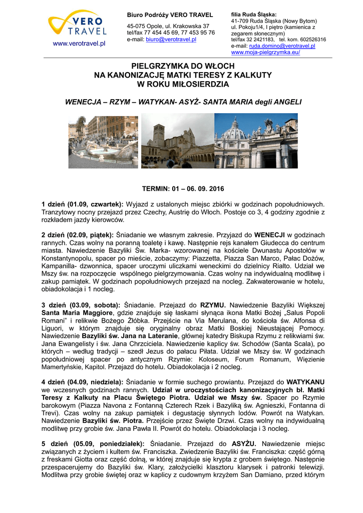 Biuro Podróży VERO TRAVEL www.verotravel.pl 45-075 Opole, ul. Krakowska 37 tel/fax 77 454 45 69, 77 453 95 76 e-mail: [email protected] filia Ruda Śląska: 41-709 Ruda Śląska (Nowy Bytom) ul. Pokoju1/4, I piętro (kamienica z zegarem słonecznym) tel/fax 32 2421183, tel. kom. 602526316 e-mail: [email protected] www.moja-pielgrzymka.eu/ PIELGRZYMKA DO WŁOCH NA KANONIZACJĘ MATKI TERESY Z KALKUTY W ROKU MIŁOSIERDZIA WENECJA – RZYM – WATYKAN- ASYŻ- SANTA MARIA degli ANGELI TERMIN: 01 – 06. 09. 2016 1 dzień (01.09, czwartek): Wyjazd z ustalonych miejsc zbiórki w godzinach popołudniowych. Tranzytowy nocny przejazd przez Czechy, Austrię do Włoch. Postoje co 3, 4 godziny zgodnie z rozkładem jazdy kierowców. 2 dzień (02.09, piątek): Śniadanie we własnym zakresie. Przyjazd do WENECJI w godzinach rannych. Czas wolny na poranną toaletę i kawę. Następnie rejs kanałem Giudecca do centrum miasta. Nawiedzenie Bazyliki Św. Marka- wzorowanej na kościele Dwunastu Apostołów w Konstantynopolu, spacer po mieście, zobaczymy: Piazzetta, Piazza San Marco, Pałac Dożów, Kampanilla- dzwonnica, spacer uroczymi uliczkami weneckimi do dzielnicy Rialto. Udział we Mszy św. na rozpoczęcie wspólnego pielgrzymowania. Czas wolny na indywidualną modlitwę i zakup pamiątek. W godzinach popołudniowych przejazd na nocleg. Zakwaterowanie w hotelu, obiadokolacja i 1 nocleg. 3 dzień (03.09, sobota): Śniadanie. Przejazd do RZYMU. Nawiedzenie Bazyliki Większej Santa Maria Maggiore, gdzie znajduje się łaskami słynąca ikona Matki Bożej „Salus Popoli Romani” i relikwie Bożego Żłóbka. Przejście na Via Merulana, do kościoła św. Alfonsa di Liguori, w którym znajduje się oryginalny obraz Matki Boskiej Nieustającej Pomocy. Nawiedzenie Bazyliki św. Jana na Lateranie, głównej katedry Biskupa Rzymu z relikwiami św. Jana Ewangelisty i św. Jana Chrzciciela. Nawiedzenie kaplicy św. Schodów (Santa Scala), po których – według tradycji – szedł Jezus do pałacu Piłata. Udział we Mszy św. W godzinach popołudniowej spacer po antycznym Rzymie: Koloseum, Forum Romanum, Więzienie Mamertyńskie, Kapitol. Przejazd do hotelu. Obiadokolacja i 2 nocleg. 4 dzień (04.09, niedziela): Śniadanie w formie suchego prowiantu. Przejazd do WATYKANU we wczesnych godzinach rannych. Udział w uroczystościach kanonizacyjnych bł. Matki Teresy z Kalkuty na Placu Świętego Piotra. Udział we Mszy św. Spacer po Rzymie barokowym (Piazza Navona z Fontanną Czterech Rzek i Bazyliką św. Agnieszki, Fontanna di Trevi). Czas wolny na zakup pamiątek i degustację słynnych lodów. Powrót na Watykan. Nawiedzenie Bazyliki św. Piotra. Przejście przez Święte Drzwi. Czas wolny na indywidualną modlitwę przy grobie św. Jana Pawła II. Powrót do hotelu. Obiadokolacja i 3 nocleg. 5 dzień (05.09, poniedziałek): Śniadanie. Przejazd do ASYŻU. Nawiedzenie miejsc związanych z życiem i kultem św. Franciszka. Zwiedzenie Bazyliki św. Franciszka: część górną z freskami Giotta oraz część dolną, w której znajduje się krypta z grobem świętego. Następnie przespacerujemy do Bazyliki św. Klary, założycielki klasztoru klarysek i patronki telewizji. Modlitwa przy grobie świętej oraz w kaplicy z cudownym krzyżem San Damiano, przed którym Biuro Podróży VERO TRAVEL www.verotravel.pl 45-075 Opole, ul. Krakowska 37 tel/fax 77 454 45 69, 77 453 95 76 e-mail: [email protected] filia Ruda Śląska: 41-709 Ruda Śląska (Nowy Bytom) ul. Pokoju1/4, I piętro (kamienica z zegarem słonecznym) tel/fax 32 2421183, tel. kom. 602526316 e-mail: [email protected] www.moja-pielgrzymka.eu/ św. Franciszek usłyszał znamienne słowa; „Franciszku, napraw mój Kościół”. Nawiedzenie katedry św. Rufina – patrona miasta i męczennika za wiarę za czasów cesarza Dioklecjana. Czas wolny na zakup pamiątek i produktów lokalnych (win, makaronów, wyrobów ceramicznych). Udział we Mszy św. na zakończenie wspólnego pielgrzymowania. Przejazd do Asyżu Dolnego: nawiedzenie Porcjunkuli – Bazyliki Matki Boskiej Anielskiej z kaplicą wzniesioną w miejscu śmierci św. Franciszka. Czas wolny na wieczorną toaletę i przygotowanie się do nocnej podróży. Tranzytowy przejazd w kierunku kraju. 6 dzień (06.09, wtorek): Przyjazd do kraju we wczesnych godzinach popołuniowych. Pożegnanie grupy. Zakończenie pielgrzymki. CENA: 1250 przy 40 osobach płatnych CENA: 1210 przy 45 osobach płatnych Świadczenia: - przejazd komfortowym autokarem (wc, barek, dvd, klimatyzacja); - 3 noclegi w hotelach***/**, pokoje 2- 3 osobowe z łazienkami; - wyżywienie 2 x dziennie- 3 śniadania wzmocnione, 3 obiadokolacje - opieka pilota- przewodnika na całej trasie; - opieka duchowa kapłana; - ubezpieczenie NNW, KL, CP (choroby przewlekłe) SIGNAL IDUNA S.A. - Pakiet Pielgrzyma: śpiewnik, chusta, identyfikator, obrazki pamiątkowe. Cena nie zawiera: Biletów wstępu do zwiedzanych obiektów, lokalnych przewodników i słuchawek tzw. Audio guidy, taksy klimatycznej, barki po Wenecji, biletów za przejazd po Rzymie - łącznie ok. 50 Euro, napojów do obiadokolacji. Wydatki w EURO są rozliczane przez pilota pod koniec pielgrzymki