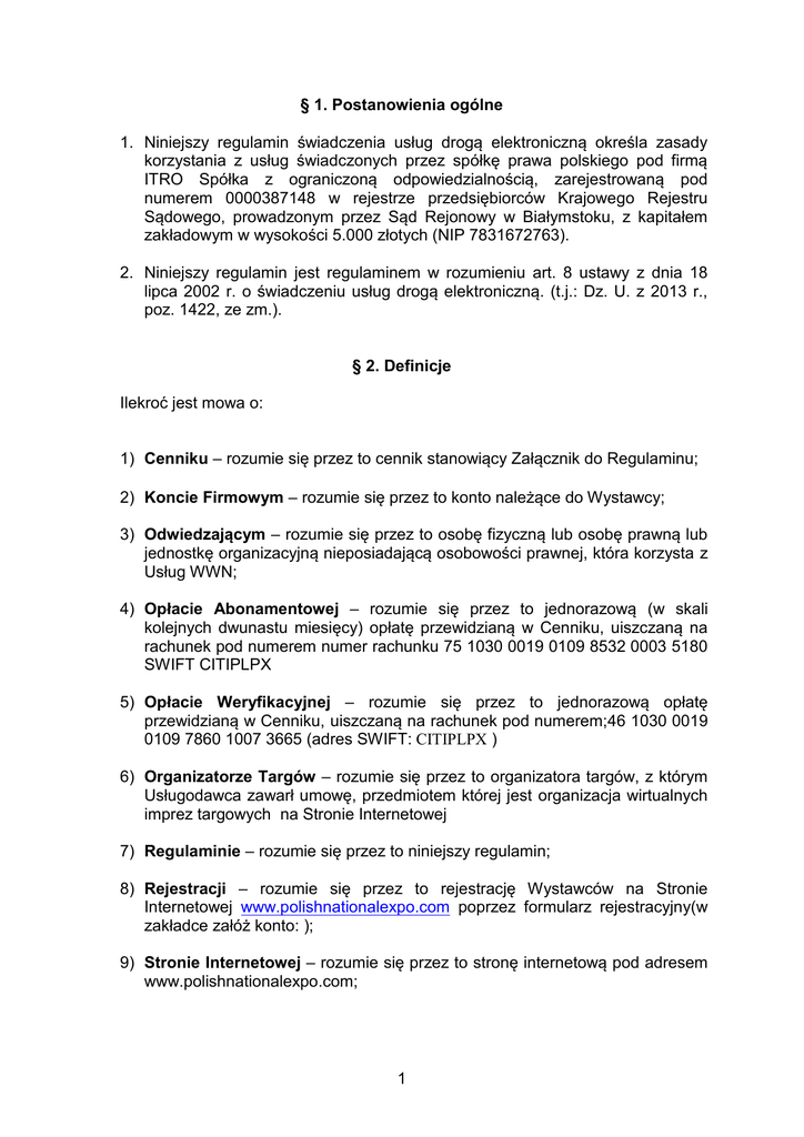 § 1. Postanowienia ogólne 1. Niniejszy regulamin świadczenia usług drogą elektroniczną określa zasady korzystania z usług świadczonych przez spółkę prawa polskiego pod firmą ITRO Spółka z ograniczoną odpowiedzialnością, zarejestrowaną pod numerem 0000387148 w rejestrze przedsiębiorców Krajowego Rejestru Sądowego, prowadzonym przez Sąd Rejonowy w Białymstoku, z kapitałem zakładowym w wysokości 5.000 złotych (NIP 7831672763). 2. Niniejszy regulamin jest regulaminem w rozumieniu art. 8 ustawy z dnia 18 lipca 2002 r. o świadczeniu usług drogą elektroniczną. (t.j.: Dz. U. z 2013 r., poz. 1422, ze zm.). § 2. Definicje Ilekroć jest mowa o: 1) Cenniku – rozumie się przez to cennik stanowiący Załącznik do Regulaminu; 2) Koncie Firmowym – rozumie się przez to konto należące do Wystawcy; 3) Odwiedzającym – rozumie się przez to osobę fizyczną lub osobę prawną lub jednostkę organizacyjną nieposiadającą osobowości prawnej, która korzysta z Usług WWN; 4) Opłacie Abonamentowej – rozumie się przez to jednorazową (w skali kolejnych dwunastu miesięcy) opłatę przewidzianą w Cenniku, uiszczaną na rachunek pod numerem numer rachunku 75 1030 0019 0109 8532 0003 5180 SWIFT CITIPLPX 5) Opłacie Weryfikacyjnej – rozumie się przez to jednorazową opłatę przewidzianą w Cenniku, uiszczaną na rachunek pod numerem;46 1030 0019 0109 7860 1007 3665 (adres SWIFT: CITIPLPX ) 6) Organizatorze Targów – rozumie się przez to organizatora targów, z którym Usługodawca zawarł umowę, przedmiotem której jest organizacja wirtualnych imprez targowych na Stronie Internetowej 7) Regulaminie – rozumie się przez to niniejszy regulamin; 8) Rejestracji – rozumie się przez to rejestrację Wystawców na Stronie Internetowej www.polishnationalexpo.com poprzez formularz rejestracyjny(w zakładce załóż konto: ); 9) Stronie Internetowej – rozumie się przez to stronę internetową pod adresem www.polishnationalexpo.com; 1 10) Usługi WWN– rozumie się przez to usługi świadczone Usługobiorcom, różniące się od siebie zakresem ze względu na to, czy oferowane są Wystawcom, czy Odwiedzającym; 11) Usługobiorcy – rozumie się przez to Odwiedzającego lub Wystawcę; 12) Usługodawcy – rozumie się przez to spółkę pod firmą „ITRO Spółka z ograniczoną odpowiedzialnością” z siedzibą w Białymstoku, zarejestrowaną pod numerem 0000387148 w rejestrze przedsiębiorców Krajowego Rejestru Sądowego; 13) Wystawcy – rozumie się przez to wystawcę korzystającego z Usług, będącego spółką prawa polskiego albo innym podmiotem prawa, zarejestrowanym w Polsce; 14) Weryfikacji Konta Firmowego – rozumie się przez to przeprowadzaną przez Usługodawcę weryfikację Konta Firmowego należącego do innego przedsiębiorcy niż Organizator Targów lub Wystawca, obejmującą w szczególności Dokument Rejestrowy 15) Zweryfikowanym Koncie Firmowego – rozumie się przez to konto, co do którego miała miejsce pozytywna Weryfikacja Konta Odwiedzającego. § 3. Warunki korzystania z Usług POLSKIEJ Wirtualnej Wystawy Narodowej 1. Z Usług WWN mogą korzystać Wystawcy i Odwiedzający. 2. Odwiedzający korzystają z Usług WWN bezpłatnie. 3. Wystawcy korzystają z Usług WWN za Opłatą Abonamentową, nie wcześniej niż po jej uiszczeniu na rzecz Usługodawcy. 4. Opłata Abonamentowa może być uiszczona w dwunastu równych ratach, przy czym terminy płatności wszystkich rat poza pierwszą przypadają na ostatnie dni miesięcy następujących po miesiącu, w którym nastąpiła zapłata pierwszej raty. 5. Jednorazowe uiszczenie przez Wystawcę Opłaty Abonamentowej upoważnia do zniżki, której rozmiar Usługodawca określa w Cenniku. 6. Niezapłacenie którejkolwiek z rat Opłaty Abonamentowej w terminie miesiąca od dnia, w którym przypadał termin jej zapłaty, uprawnia Usługodawcę do zablokowania Konta Wystawcy. Usługodawca może odblokować Konto Wystawcy po uiszczeniu zaległych należności. 7. Wystawca, który zarejestruje się na stronie www.polishnationalexpo.com i uiści Opłatę Abonamentową, może korzystać z następujących Usług: tworzyć 2 wirtualne stoisko Wystawcy, gdzie może umieścić materiały handlowe i marketingowe, oraz brać udział w wirtualnych imprezach targowych organizowanych przez Usługodawcę lub jego partnerów. 8. Odwiedzający, który odwiedzi stronę www.polishnationalexpo.com, może korzystać z następujących Usług: dostęp do bazy danych Wystawców, przeglądania ich materiałów umieszczonych na wirtualnych stoiskach, w trzech kategoriach Biznes, Turystyka, Inwestycje. 9. Usługodawca powiadamia zarejestrowanych Wystawców o organizowanych przez Usługodawcę lub partnerów Usługodawcy wirtualnych targach – w takim wypadku Wystawcy mogą logować się na Stronie Internetowej w celu wzięcia udziału w wirtualnej imprezie targowej dostępnej w internecie w określonych przez Usługodawcę ramach czasowych . 10. Za chwilę zawarcia umowy uważa się chwilę utworzenie konta Usługobiorcy, połączone z akceptacją Regulaminu oraz przesłanie podpisanej umowy na adres Itro Sp. z o.o. 15-158 Białystok ul. Wschodnia 46. 11. Korzystanie ze Zweryfikowanego Konta Firmowego jest możliwe wyłącznie dla Organizatorów Targów i Wystawców – bez dopełniania dodatkowych czynności, oraz Odwiedzających, co do których zostanie przeprowadzona pozytywna Weryfikacja Konta Firmowego. 12. Doręczenie Usługodawcy Dokumentu Rejestrowego w celu Weryfikacji Konta Firmowego może nastąpić listownie albo za pomocą poczty elektronicznej (w formacie PDF), wysłanej pod adres [email protected]. 13. Weryfikacja Konta Firmowego powinna nastąpić nie później niż w terminie czternastu dni od doręczenia Usługodawcy dokumentu rejestrowego wraz z tłumaczeniem, jeżeli jest wymagane, oraz potwierdzenia uiszczenia Opłaty Weryfikacyjnej. 14. Potwierdzenia uiszczenia Opłaty Weryfikacyjnej dokonuje U