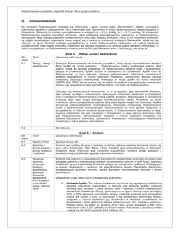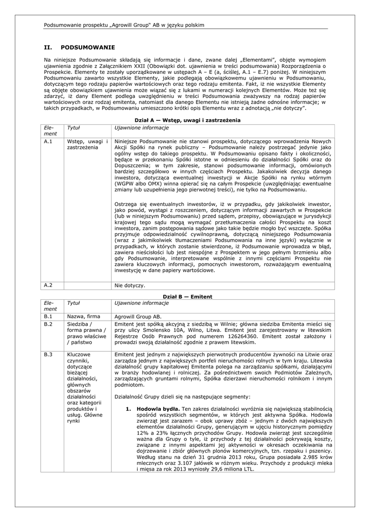 Podsumowanie prospektu „Agrowill Group“ AB w języku polskim II. PODSUMOWANIE Na niniejsze Podsumowanie składają się informacje i dane, zwane dalej „Elementami”, objęte wymogiem ujawnienia zgodnie z Załącznikiem XXII (Obowiązki dot. ujawnienia w treści podsumowania) Rozporządzenia o Prospekcie. Elementy te zostały uporządkowane w ustępach A – E (a, ściślej, A.1 – E.7) poniżej. W niniejszym Podsumowaniu zawarto wszystkie Elementy, jakie podlegają obowiązkowemu ujawnieniu w Podsumowaniu, dotyczącym tego rodzaju papierów wartościowych oraz tego rodzaju emitenta. Fakt, iż nie wszystkie Elementy są objęte obowiązkiem ujawnienia może wiązać się z lukami w numeracji kolejnych Elementów. Może też się zdarzyć, iż dany Element podlega uwzględnieniu w treści Podsumowania zważywszy na rodzaj papierów wartościowych oraz rodzaj emitenta, natomiast dla danego Elementu nie istnieją żadne odnośne informacje; w takich przypadkach, w Podsumowaniu umieszczono krótki opis Elementu wraz z adnotacją „nie dotyczy”. Dział A — Wstęp, uwagi i zastrzeżenia Element Tytuł Ujawnione informacje A.1 Wstęp, uwagi i zastrzeżenia Niniejsze Podsumowanie nie stanowi prospektu, dotyczącego wprowadzenia Nowych Akcji Spółki na rynek publiczny – Podsumowanie należy postrzegać jedynie jako ogólny wstęp do takiego prospektu. W Podsumowaniu opisano fakty i okoliczności, będące w przekonaniu Spółki istotne w odniesieniu do działalności Spółki oraz do Dopuszczenia; w tym zakresie, stanowi podsumowanie informacji, omówionych bardziej szczegółowo w innych częściach Prospektu. Jakakolwiek decyzja danego inwestora, dotycząca ewentualnej inwestycji w Akcje Spółki na rynku wtórnym (WGPW albo OMX) winna opierać się na całym Prospekcie (uwzględniając ewentualne zmiany lub uzupełnienia jego pierwotnej treści), nie tylko na Podsumowaniu. Ostrzega się ewentualnych inwestorów, iż w przypadku, gdy jakikolwiek inwestor, jako powód, wystąpi z roszczeniem, dotyczącym informacji zawartych w Prospekcie (lub w niniejszym Podsumowaniu) przed sądem, przepisy, obowiązujące w jurysdykcji krajowej tego sądu mogą wymagać przetłumaczenia całości Prospektu na koszt inwestora, zanim postępowania sądowe jako takie będzie mogło być wszczęte. Spółka przyjmuje odpowiedzialność cywilnoprawną, dotyczącą niniejszego Podsumowania (wraz z jakimikolwiek tłumaczeniami Podsumowania na inne języki) wyłącznie w przypadkach, w których zostanie stwierdzone, iż Podsumowanie wprowadza w błąd, zawiera nieścisłości lub jest niespójne z Prospektem w jego pełnym brzmieniu albo gdy Podsumowanie, interpretowane wspólnie z innymi częściami Prospektu nie zawiera kluczowych informacji, pomocnych inwestorom, rozważającym ewentualną inwestycję w dane papiery wartościowe. A.2 Nie dotyczy. Element Tytuł Dział B — Emitent Ujawnione informacje B.1 Nazwa, firma Agrowill Group AB. B.2 Siedziba / forma prawna / prawo właściwe / państwo Emitent jest spółką akcyjną z siedzibą w Wilnie; główna siedziba Emitenta mieści się przy ulicy Smolensko 10A, Wilno, Litwa. Emitent jest zarejestrowany w litewskim Rejestrze Osób Prawnych pod numerem 126264360. Emitent został założony i prowadzi swoją działalność zgodnie z prawem litewskim. B.3 Kluczowe czynniki, dotyczące bieżącej działalności, głównych obszarów działalności oraz kategorii produktów i usług. Główne rynki Emitent jest jednym z największych pierwotnych producentów żywności na Litwie oraz zarządza jednym z największych portfeli nieruchomości rolnych w tym kraju. Litewska działalność grupy kapitałowej Emitenta polega na zarządzaniu spółkami, działającymi w branży hodowlanej i rolniczej. Za pośrednictwem swoich Podmiotów Zależnych, zarządzających gruntami rolnymi, Spółka dzierżawi nieruchomości rolnikom i innym podmiotom. Działalność Grupy dzieli się na następujące segmenty: 1. Hodowla bydła. Ten zakres działalności wyróżnia się największą stabilnością spośród wszystkich segmentów, w których jest aktywna Spółka. Hodowla zwierząt jest zarazem – obok uprawy zbóż – jednym z dwóch największych elementów działalności Grupy, generującym w ujęciu historycznym pomiędzy 12% a 23% łącznych przychodów Grupy. Hodowla zwierząt jest szczególnie ważna dla Grupy o tyle, iż przychody z tej działalności pokrywają koszty, związane z innymi aspektami jej aktywności w okresach oczekiwania na dojrzewanie i zbiór głównych plonów komercyjnych, tzn. rzepaku i pszenicy. Według stanu na dzień 31 grudnia 2013 roku, Grupa posiadała 2.985 krów mlecznych oraz 3.107 jałówek w różnym wieku. Przychody z produkcji mleka i mięsa za rok 2013 wyniosły 29,6 miliona LTL. Podsumowanie prospektu „Agrowill Group“ AB w języku polskim 2. Uprawy. Uprawa zbóż stanowi największy segment w strukturze działalności Grupy, odpowiadający w ujęciu historycznym za od 38% do 61% łącznych przychodów Grupy. Główne rodzaje plonów, uprawianych i zbieranych przez Spółkę to pszenica zimowa i letnia oraz rzepak. Uprawy jęczmienia i pszenżyta są wykorzystywane jako pasza dla bydła, podobnie jak kilka rodzajów kukurydzy i traw zielonych. Grupa zarządza aktualnie łącznym areałem, wynoszącym około 22.400 hektarów. Przychody Grupy z upraw zbóż za rok 2013 wyniosły 45,1 miliona LTL. 3. Inne segmenty. Grupa jest aktualnie właścicielem 11,8 tysiąca hektarów ziemi, z czego 4,3 tysiąca hektarów stanowi własność spółek rolnych Grupy albo jest przez nie dzierżawione, a 7,5 tysiąca hektarów jest dzierżawione innym podmiotom rolnym. Grupa jest też założycielem nowych spółek, mających dokonywać inwestycji w sektorze energii alternatywnych, przy czym, według stanu na dzień sporządzenia Prospektu, żaden z tych projektów inwestycyjnych nie został jeszcze rozpoczęty. Przychody z dzierżawy grunt
