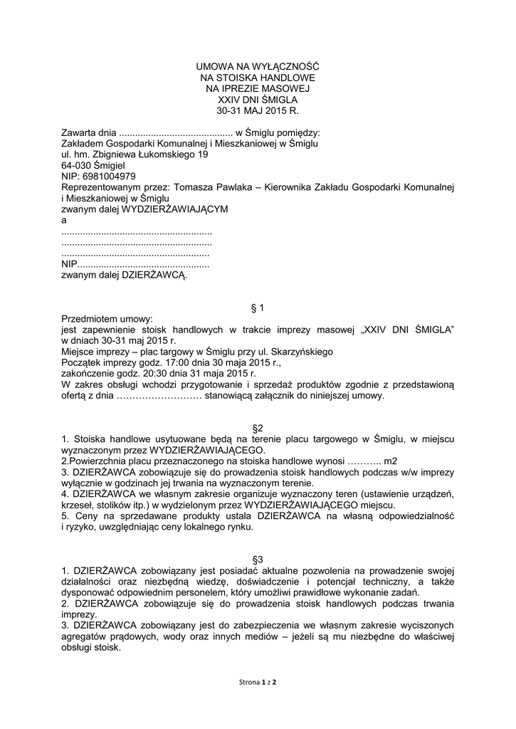 UMOWA NA WYŁĄCZNOŚĆ NA STOISKA HANDLOWE NA IPREZIE MASOWEJ XXIV DNI ŚMIGLA 30-31 MAJ 2015 R. Zawarta dnia ........................................... w Śmiglu pomiędzy: Zakładem Gospodarki Komunalnej i Mieszkaniowej w Śmiglu ul. hm. Zbigniewa Łukomskiego 19 64-030 Śmigiel NIP: 6981004979 Reprezentowanym przez: Tomasza Pawlaka – Kierownika Zakładu Gospodarki Komunalnej i Mieszkaniowej w Śmiglu zwanym dalej WYDZIERŻAWIAJĄCYM a ......................................................... ......................................................... ........................................................ NIP.................................................. zwanym dalej DZIERŻAWCĄ. §1 Przedmiotem umowy: jest zapewnienie stoisk handlowych w trakcie imprezy masowej „XXIV DNI ŚMIGLA” w dniach 30-31 maj 2015 r. Miejsce imprezy – plac targowy w Śmiglu przy ul. Skarzyńskiego Początek imprezy godz. 17:00 dnia 30 maja 2015 r., zakończenie godz. 20:30 dnia 31 maja 2015 r. W zakres obsługi wchodzi przygotowanie i sprzedaż produktów zgodnie z przedstawioną ofertą z dnia ……………………… stanowiącą załącznik do niniejszej umowy. §2 1. Stoiska handlowe usytuowane będą na terenie placu targowego w Śmiglu, w miejscu wyznaczonym przez WYDZIERŻAWIAJĄCEGO. 2.Powierzchnia placu przeznaczonego na stoiska handlowe wynosi ……….. m2 3. DZIERŻAWCA zobowiązuje się do prowadzenia stoisk handlowych podczas w/w imprezy wyłącznie w godzinach jej trwania na wyznaczonym terenie. 4. DZIERŻAWCA we własnym zakresie organizuje wyznaczony teren (ustawienie urządzeń, krzeseł, stolików itp.) w wydzielonym przez WYDZIERŻAWIAJĄCEGO miejscu. 5. Ceny na sprzedawane produkty ustala DZIERŻAWCA na własną odpowiedzialność i ryzyko, uwzględniając ceny lokalnego rynku. §3 1. DZIERŻAWCA zobowiązany jest posiadać aktualne pozwolenia na prowadzenie swojej działalności oraz niezbędną wiedzę, doświadczenie i potencjał techniczny, a także dysponować odpowiednim personelem, który umożliwi prawidłowe wykonanie zadań. 2. DZIERŻAWCA zobowiązuje się do prowadzenia stoisk handlowych podczas trwania imprezy. 3. DZIERŻAWCA zobowiązany jest do zabezpieczenia we własnym zakresie wyciszonych agregatów prądowych, wody oraz innych mediów – jeżeli są mu niezbędne do właściwej obsługi stoisk. Strona 1 z 2 4. DZIERŻAWCA zobowiązuje się do zachowania czystości na obszarze objętym wyłącznością podczas trwania imprezy oraz posprzątanie tego terenu po zakończeniu imprezy. 5. DZIERŻAWCA zobowiązany jest do ustawienia urządzeń sprawnych technicznie, czystych i estetycznych oraz zapewnienia bezpiecznego korzystania z nich, 6. DZIERŻAWCA zobowiązany jest do przestrzegania postanowień WYDZIERŻAWIAJĄCEGO i Organizatora imprezy w zakresie zapewnienia porządku i bezpieczeństwa przebiegu imprezy, 7. Za wszelkie szkody wynikające z niewłaściwego użytkowania przez DZIERŻAWCĘ udostępnionego terenu odpowiada DZIERŻAWCA, 8. WYDZIERŻAWIAJĄCY nie ponosi odpowiedzialności za szkody w mieniu DZIERŻAWCY oraz osób, którymi ewentualnie DZIERŻAWCA się posługuje przy wykonaniu umowy zawartej z ZGKiM w Śmiglu wyrządzonej w szczególności przez uczestników imprezy, 9. WYDZIERŻAWIAJĄCY nie ponosi odpowiedzialności za odwołanie imprezy z przyczyn od niego niezależnych, 10. W przypadku odwołania imprezy kwota dzierżawy zostanie zwrócona DZIERŻAWCY. §4 1.DZIERŻAWCA uiści na rzecz WYDZIERŻAWIAJĄCEGO kwotę ....................................../netto (słownie: .........................................................................) plus należny podatek VAT tytułem opłaty za dzierżawę i wyznaczenie stoiska płatne w całości w kasie Zakładu Gospodarki Komunalnej i Mieszkaniowej w Śmiglu lub przedpłatą na rachunek bankowy 02866700030011137320000010 co najmniej 7 (siedem) dni przed planowaną imprezą. 2. W przypadku odstąpienia od wykonania umowy przez DZIERŻAWCĘ wpłacona kwota nie podlega zwrotowi. 3. W przypadku podpisania umowy przez DZIERŻAWCĘ i braku zapłaty w wyznaczonym terminie, należność z tytułu podpisania umowy będzie fakturowana i wymagana zgodnie z umową. §5 1. Obie strony niniejszej umowy zapewniają, że realizować będą swoje obowiązki wynikające z tej umowy z najwyższą starannością. 2. Wszelkie zmiany niniejszej umowy wymagają dla swej ważności formy pisemnego aneksu podpisanego przez obie strony. 3. Wszelkie spory mogące wyniknąć z niniejszej umowy będzie rozstrzygać sąd właściwy miejscowo dla WYDZIERŻAWIAJĄCEGO 4. Umowa została sporządzona w dwóch jednobrzmiących egzemplarzach po jednym dla każdej ze stron DZIERŻAWCA WYDZIERŻAWIAJĄCY Strona 2 z 2
