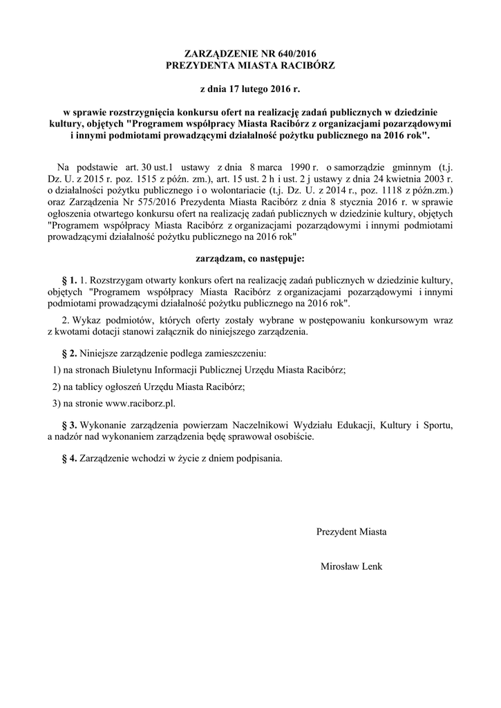 ZARZĄDZENIE NR 640/2016 PREZYDENTA MIASTA RACIBÓRZ z dnia 17 lutego 2016 r. w sprawie rozstrzygnięcia konkursu ofert na realizację zadań publicznych w dziedzinie kultury, objętych "Programem współpracy Miasta Racibórz z organizacjami pozarządowymi i innymi podmiotami prowadzącymi działalność pożytku publicznego na 2016 rok". Na podstawie art. 30 ust.1 ustawy z dnia 8 marca 1990 r. o samorządzie gminnym (t.j. Dz. U. z 2015 r. poz. 1515 z późn. zm.), art. 15 ust. 2 h i ust. 2 j ustawy z dnia 24 kwietnia 2003 r. o działalności pożytku publicznego i o wolontariacie (t.j. Dz. U. z 2014 r., poz. 1118 z późn.zm.) oraz Zarządzenia Nr 575/2016 Prezydenta Miasta Racibórz z dnia 8 stycznia 2016 r. w sprawie ogłoszenia otwartego konkursu ofert na realizację zadań publicznych w dziedzinie kultury, objętych "Programem współpracy Miasta Racibórz z organizacjami pozarządowymi i innymi podmiotami prowadzącymi działalność pożytku publicznego na 2016 rok" zarządzam, co następuje: § 1. 1. Rozstrzygam otwarty konkurs ofert na realizację zadań publicznych w dziedzinie kultury, objętych "Programem współpracy Miasta Racibórz z organizacjami pozarządowymi i innymi podmiotami prowadzącymi działalność pożytku publicznego na 2016 rok". 2. Wykaz podmiotów, których oferty zostały wybrane w postępowaniu konkursowym wraz z kwotami dotacji stanowi załącznik do niniejszego zarządzenia. § 2. Niniejsze zarządzenie podlega zamieszczeniu: 1) na stronach Biuletynu Informacji Publicznej Urzędu Miasta Racibórz; 2) na tablicy ogłoszeń Urzędu Miasta Racibórz; 3) na stronie www.raciborz.pl. § 3. Wykonanie zarządzenia powierzam Naczelnikowi Wydziału Edukacji, Kultury i Sportu, a nadzór nad wykonaniem zarządzenia będę sprawował osobiście. § 4. Zarządzenie wchodzi w życie z dniem podpisania. Prezydent Miasta Mirosław Lenk Uzasadnienie Zgodnie z postanowieniami Zarządzenia Nr 575/2016 Prezydenta Miasta Racibórz z dnia 8 stycznia 2016 r. w sprawie ogłoszenia otwartego konkursu ofert na realizację zadań publicznych w dziedzinie kultury, objętych "Programem współpracy Miasta Racibórz z organizacjami pozarządowymi i innymi podmiotami prowadzącymi działalność pożytku publicznego na 2016 rok", rozstrzygnięcia otwartego konkursu ofert dokonuje Prezydent Miasta Racibórz. Załącznik do Zarządzenia Nr 640/2016 Prezydenta Miasta Racibórz z dnia 17 lutego 2016 r. WYKAZ PODMIOTÓW, którym udzielono dotacji na realizację zadań publicznych w dziedzinie kultury w 2016 r. Nazwa Stowarzyszenia, organizacji Lp. oraz Kwota dotacji nazwa zadania 1. Towarzystwo Społeczno-Kulturalne Niemców Woj. Śląskiego I Oferta: Warsztaty dla chóru. 1.500 zł II Oferta: Przegląd filmów niemieckich w Raciborzu. 2.000 zł 2. Raciborskie Kurkowe Bractwo Strzeleckie Oferta: Prezentacje Historyczne 2016. 3. Stowarzyszenie Na Rzecz Rozwoju Dzieci, Młodzieży i Rodziny „Pomocna Dłoń” Oferta: Organizacja popołudniowych zajęć pozalekcyjnych z chórem, przygotowanie do uczestnictwa i udział w życiu kulturalnym: Bel Canto – uczy, śpiewa, wychowuje, pomaga. 5.000 zł 4.000 zł 4. Stowarzyszenie Artystów i Podróżników – Grupa „Rosynant” Oferta: XIII Raciborski Festiwal Podróżniczy „Wiatraki 2016”. 24.000 zł 5. Stowarzyszenie Społeczności Osiedlowej „AURA” 2.500 zł Oferta: Po lekcjach…na językach, przy sztaludze i mikrofonie. 6. Stowarzyszenie Kultury Ziemi Raciborskiej „Źródło” I Oferta: XVI Międzynarodowe Spotkania Artystyczne „Śląsk – kraina wielu kultur” wzbogaceniem oferty kulturalnej Raciborza w czasie obchodów Dni Raciborza. II Oferta: Działania Stowarzyszenia Kultury Ziemi Raciborskiej „Źródło” na rzecz upowszechniania, promocji i popularyzacji kultury i sztuki. 13.000 zł 6.000 zł 7. Raciborska Orkiestra Dęta „PLANIA” Oferta: 10.000 zł Jubileusz 70-lecia Raciborskiej Orkiestry Dętej „PLANIA”. 8. Stowarzyszenie „Drengowie Znad Górnej Odry” Oferta: VIII Raciborski Festiwal Średniowieczny. 30.000 zł 9. Rada Uczelniana Samorządu Studenckiego Państwowej Wyższej Szkoły Zawodowej Oferta: 15.000 zł Dni Kultury Studenckiej na Dni Raciborza-Juwenalia 2016 PWSZ w Raciborzu.. 10. Raciborskie Stowarzyszenie Kulturalne ASK Oferta: Kreator Inicjatyw Kulturalnych KICKoff. Wykop dla kultury. 8.000 zł 11. INTRO LIGHT Oferta: INTRO Festiwal 2016. 12.000 zł 12. Stowarzyszenie Na Rzecz Integracji „Podaj Rękę” Oferta: Warsztaty malarskie dla osób niepełnosprawnych „Tworzę więc jestem”. 3.000 zł 13. NSZZ „Solidarność” przy Komendzie Powiatowej Państwowej Straży Pożarnej 30.000 zł Oferta: Pożegnanie Lata. 14. Polska Organizacja AIKIDO Oferta: Festiwal Kultury i Sztuki Japonii – BUDO GALA. 4.000 zł