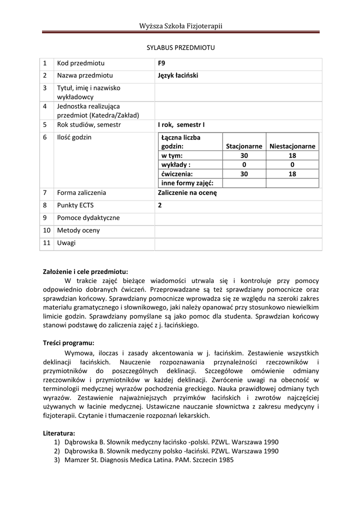 Wyższa Szkoła Fizjoterapii SYLABUS PRZEDMIOTU 1 Kod przedmiotu F9 2 Nazwa przedmiotu Język łaciński 3 5 Tytuł, imię i nazwisko wykładowcy Jednostka realizująca przedmiot (Katedra/Zakład) Rok studiów, semestr I rok, semestr I 6 Ilość godzin 4 7 Forma zaliczenia Łączna liczba godzin: w tym: wykłady : ćwiczenia: inne formy zajęć: Zaliczenie na ocenę 8 Punkty ECTS 2 9 Pomoce dydaktyczne Stacjonarne Niestacjonarne 30 18 0 0 30 18 10 Metody oceny 11 Uwagi Założenie i cele przedmiotu: W trakcie zajęć bieżące wiadomości utrwala się i kontroluje przy pomocy odpowiednio dobranych ćwiczeń. Przeprowadzane są też sprawdziany pomocnicze oraz sprawdzian końcowy. Sprawdziany pomocnicze wprowadza się ze względu na szeroki zakres materiału gramatycznego i słownikowego, jaki należy opanować przy stosunkowo niewielkim limicie godzin. Sprawdziany pomyślane są jako pomoc dla studenta. Sprawdzian końcowy stanowi podstawę do zaliczenia zajęć z j. łacińskiego. Treści programu: Wymowa, iloczas i zasady akcentowania w j. łacińskim. Zestawienie wszystkich deklinacji łacińskich. Nauczenie rozpoznawania przynależności rzeczowników i przymiotników do poszczególnych deklinacji. Szczegółowe omówienie odmiany rzeczowników i przymiotników w każdej deklinacji. Zwrócenie uwagi na obecność w terminologii medycznej wyrazów pochodzenia greckiego. Nauka prawidłowej odmiany tych wyrazów. Zestawienie najważniejszych przyimków łacińskich i zwrotów najczęściej używanych w łacinie medycznej. Ustawiczne nauczanie słownictwa z zakresu medycyny i fizjoterapii. Czytanie i tłumaczenie rozpoznań lekarskich. Literatura: 1) Dąbrowska B. Słownik medyczny łacińsko -polski. PZWL. Warszawa 1990 2) Dąbrowska B. Słownik medyczny polsko -łaciński. PZWL. Warszawa 1990 3) Mamzer St. Diagnosis Medica Latina. PAM. Szczecin 1985 Wyższa Szkoła Fizjoterapii 4) Piekarz M. Lingua Latina medicinalis. MP. Kraków 1996 5) Rosławski A. Słownik łacińsko -polski nazewnictwa medycznego i przykłady rozpoznań lekarskich. AWF. Wrocław 1983