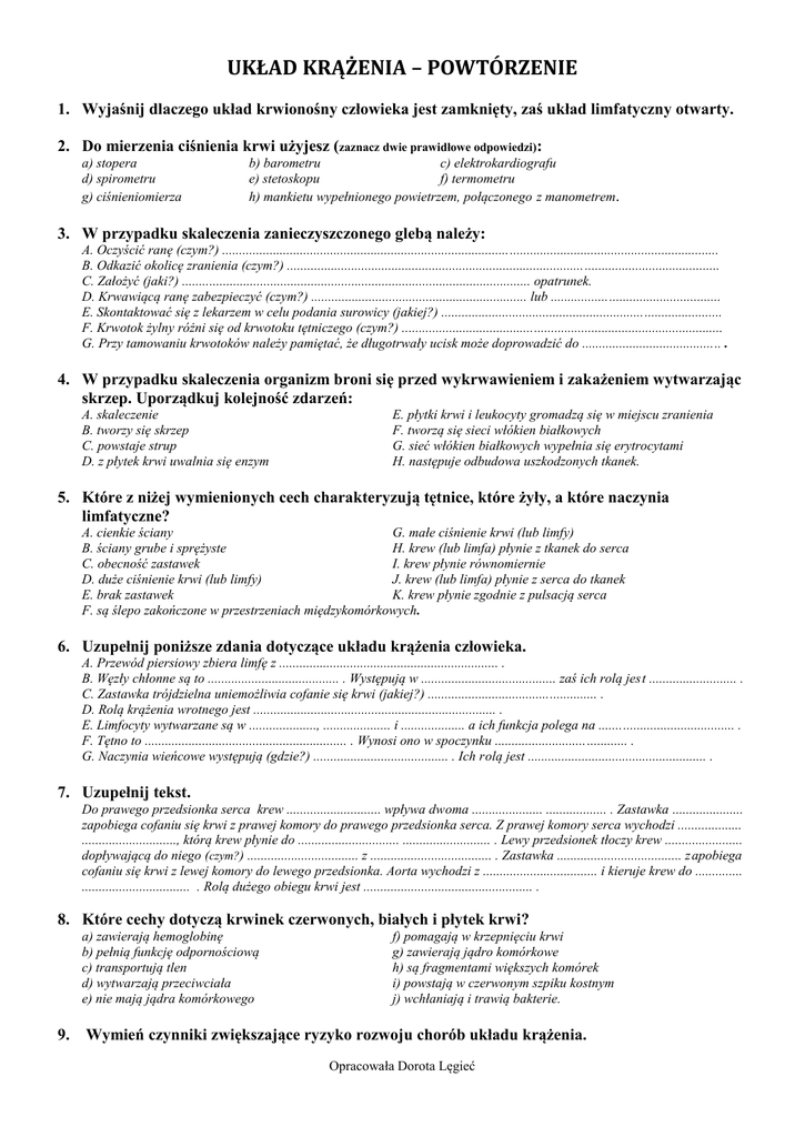 UKŁAD KRĄŻENIA – POWTÓRZENIE 1. Wyjaśnij dlaczego układ krwionośny człowieka jest zamknięty, zaś układ limfatyczny otwarty. 2. Do mierzenia ciśnienia krwi użyjesz (zaznacz dwie prawidłowe odpowiedzi): a) stopera d) spirometru g) ciśnieniomierza b) barometru c) elektrokardiografu e) stetoskopu f) termometru h) mankietu wypełnionego powietrzem, połączonego z manometrem. 3. W przypadku skaleczenia zanieczyszczonego glebą należy: A. Oczyścić ranę (czym?) ................................................................................................................................................... B. Odkazić okolicę zranienia (czym?) ........................................................................................ ........................................ C. Założyć (jaki?) ....................................................................................................... opatrunek. D. Krwawiącą ranę zabezpieczyć (czym?) ................................................................ lub .................................................. E. Skontaktować się z lekarzem w celu podania surowicy (jakiej?) ................................................................................... F. Krwotok żylny różni się od krwotoku tętniczego (czym?) ............................................................................................... G. Przy tamowaniu krwotoków należy pamiętać, że długotrwały ucisk może doprowadzić do ......................................... . 4. W przypadku skaleczenia organizm broni się przed wykrwawieniem i zakażeniem wytwarzając skrzep. Uporządkuj kolejność zdarzeń: A. skaleczenie B. tworzy się skrzep C. powstaje strup D. z płytek krwi uwalnia się enzym E. płytki krwi i leukocyty gromadzą się w miejscu zranienia F. tworzą się sieci włókien białkowych G. sieć włókien białkowych wypełnia się erytrocytami H. następuje odbudowa uszkodzonych tkanek. 5. Które z niżej wymienionych cech charakteryzują tętnice, które żyły, a które naczynia limfatyczne? A. cienkie ściany G. małe ciśnienie krwi (lub limfy) B. ściany grube i sprężyste H. krew (lub limfa) płynie z tkanek do serca C. obecność zastawek I. krew płynie równomiernie D. duże ciśnienie krwi (lub limfy) J. krew (lub limfa) płynie z serca do tkanek E. brak zastawek K. krew płynie zgodnie z pulsacją serca F. są ślepo zakończone w przestrzeniach międzykomórkowych. 6. Uzupełnij poniższe zdania dotyczące układu krążenia człowieka. A. Przewód piersiowy zbiera limfę z ................................................................. . B. Węzły chłonne są to ....................................... . Występują w ........................................ zaś ich rolą jest .......................... . C. Zastawka trójdzielna uniemożliwia cofanie się krwi (jakiej?) .................................................. . D. Rolą krążenia wrotnego jest ........................................................................ . E. Limfocyty wytwarzane są w ...................., .................... i ................... a ich funkcja polega na ........................................ . F. Tętno to ............................................................ . Wynosi ono w spoczynku ........................... ............ . G. Naczynia wieńcowe występują (gdzie?) ........................................ . Ich rolą jest ..................................................... . 7. Uzupełnij tekst. Do prawego przedsionka serca krew ............................ wpływa dwoma ..................... .................. . Zastawka ..................... zapobiega cofaniu się krwi z prawej komory do prawego przedsionka serca. Z prawej komory serca wychodzi ................... ............................, którą krew płynie do .............................. .......................... . Lewy przedsionek tłoczy krew ....................... dopływającą do niego (czym?) ................................. z .................................... . Zastawka ..................................... z apobiega cofaniu się krwi z lewej komory do lewego przedsionka. Aorta wychodzi z .................................. i kieruje krew do .............. ................................ . Rolą dużego obiegu krwi jest .................................................. . 8. Które cechy dotyczą krwinek czerwonych, białych i płytek krwi? a) zawierają hemoglobinę b) pełnią funkcję odpornościową c) transportują tlen d) wytwarzają przeciwciała e) nie mają jądra komórkowego 9. f) pomagają w krzepnięciu krwi g) zawierają jądro komórkowe h) są fragmentami większych komórek i) powstają w czerwonym szpiku kostnym j) wchłaniają i trawią bakterie. Wymień czynniki zwiększające ryzyko rozwoju chorób układu krążenia. Opracowała Dorota Lęgieć