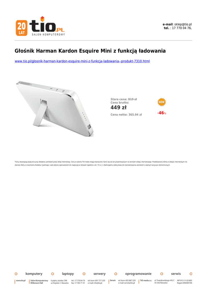 e-mail: [email protected] tel. : 17 770 04 76, Głośnik Harman Kardon Esquire Mini z funkcją ładowania www.tio.pl/glosnik-harman-kardon-esquire-mini-z-funkcja-ladowania--produkt-7310.html Stara cena: 819 zł Cena brutto: 449 zł Cena netto: 365.04 zł -46% *Ceny obowiązują wyłącznie przy składaniu zamówień przez sklep internetowy. Ceny w salonie TiO media mogą nieznacznie różnić się od cen prezentowanych na stronach sklepu internetowego. Przedstawiona oferta w sklepie internetowym nie stanowi oferty w rozumieniu Kodeksu Cywilnego, i jest jedynie zaproszeniem do rozpoczęcia rokowań (zgodnie z art. 71 k.c.). Zastrzegamy sobie prawo do niezrealizowania zamówień z ważnych przyczyn ekonomicznych.