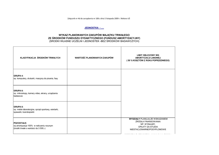 Załącznik nr 4d do zarządzenia nr 108 z dnia 5 listopada 2009 r. Rektora UŚ JEDNOSTKA - …. WYKAZ PLANOWANYCH ZAKUPÓW MAJĄTKU TRWAŁEGO ZE ŚRODKÓW FUNDUSZU DYDAKTYCZNEGO (FUNDUSZ AMORTYZACYJNY) (ŚRODKI WŁASNE UCZELNI I JEDNOSTEK -BEZ ŚRODKÓW BADAWCZYCH) KLASYFIKACJA ŚRODKÓW TRWAŁYCH WARTOŚĆ PLANOWANYCH ZAKUPÓW LIMIT OBLICZONY WG AMORTYZACJI LINIOWEJ ( 50 % KOSZTÓW Z ROKU POPRZEDNIEGO) GRUPA 4: np. komputery, drukarki, maszyny do pisania, faxy GRUPA 6: np. mikroskopy, kamery video, ekrany, urządzenia badawcze GRUPA 8: np. meble laboratoryjne, sprzęt sportowy, wiertarki, spawarki, kserokopiarki POZOSTAŁE: np.amortyzacja 100% w naliczeniu rocznym (środki trwałe o wartości do 3 500,-) WYDZIAŁY PLANUJĄ ZE WSKAZANIEM ŹRÓDŁA FINANSOWANIA NP. WYNAJMY, OPŁATY ZA STUDIA NIESTACJONARNE/PODYPLOMOWE POZOSTAŁE JEDNOSTKI - WYMAGANA ZGODA KSIĘGOZBIORY POZOSTAŁE JEDNOSTKI - WYMAGANA ZGODA REKTORA