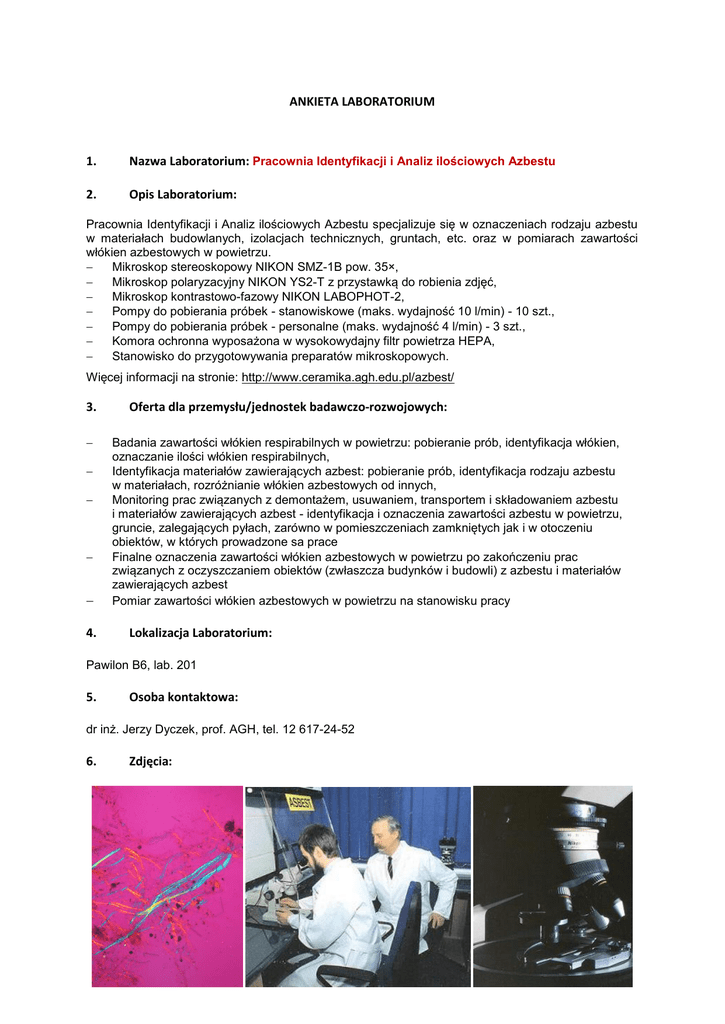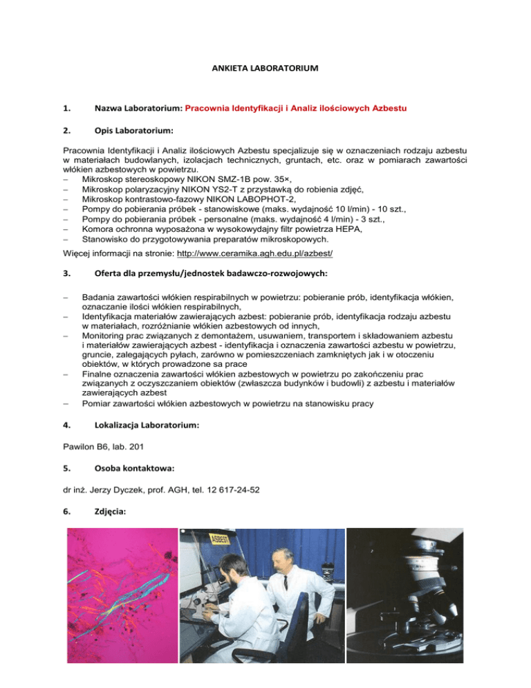 ANKIETA LABORATORIUM 1. Nazwa Laboratorium: Pracownia Identyfikacji i Analiz ilościowych Azbestu 2. Opis Laboratorium: Pracownia Identyfikacji i Analiz ilościowych Azbestu specjalizuje się w oznaczeniach rodzaju azbestu w materiałach budowlanych, izolacjach technicznych, gruntach, etc. oraz w pomiarach zawartości włókien azbestowych w powietrzu. Mikroskop stereoskopowy NIKON SMZ-1B pow. 35×, Mikroskop polaryzacyjny NIKON YS2-T z przystawką do robienia zdjęć, Mikroskop kontrastowo-fazowy NIKON LABOPHOT-2, Pompy do pobierania próbek - stanowiskowe (maks. wydajność 10 l/min) - 10 szt., Pompy do pobierania próbek - personalne (maks. wydajność 4 l/min) - 3 szt., Komora ochronna wyposażona w wysokowydajny filtr powietrza HEPA, Stanowisko do przygotowywania preparatów mikroskopowych. Więcej informacji na stronie: http://www.ceramika.agh.edu.pl/azbest/ 3. 4. Oferta dla przemysłu/jednostek badawczo-rozwojowych: Badania zawartości włókien respirabilnych w powietrzu: pobieranie prób, identyfikacja włókien, oznaczanie ilości włókien respirabilnych, Identyfikacja materiałów zawierających azbest: pobieranie prób, identyfikacja rodzaju azbestu w materiałach, rozróżnianie włókien azbestowych od innych, Monitoring prac związanych z demontażem, usuwaniem, transportem i składowaniem azbestu i materiałów zawierających azbest - identyfikacja i oznaczenia zawartości azbestu w powietrzu, gruncie, zalegających pyłach, zarówno w pomieszczeniach zamkniętych jak i w otoczeniu obiektów, w których prowadzone sa prace Finalne oznaczenia zawartości włókien azbestowych w powietrzu po zakończeniu prac związanych z oczyszczaniem obiektów (zwłaszcza budynków i budowli) z azbestu i materiałów zawierających azbest Pomiar zawartości włókien azbestowych w powietrzu na stanowisku pracy Lokalizacja Laboratorium: Pawilon B6, lab. 201 5. Osoba kontaktowa: dr inż. Jerzy Dyczek, prof. AGH, tel. 12 617-24-52 6. Zdjęcia: