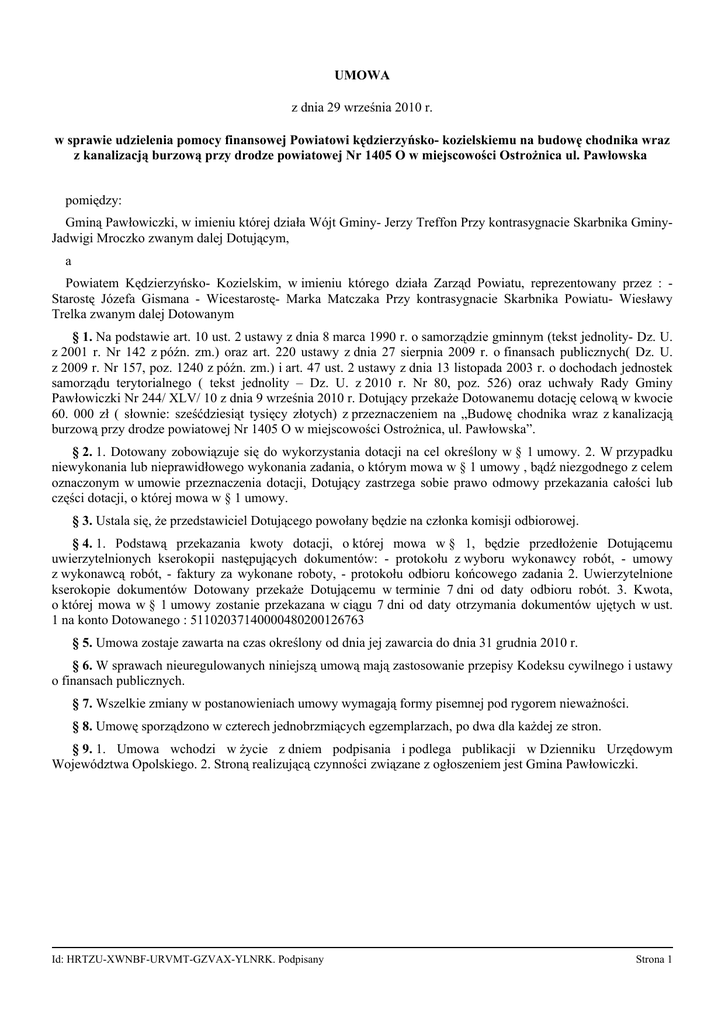 UMOWA z dnia 29 września 2010 r. w sprawie udzielenia pomocy finansowej Powiatowi kędzierzyńsko- kozielskiemu na budowę chodnika wraz z kanalizacją burzową przy drodze powiatowej Nr 1405 O w miejscowości Ostrożnica ul. Pawłowska pomiędzy: Gminą Pawłowiczki, w imieniu której działa Wójt Gminy- Jerzy Treffon Przy kontrasygnacie Skarbnika GminyJadwigi Mroczko zwanym dalej Dotującym, a Powiatem Kędzierzyńsko- Kozielskim, w imieniu którego działa Zarząd Powiatu, reprezentowany przez : Starostę Józefa Gismana - Wicestarostę- Marka Matczaka Przy kontrasygnacie Skarbnika Powiatu- Wiesławy Trelka zwanym dalej Dotowanym § 1. Na podstawie art. 10 ust. 2 ustawy z dnia 8 marca 1990 r. o samorządzie gminnym (tekst jednolity- Dz. U. z 2001 r. Nr 142 z późn. zm.) oraz art. 220 ustawy z dnia 27 sierpnia 2009 r. o finansach publicznych( Dz. U. z 2009 r. Nr 157, poz. 1240 z późn. zm.) i art. 47 ust. 2 ustawy z dnia 13 listopada 2003 r. o dochodach jednostek samorządu terytorialnego ( tekst jednolity – Dz. U. z 2010 r. Nr 80, poz. 526) oraz uchwały Rady Gminy Pawłowiczki Nr 244/ XLV/ 10 z dnia 9 września 2010 r. Dotujący przekaże Dotowanemu dotację celową w kwocie 60. 000 zł ( słownie: sześćdziesiąt tysięcy złotych) z przeznaczeniem na „Budowę chodnika wraz z kanalizacją burzową przy drodze powiatowej Nr 1405 O w miejscowości Ostrożnica, ul. Pawłowska”. § 2. 1. Dotowany zobowiązuje się do wykorzystania dotacji na cel określony w § 1 umowy. 2. W przypadku niewykonania lub nieprawidłowego wykonania zadania, o którym mowa w § 1 umowy , bądź niezgodnego z celem oznaczonym w umowie przeznaczenia dotacji, Dotujący zastrzega sobie prawo odmowy przekazania całości lub części dotacji, o której mowa w § 1 umowy. § 3. Ustala się, że przedstawiciel Dotującego powołany będzie na członka komisji odbiorowej. § 4. 1. Podstawą przekazania kwoty dotacji, o której mowa w § 1, będzie przedłożenie Dotującemu uwierzytelnionych kserokopii następujących dokumentów: - protokołu z wyboru wykonawcy robót, - umowy z wykonawcą robót, - faktury za wykonane roboty, - protokołu odbioru końcowego zadania 2. Uwierzytelnione kserokopie dokumentów Dotowany przekaże Dotującemu w terminie 7 dni od daty odbioru robót. 3. Kwota, o której mowa w § 1 umowy zostanie przekazana w ciągu 7 dni od daty otrzymania dokumentów ujętych w ust. 1 na konto Dotowanego : 51102037140000480200126763 § 5. Umowa zostaje zawarta na czas określony od dnia jej zawarcia do dnia 31 grudnia 2010 r. § 6. W sprawach nieuregulowanych niniejszą umową mają zastosowanie przepisy Kodeksu cywilnego i ustawy o finansach publicznych. § 7. Wszelkie zmiany w postanowieniach umowy wymagają formy pisemnej pod rygorem nieważności. § 8. Umowę sporządzono w czterech jednobrzmiących egzemplarzach, po dwa dla każdej ze stron. § 9. 1. Umowa wchodzi w życie z dniem podpisania i podlega publikacji w Dzienniku Urzędowym Województwa Opolskiego. 2. Stroną realizującą czynności związane z ogłoszeniem jest Gmina Pawłowiczki. Id: HRTZU-XWNBF-URVMT-GZVAX-YLNRK. Podpisany Strona 1 Starosta Powiatu Kędzierzyńsko - Kozielskiego Wójt Gminy Pawłowiczki Jerzy Treffon Józef Gisman Skarbnik Gminy Pawłowiczki Wicestarosta Powiatu Kędzierzyńsko - Kozielskiego Jadwiga Mroczko Marek Matczak Skarbnik Powiatu Kędzierzyńsko - Kozielskiego Wiesława Trelka Id: HRTZU-XWNBF-URVMT-GZVAX-YLNRK. Podpisany Strona 2