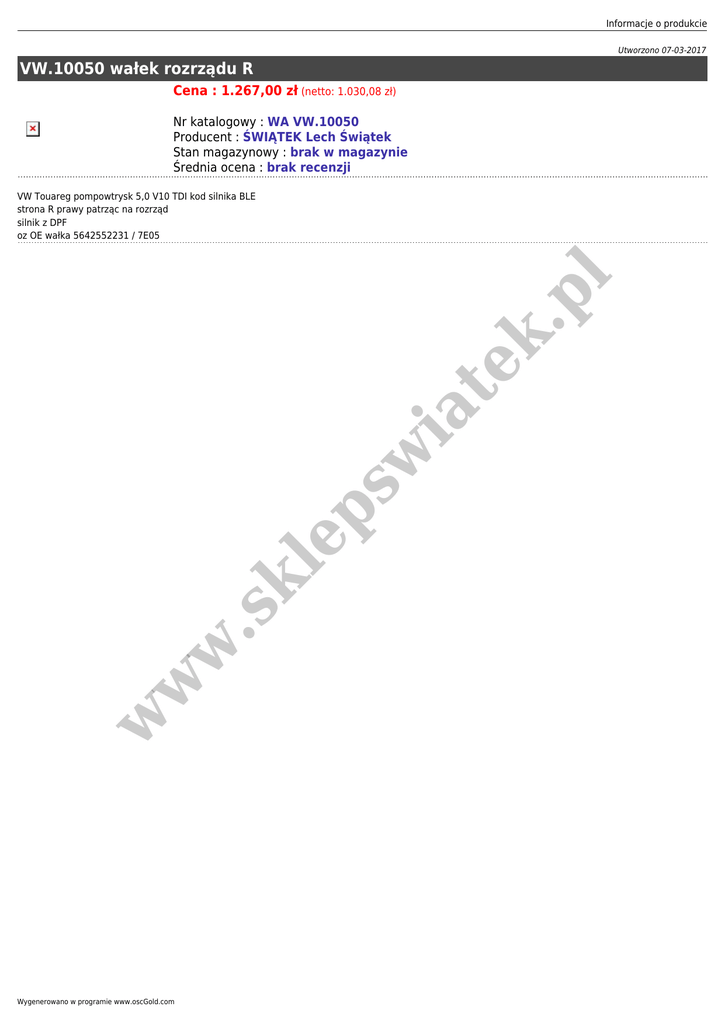 Informacje o produkcie Utworzono 07-03-2017 VW.10050 wałek rozrządu R Cena : 1.267,00 zł (netto: 1.030,08 zł) Nr katalogowy : WA VW.10050 Producent : ŚWIĄTEK Lech Świątek Stan magazynowy : brak w magazynie Średnia ocena : brak recenzji w w w .s kl ep sw ia te k. pl VW Touareg pompowtrysk 5,0 V10 TDI kod silnika BLE strona R prawy patrząc na rozrząd silnik z DPF oz OE wałka 5642552231 / 7E05 Wygenerowano w programie www.oscGold.com