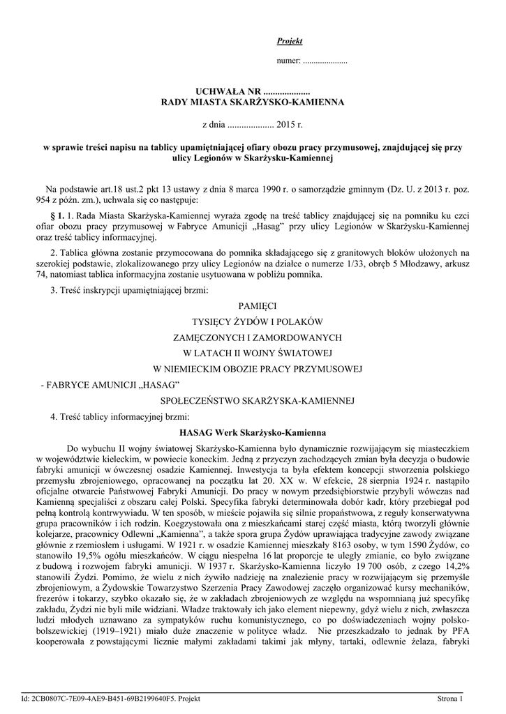 Projekt numer: ..................... UCHWAŁA NR .................... RADY MIASTA SKARŻYSKO-KAMIENNA z dnia .................... 2015 r. w sprawie treści napisu na tablicy upamiętniającej ofiary obozu pracy przymusowej, znajdującej się przy ulicy Legionów w Skarżysku-Kamiennej Na podstawie art.18 ust.2 pkt 13 ustawy z dnia 8 marca 1990 r. o samorządzie gminnym (Dz. U. z 2013 r. poz. 954 z późn. zm.), uchwala się co następuje: § 1. 1. Rada Miasta Skarżyska-Kamiennej wyraża zgodę na treść tablicy znajdującej się na pomniku ku czci ofiar obozu pracy przymusowej w Fabryce Amunicji „Hasag” przy ulicy Legionów w Skarżysku-Kamiennej oraz treść tablicy informacyjnej. 2. Tablica główna zostanie przymocowana do pomnika składającego się z granitowych bloków ułożonych na szerokiej podstawie, zlokalizowanego przy ulicy Legionów na działce o numerze 1/33, obręb 5 Młodzawy, arkusz 74, natomiast tablica informacyjna zostanie usytuowana w pobliżu pomnika. 3. Treść inskrypcji upamiętniającej brzmi: PAMIĘCI TYSIĘCY ŻYDÓW I POLAKÓW ZAMĘCZONYCH I ZAMORDOWANYCH W LATACH II WOJNY ŚWIATOWEJ W NIEMIECKIM OBOZIE PRACY PRZYMUSOWEJ - FABRYCE AMUNICJI „HASAG” SPOŁECZEŃSTWO SKARŻYSKA-KAMIENNEJ 4. Treść tablicy informacyjnej brzmi: HASAG Werk Skarżysko-Kamienna Do wybuchu II wojny światowej Skarżysko-Kamienna było dynamicznie rozwijającym się miasteczkiem w województwie kieleckim, w powiecie koneckim. Jedną z przyczyn zachodzących zmian była decyzja o budowie fabryki amunicji w ówczesnej osadzie Kamiennej. Inwestycja ta była efektem koncepcji stworzenia polskiego przemysłu zbrojeniowego, opracowanej na początku lat 20. XX w. W efekcie, 28 sierpnia 1924 r. nastąpiło oficjalne otwarcie Państwowej Fabryki Amunicji. Do pracy w nowym przedsiębiorstwie przybyli wówczas nad Kamienną specjaliści z obszaru całej Polski. Specyfika fabryki determinowała dobór kadr, który przebiegał pod pełną kontrolą kontrwywiadu. W ten sposób, w mieście pojawiła się silnie propaństwowa, z reguły konserwatywna grupa pracowników i ich rodzin. Koegzystowała ona z mieszkańcami starej część miasta, którą tworzyli głównie kolejarze, pracownicy Odlewni „Kamienna”, a także spora grupa Żydów uprawiająca tradycyjne zawody związane głównie z rzemiosłem i usługami. W 1921 r. w osadzie Kamiennej mieszkały 8163 osoby, w tym 1590 Żydów, co stanowiło 19,5% ogółu mieszkańców. W ciągu niespełna 16 lat proporcje te uległy zmianie, co było związane z budową i rozwojem fabryki amunicji. W 1937 r. Skarżysko-Kamienna liczyło 19 700 osób, z czego 14,2% stanowili Żydzi. Pomimo, że wielu z nich żywiło nadzieję na znalezienie pracy w rozwijającym się przemyśle zbrojeniowym, a Żydowskie Towarzystwo Szerzenia Pracy Zawodowej zaczęło organizować kursy mechaników, frezerów i tokarzy, szybko okazało się, że w zakładach zbrojeniowych ze względu na wspomnianą już specyfikę zakładu, Żydzi nie byli mile widziani. Władze traktowały ich jako element niepewny, gdyż wielu z nich, zwłaszcza ludzi młodych uznawano za sympatyków ruchu komunistycznego, co po doświadczeniach wojny polskobolszewickiej (1919–1921) miało duże znaczenie w polityce władz. Nie przeszkadzało to jednak by PFA kooperowała z powstającymi licznie małymi zakładami takimi jak młyny, tartaki, odlewnie żelaza, fabryki Id: 2CB0807C-7E09-4AE9-B451-69B2199640F5. Projekt Strona 1 pilników, gwoździ, osełek, dachówek czy farb, w których udziały mieli Żydzi. W 1935 r., w starej dzielnicy miasta, w samym sercu żydowskiej przestrzeni Skarżyska-Kamiennej stanęła nowa synagoga. Kilka lat później w tej samej dzielnicy został lokowany klasztor i kaplica zakonu franciszkanów. Współżycie Polaków i Żydów w tym robotniczym miasteczku – wyłączając kilka incydentów – przebiegało właściwie bezkonfliktowo. Wkroczenie armii niemieckiej do Skarżyska-Kamiennej 8 września 1939 r. oznaczało kres dawnego porządku nie tylko w mieście, ale i w fabryce amunicji. Firma będąca jeszcze do niedawna urzeczywistnieniem nowoczesnej myśli polskiego przemysłu zbrojeniowego, zaczęła powoli zmieniać się w „Hugo Schneider A.G (HASAG) Munitionsfabrik in Skarzisko Kamienna” – zakład, który stał się przyczyną i miejscem niewyobrażalnych cierpień tysięcy ludzi. Początki firmy HASAG sięgają 1863 r., kiedy Hugo Schneider przejął kierownictwo nad warsztatem zajmującym się produkcją lamp w Lipsku, zmieniając go z czasem w dobrze prosperujący zakład przemysłowy. Pod koniec lat 30. XX w., wykorzystując koniunkturę wojenną, przedsiębiorstwo zostało całkowicie przestawione na produkcję zbrojeniową. Zgodnie z dyrektywą gospodarczą III Rzeszy nakazującą wykorzystanie potencjału polskich fabryk zaanektowanych we wrześniu 1939 r., firma rozpoczęła poszerzanie strefy swoich wpływów. Koncern HASAG sprawował, od 30 listopada 1939 roku wspólnie z berlińską firmą Röchling, a od czerwca 1940 samodzielnie, zarząd komisaryczny nad skarżyską fabryką. W styczniu 1943 r., nastąpiło ostateczne przejęcie PFA, którą HASAG wykupił od władz Generalnego Gubernatorstwa za zaniżoną cenę 10 mln złotych (pod koniec lat 30. XX w. majątek PFA w Skarżysku-Kamiennej był szacowany na prawie 120 mln zł). Po przejęciu fabryki w 1939 r., pierwszym problemem nowego zarządu było skompletowanie załogi. Na wezwanie niemieckiej dyrekcji do podjęcia pracy zgłosiło się zaledwie 25% dawnych pracowników. W wyniku szykan Niemców, w obliczu coraz trudniejszych warunków życia, a zwłaszcza po wielkiej masowej egzekucji 360 osób spośród elity intelektualnej miasta w lesie Bór, w lutym 1940 r., bierny opór wobec okupanta osłabł. Polacy zaczęli podejmować pracę w fabryce w zupełnie odmiennych realiach organizacyjnych. Fabrykę podzielono na trzy oddzielne zakłady, nazywane przez Niemców Werkiem A, Werkiem B