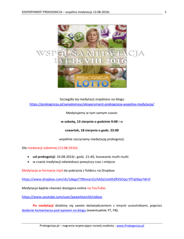 EKSPERYMENT PREKOGNICJA – wspólna medytacja 13.08.2016r. Szczegóły tej medytacji znajdziesz na blogu https://prekognicja.pl/swiadomosc/eksperyment-prekognicja-wspolna-medytacja/ Medytujemy w tym samym czasie: w sobotę, 13 sierpnia o godzinie 9:00 i w czwartek, 18 sierpnia o godz. 22:00 wspólnie zaczynamy medytację prekognicji. Dla medytacji sobotniej (13.08.2016): cel prekognicji: 16.08.2016r. godz. 21:40, losowanie multi multi w czasie medytacji odwiedzasz powyższy czas i miejsce Medytacja w formacie mp3 do pobrania z folderu na Dropbox https://www.dropbox.com/sh/1dega770knxyi15/AADj1Ue05ZRX5OqLrYfTqDbja?dl=0 Medytacja będzie również dostępna online na YouTube: https://www.youtube.com/user/pawelstan24/videos Po medytacji dzielimy się swoim doświadczeniem z innymi uczestnikami, poprzez dodanie komentarza pod wpisem na blogu (ewentualnie YT, FB). Prekognicja.pl – nagrania wspierające rozwój osobisty - www.Prekognicja.pl 1 EKSPERYMENT PREKOGNICJA – wspólna medytacja 13.08.2016r. Swoje wrażenia i refleksje prześlij również na [email protected] Założenia doświadczenia prekognicji: Czas płynie jednocześnie w kierunku Przyszłości i Przeszłości (fizyka kwantowa, buddyzm) Postrzeganie czasu związane jest ze świadomością Świadomość jest “ponadczasowa” i może “przemieszczać się” w czasie i poza czasem (prorocze sny, wizje, techniki dywinacyjne, regresja, itp. – różnice wynikają z kanału, poprzez który dociera informacja i sposobu jej interpretacji) Każdy ma wystarczające zdolności PRZYGOTOWANIE do eksperymentu wspólnej prekognicji 1) Sprawdź swoje przekonania na temat czasu i prekognicji (ewentualnie pieniędzy, zarabiania, wygrywania w grach liczbowych). Możesz to zrobić na zasadzie “wewnętrznego dialogu” ze swoją Podświadomością. Możesz również skorzystać z wahadełka, albo innej dobrej dla Ciebie metody komunikacji z Podświadomością. (Jeśli masz: skorzystaj z aktywnych “Afirmacji Prekognicji Lotto” – możesz ich po prostu słuchać, albo połączyć z oddechem.) 2) Widok maszyny losującej i losowanych liczb. W medytacji widzisz losowanie Multi Multi, maszynę losującą, losowane liczby. W związku z tym w Twojej pamięci powinien być utrwalony widok maszyny losującej i losowanych liczb. Ważne, żeby to były obrazy (albo inne przedstawienia, jeżeli bardziej postrzegasz świat słuchem czy czuciem, dlatego obejrzyj wcześniej losowanie (np. na stronie lotto.pl), zwróć uwagę na szczegóły maszyny, szczegóły wyglądu kulek, szczegóły losowania i zapamiętaj to. Sprawdź, czy potrafisz zobaczyć w wyobraźni losowane kule z numerami – zrób to kilka razy. Wspólna medytacja prowadzona Prekognicji Lotto - Przebieg 1. Medytacja dostępna na YouTube lub mp3 do pobrania https://www.dropbox.com/sh/1dega770knxyi15/AADj1Ue05ZRX5OqLrYfTqDbja?dl=0 2. Czas: sobota 13 sierpnia 2016r., godz. 9:00 3. Miejsce: komfortowe dla Ciebie, zapewniające spokój (wyłącz telefon, domofon, komunikatory w komputerze, itp.) 4. Pozycja: wygodna z prostym kręgosłupem, polecam leżącą (jeśli masz niski poziom energii witalnej, to możesz zasnąć). 5. Słuchawki: polecam. 6. W czasie medytacji odwiedzasz 16.08.2016r. godz. 21:40, losowanie MM 7. Po medytacji dodaj komentarz na blogu/YT i prześlij swoje efekty na [email protected] Prekognicja.pl – nagrania wspierające rozwój osobisty - www.Prekognicja.pl 2 EKSPERYMENT PREKOGNICJA – wspólna medytacja 13.08.2016r. Uwagi: Jeśli termin wspólnej medytacji jest dla Ciebie nieodpowiedni, to możesz medytować w dowolnym czasie przed 16.08.2016r. To medytacja dla 6 liczb. Ponieważ w MM jest losowanych 20 liczb – medytuj nie więcej niż 3 razy. Nie musisz dzielić się z innymi swoim doświadczeniem. Będzie mi miło, jeśli prześlesz mi swoje refleksje na [email protected] lub skomentujesz doświadczenie. Plik do pobrania jest z konta Dropbox – nie musisz się rejestrować, żeby go pobrać, ale jeśli chcesz, to możesz zarejestrować się z tego linka https://db.tt/FBVC0SMo, (bezpłatna rejestracja) Możliwe przeszkody i blokady wynikają z przekonań funkcjonujących w Podświadomości [http://youtu.be/oLotpGDpyms?t=1m] błędnej interpretacji informacji, albo „zmyślania” przez Podświadomość innych elementów (zależnych od indywidualnych predyspozycji) Jeżeli Twoja główna motywacja wiąże się z prekognicją, to większe znaczenie będą miały Twoje przekonania dotyczące czasu i prekognicji Jeżeli Twoja główna motywacja wiąże się z wygraną w lotto, to większe znaczenie będą miały przekonania dotyczące pieniędzy, pracy, zarabiania, wygrywania w grach, itp. Każda medytacja, to praca ze Świadomością, a więc efekty zależą od wrodzonych talentów, włożonej pracy i przekonań funkcjonujących w Tobie na temat tego, co możesz i nie możesz. “Prekognicja Lotto” nie jest maszynką do wygrywanie w lotto! To nagranie do uczenia Podświadomości korzystania z umiejętności prekognicji PREKOGNICJA pochodzi od łac. Pracognoscere i dosłownie oznacza “wiedzieć wcześniej”. W parapsychologii: prekognicją określa się zjawisko oznaczające wiedzę o zdarzeniach w przyszłości, której nie można wywieść z bieżącego stanu wiedzy. Szczegóły tego doświadczenia, tego eksperymentu znajdziesz na moim blogu http://prekognicja.pl/swiadomosc/eksperyment-prekognicja-wspolna-medytacja/ Wydarzenie na FB: https://www.facebook.com/events/1056765141087802/ Prekognicja.pl – nagrania wspierające rozwój osobisty - www.Prekognicja.pl 3 EKSPERYMENT PREKOGNICJA – wspólna medytacja 13.08.2016r. Prekognicja.pl – nagrania wspierające rozwój osobisty - www.Prekognicja.pl 4