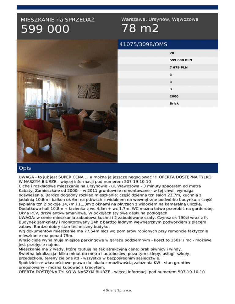MIESZKANIE na SPRZEDAŻ 599 000 Warszawa, Ursynów, Wąwozowa 78 m2 41075/3098/OMS 78 599 000 PLN 7 679 PLN 3 3 3 2000 Brick Opis UWAGA - to już jest SUPER CENA ... a można ją jeszcze negocjować !!! OFERTA DOSTĘPNA TYLKO W NASZYM BIURZE - więcej informacji pod numerem 507-19-10-10 Ciche i rozkładowe mieszkanie na Ursynowie - ul. Wąwozowa - 3 minuty spacerem od metra Kabaty. Zamieszkałe od 2000r - w 2011 gruntownie remontowane - w tej chwili wymaga odświeżenia. Bardzo dogodny rozkład mieszkania: część dzienna tzn salon 23,7m, kuchnia z jadalnią 10,8m i balkon ok 6m na pd/wsch z widokiem na wewnętrzne podwórko budynku;;; część sypialna tzn 2 pokoje 14,7m i 11,3m z oknami na płn/zach z widokiem na kameralną uliczkę. Dodatkowo hall 10,8m + łazienka z wc 4,5m + wc 1,7m. WC można łatwo przerobić na garderobę. Okna PCV, drzwi antywłamaniowe. W pokojach stylowe deski na podłogach. UWAGA: w cenie mieszkania zabudowa kuchni i 2 zabudowane szafy. Czynsz ok 790zł wraz z fr. Budynek zamknięty i monitorowany 24h z bardzo ładnym wewnętrznym podwórkiem z placem zabaw. Bardzo dobry stan techniczny budyku. Wg dokumentów mieszkanie ma 77,54m lecz wg pomiarów robionych przy remoncie faktycznie mieszkanie ma ponad 79m. Właściciele wynajmują miejsce parkingowe w garażu podziemnym - koszt to 150zł / mc - możliwe jest przejęcie najmu. Mieszkanie ma 2 wady, które rzutują na tak atrakcyjną cenę: brak piwnicy i windy. Świetna lokalizacja: kilka minut do metra i autobusów, poza tym sklepy, usługi, szkoły, przedszkola, tereny zielone itd - wszystko w bezpośrednim sąsiedztwie. Spółdzielcze własnościowe prawo do lokalu z możliwością założenia KW - stan gruntów uregulowany - można kupować z kredytem. OFERTA DOSTĘPNA TYLKO W NASZYM BIURZE - więcej informacji pod numerem 507-19-10-10 4 Ściany Sp. z o.o. Zamieszczona oferta nie stanowi oferty w rozumieniu Kodeksu Cywilnego. licencja 4355; Zapytaj naszego Agenta o pomoc w otrzymaniu kredytu !!! 4 Ściany Sp. z o.o. tel. 22 629 80 80 email: [email protected] 4 Ściany Sp. z o.o. Powered by TCPDF (www.tcpdf.org)