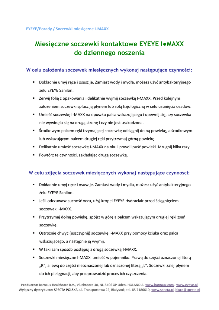 EYEYE/Porady / Soczewki miesięczne I-MAXX Miesięczne soczewki kontaktowe EYEYE I●MAXX do dziennego noszenia W celu założenia soczewek miesięcznych wykonaj następujące czynności: Dokładnie umyj ręce i osusz je. Zamiast wody i mydła, możesz użyć antybakteryjnego żelu EYEYE Sanilon. Zerwij folię z opakowania i delikatnie wyjmij soczewkę I-MAXX. Przed kolejnym założeniem soczewki spłucz ją płynem lub solą fizjologiczną w celu usunięcia osadów. Umieść soczewkę I-MAXX na opuszku palca wskazującego i upewnij się, czy soczewka nie wywinęła się na drugą stronę i czy nie jest uszkodzona. Środkowym palcem ręki trzymającej soczewkę odciągnij dolną powiekę, a środkowym lub wskazującym palcem drugiej ręki przytrzymaj górną powiekę. Delikatnie umieść soczewkę I-MAXX na oku i powoli puść powieki. Mrugnij kilka razy. Powtórz te czynności, zakładając drugą soczewkę. W celu zdjęcia soczewek miesięcznych wykonaj następujące czynności: Dokładnie umyj ręce i osusz je. Zamiast wody i mydła, możesz użyć antybakteryjnego żelu EYEYE Sanilon. Jeśli odczuwasz suchość oczu, użyj kropel EYEYE Hydraclair przed ściągnięciem soczewek I-MAXX. Przytrzymaj dolną powiekę, spójrz w górę a palcem wskazującym drugiej ręki zsuń soczewkę. Ostrożnie chwyć (uszczypnij) soczewkę I-MAXX przy pomocy kciuka oraz palca wskazującego, a następnie ją wyjmij. W taki sam sposób postępuj z drugą soczewką I-MAXX. Soczewki miesięczne I-MAXX umieść w pojemniku. Prawą do części oznaczonej literą „R”, a lewą do części nieoznaczonej lub oznaczonej literą „L”. Soczewki zalej płynem do ich pielęgnacji, aby przeprowadzić proces ich czyszczenia. Producent: Barnaux Healthcare B.V., Vluchtoord 38, NL-5406 XP Uden, HOLANDIA. www.barnaux.com, www.eyeye.pl Wyłączny dystrybutor: SPECTA POLSKA, ul. Transportowa 22, Białystok, tel. 85 7186610, www.specta.pl, [email protected]