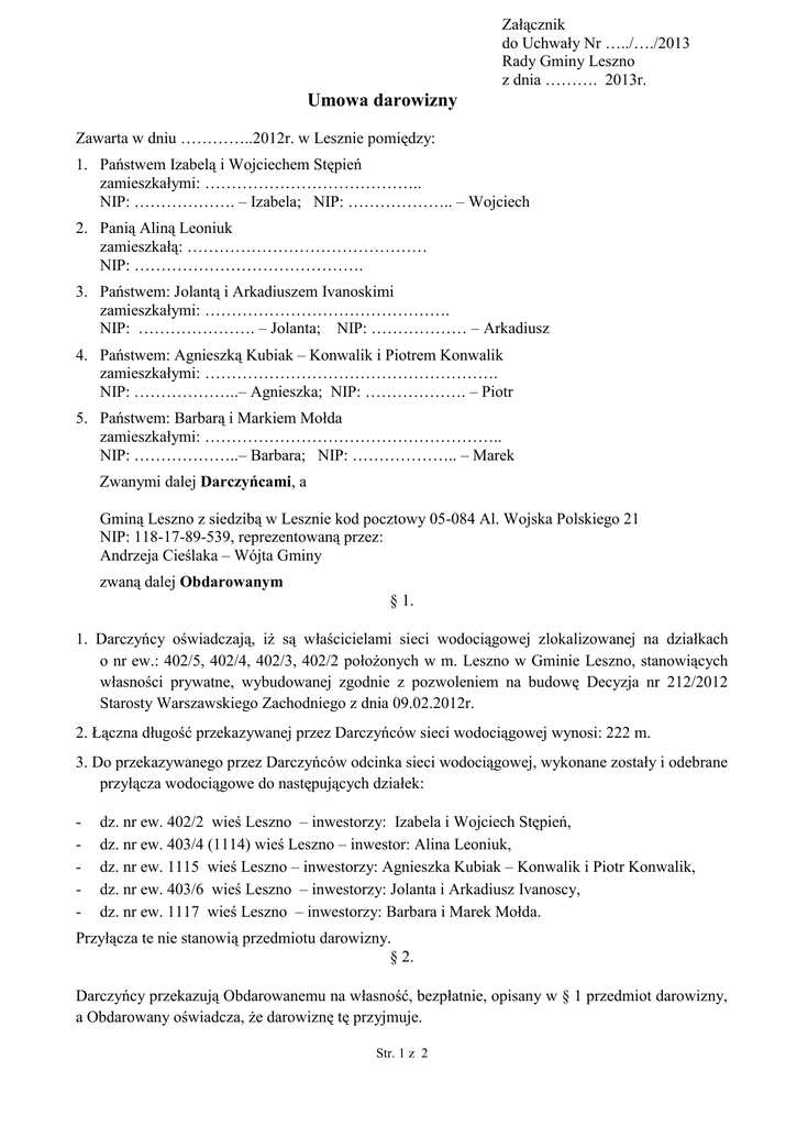 Załącznik do Uchwały Nr …../…./2013 Rady Gminy Leszno z dnia ………. 2013r. Umowa darowizny Zawarta w dniu …………..2012r. w Lesznie pomiędzy: 1. Państwem Izabelą i Wojciechem Stępień zamieszkałymi: ………………………………….. NIP: ………………. – Izabela; NIP: ……………….. – Wojciech 2. Panią Aliną Leoniuk zamieszkałą: ……………………………………… NIP: ……………………………………. 3. Państwem: Jolantą i Arkadiuszem Ivanoskimi zamieszkałymi: ………………………………………. NIP: …………………. – Jolanta; NIP: ……………… – Arkadiusz 4. Państwem: Agnieszką Kubiak – Konwalik i Piotrem Konwalik zamieszkałymi: ………………………………………………. NIP: ………………..– Agnieszka; NIP: ………………. – Piotr 5. Państwem: Barbarą i Markiem Mołda zamieszkałymi: ……………………………………………….. NIP: ………………..– Barbara; NIP: ……………….. – Marek Zwanymi dalej Darczyńcami, a Gminą Leszno z siedzibą w Lesznie kod pocztowy 05-084 Al. Wojska Polskiego 21 NIP: 118-17-89-539, reprezentowaną przez: Andrzeja Cieślaka – Wójta Gminy zwaną dalej Obdarowanym § 1. 1. Darczyńcy oświadczają, iż są właścicielami sieci wodociągowej zlokalizowanej na działkach o nr ew.: 402/5, 402/4, 402/3, 402/2 położonych w m. Leszno w Gminie Leszno, stanowiących własności prywatne, wybudowanej zgodnie z pozwoleniem na budowę Decyzja nr 212/2012 Starosty Warszawskiego Zachodniego z dnia 09.02.2012r. 2. Łączna długość przekazywanej przez Darczyńców sieci wodociągowej wynosi: 222 m. 3. Do przekazywanego przez Darczyńców odcinka sieci wodociągowej, wykonane zostały i odebrane przyłącza wodociągowe do następujących działek: - dz. nr ew. 402/2 wieś Leszno – inwestorzy: Izabela i Wojciech Stępień, dz. nr ew. 403/4 (1114) wieś Leszno – inwestor: Alina Leoniuk, dz. nr ew. 1115 wieś Leszno – inwestorzy: Agnieszka Kubiak – Konwalik i Piotr Konwalik, dz. nr ew. 403/6 wieś Leszno – inwestorzy: Jolanta i Arkadiusz Ivanoscy, dz. nr ew. 1117 wieś Leszno – inwestorzy: Barbara i Marek Mołda. Przyłącza te nie stanowią przedmiotu darowizny. § 2. Darczyńcy przekazują Obdarowanemu na własność, bezpłatnie, opisany w § 1 przedmiot darowizny, a Obdarowany oświadcza, że darowiznę tę przyjmuje. Str. 1 z 2 § 3. Wartość przedmiotu darowizny (bez wartości przyłączy) strony określają w wysokości: 31537,00 zł słownie: trzydzieści jeden tysięcy pięćset trzydzieści siedem złotych zero groszy. §4. Darczyńcy oświadczają, że przedmiot darowizny wolny jest od wad prawnych i fizycznych. §5. 1. Wydanie darowizny następuje w momencie podpisania umowy. 2. Wraz z przedmiotem darowizny Darczyńcy przekazują Obdarowanemu następujące dokumenty: - oryginał projektu budowlanego wykonawczego, - kosztorys wykonawcy wodociągu, - ksero wniosku o pozwolenie na budowę, - oryginał decyzji nr 212/2012 z dnia 09.02.2012r. Starosty Warszawskiego Zachodniego – pozwolenie na budowę, - oryginał protokołu odbioru sieci i, poświadczone za zgodność z oryginałem, kserokopie protokołów odbioru wykonanych przyłączy wodociągowych, - oryginał dziennika budowy nr 282/12 wydanego w dniu 09.02.2012r., - oryginał pozwolenia przez PINB na użytkowanie wodociągu z dnia 22.08.2012r., - geodezyjna inwentaryzacja powykonawcza, - atesty na zastosowane materiały, - oryginał sprawozdania z badań próbki wody pobranej z wodociągu po płukaniu, - komplet opłaconych faktury za realizację sieci. 3. Integralną część dokumentacji związanej z wykonaniem przedmiotu darowizny stanowią dokumenty i pisma wystawiane przez Gminę Leszno. §6. Umowę sporządzono w …. jednobrzmiących egzemplarzach po jednym dla każdej ze stron. ………………….…………………………………....... Darczyńcy ………………………… Obdarowany Str. 2 z 2