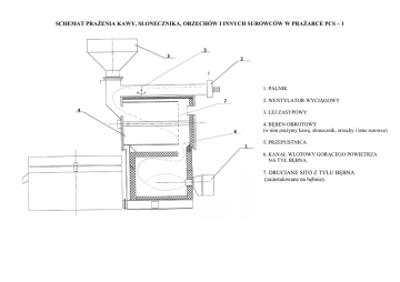 SCHEMAT PRAŻENIA KAWY, SŁONECZNIKA, ORZECHÓW I INNYCH SUROWCÓW W PRAŻARCE PCS – 1 1. PALNIK 2. WENTYLATOR WYCIĄGOWY 3. LEJ ZASYPOWY 4. BĘBEN OBROTOWY (w nim prażymy kawę, słonecznik, orzechy i inne surowce) 5. PRZEPUSTNICA 6. KANAŁ WLOTOWY GORĄCEGO POWIETRZA NA TYŁ BĘBNA. 7. DRUCIANE SITO Z TYŁU BĘBNA (zainstalowane na bębnie). Opis działania prażarki do kawy Jest urządzeniem, w którym następuje właściwy proces prażenia kawy. Głównym podzespołem prażarki jest obrotowy bęben wykonany ze stali żaro i kwasoodpornej. Bęben jest napędzany poprzez przekładnię łańcuchową motoreduktorem z płynną regulacją obrotów. W dolnej części prażarki, pod bębnem, zainstalowany jest palnik na gaz lub olej opałowy. Palnik jest wyposażony we własną automatykę, system zabezpieczeń i blokad. Uruchomienie palnika następuje w sekwencji po uprzednim włączeniu bębna i wentylatora prażarki. Pracą palnika steruje regulator zainstalowany w szafie sterowniczej linii do prażenia, który w miarę potrzeby zwiększa lub zmniejsza ilość podawanego paliwa do palnika dzięki czemu temperatura prażenia surowca jest utrzymywana w wymaganym zakresie. Gorące spaliny z palnika ogrzewają od dołu obracający się bęben z zasypaną kawą, a następnie poprzez sitową ścianę tylną nagrzewają ją bezpośrednio. Czas prażenia porcji kawy w bębnie prażarki jest zależny od gatunku i rodzaju prażonej kawy, jednak nie powinien przekraczać 20 minut. Temperaturę nagrzania kawy wskazuje miernik temperatury w szafce sterowniczej linii do prażenia, współpracujący z czujnikiem umieszczonym w przedniej ściance bębna prażarki. W ścianie tej znajduje się też wziernik umożliwiający wzrokową ocenę stopnia uprażenia kawy, jak również próbnik umożliwiający pobieranie próbki kawy podczas procesu prażenia z wnętrza bębna i jej dokładną ocenę. Po wyprażeniu porcji kawy należy otworzyć ręczną klapę w ścianie przedniej prażarki i wysypać wyprażoną kawę na ustawione pod klapą sito chłodnicy.