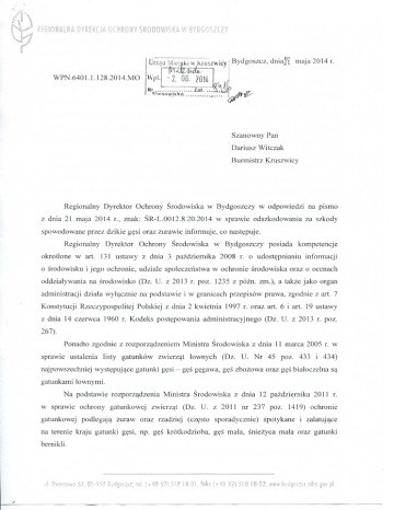 i&LNA (El AOCHROMYSRODOW1S1 Cu'aa Miejski w Kruszwicy! Bydgoszcz, dniajff maja 2014 r. WPN.6401.1.128.2014.MO Szanowny Pan Dariusz Witczak Burmistrz Kruszwicy Regionalny Dyrektor Ochrony Srodowiska w Bvdgoszczy w odpowiedzi na pismo z dnia 21 maja 2014 r., znak: SR-L.0012.8.20.2014 w sprawie odszkodowania za szkody spowodowane przez dzikie gesi oraz zurawie informuje, co nast9puje. Regionalny Dyrektor Ochrony Srodowiska w Bydgoszczy posiada kompetencje okreslone w art. 131 ustawy z dnia 3 pazdziernika 2008 r. o udostepnianiu informacji o srodowisku i jego ochronie, udziale spoleczelistwa w ochronie srodowiska oraz o ocenach oddzialywania na srodowisko (Dz. U. z 2013 r. poz. 1235 z pozn. zm.), a takze jako organ administracji dziala wylacznie na podstawie i w granicach przepisow prawa, zgodnie z art. 7 Konstytucji Rzeczypospolitej Polskiej z dnia 2 kwietnia 1997 r. oraz art. 6 i art. 19 ustawy z dnia 14 czerwca 1960 r. Kodeks postepowania administracyjnego (Dz. U. z 2013 r. poz. 267). Ponadto zgodnie z rozporz^dzeniem Ministra Srodowiska z dnia 11 marca 2005 r. w sprawie ustalenia listy gatunkow zwierzat lownych (Dz. U. Nr 45 poz. 433 i 434) najpowszechniej wystepuj^ce gatunki gesi - ges gegawa, ges zbozowa oraz ges bialoczelna 53 gatunkami lownymi. Na podstawie rozporz^dzenia Ministra Srodowiska z dnia 12 pazdziernika 2011 r. w sprawie ochrony gatunkowej zwierzat (Dz. U. z 2011 nr 237 poz. 1419) ochronie gatunkowej podlegaj^ zuraw oraz rzadziej (czesto sporadycznie) spotykane i zalatujace na terenie kraju gatunki gesi, np. ges krotkodzioba, ges mala, sniezyca mala oraz gatunki bernikli. ul DworcDwo 63, 85-950 Bydgoszcz; tsL (+48 5?} 5! 8 18 91, foh ( + 48 52) 518 18 02, www bydgoszcz rdos gov pi W mysl art. 126 ust. 1 ustawy z dnia 16 kwietnia 2004 roku o ochronie przyrody (Dz. U. z 2013 r., poz. 627 z pozn. zm.) Skarb Panstwa odpowiada za szkody wyrz^dzone przez zubra, wilka, rysia, niedzwiedzia oraz bobra europejskicgo. W zwiazku z powyzszym, w przypadku innych gatunkow odszkodowanie ze strony Skarbu Panstwa za wyrz^dzone szkody, zgodnie z ustawa o ochronie przyrody. nie przystuguje. Wzgledem gatunkow lownych, takich jak ges gegawa, g$s bialoczelna oraz ges zbozowa zastosowanie maja przepisy ustawy z dnia 13 pazdziernika 1995 r. Prawo lowieckie (Dz. U. z 2013 r. poz. 1226). Zgodnie z art. 46 ww. ustawy dzierzawca lub zarzadca obwodu lowieckiego obowiazany jest do wynagradzania szkod wyrzadzonych w uprawach i plodach rolnych przez dziki, losie, jelenie, daniele i sarny. Jednoczesnie informuje, ze w stosunku do gatunkow lownych obowi^zuja zakazy m.in. ploszenia, chwytania, przetrzymywania i zabijania zwierzyny (poza polowaniami i odlowami, sprawdzianami pracy psow mysliwskich, a takze szkoleniami ptakow lowczych i psow mysliwskich, organizowanymi przez Polski Zwi^zek Lowiecki). Nadmieniam, ze zgodnie z art. 9a ww. ustawy organem wlasciwym w zakresie odstepstwa od zakazu ploszenia zwierzat lownych jest wlasciwy miejscowo marszalek wojewodztwa, ktory po zasi^gnieciu opinii Polskiego Zwiazku Lowieckiego, moze \vydac stosownq zgod^. W odniesieniu do gatunkow objetych ochrona zastosowanie znajduja zakazy okreslonc w art. 52 ustawy o ochronie przyrody, w tym ploszenia, chwytania, przetrzymywania i zabijania osobnikow. Nadmieniam, ze w celu ograniczenia szkod w uprawach, mozliwe jest podejmowanie ptoszenia, po uprzednim uzyskaniu zezwolenia wtasciwego miejscowo regionalnego dyrektora ochrony srodowiska na podstawie art. 56 ustawy o ochronie przyrody NaczefmkWydziaiu Gcluony Przyrody i Qbszarow Natura 2000 Otrzymuj^: 1. Adresat 2. a/a Kontakt w sprawie z Panem Mitoszem Owiesny pod numerem telefonu 052 55 11 350 do 362, wew. 6026.