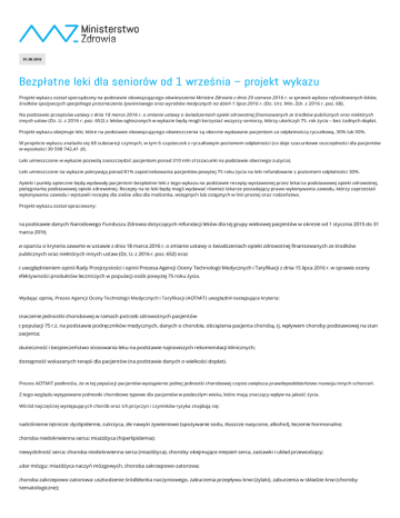 01.08.2016 Bezpłatne leki dla seniorów od 1 września – projekt wykazu Projekt wykazu został sporządzony na podstawie obowiązującego obwieszczenia Ministra Zdrowia z dnia 29 czerwca 2016 r. w sprawie wykazu refundowanych leków, środków spożywczych specjalnego przeznaczenia żywieniowego oraz wyrobów medycznych na dzień 1 lipca 2016 r. (Dz. Urz. Min. Zdr. z 2016 r. poz. 68). Na podstawie przepisów ustawy z dnia 18 marca 2016 r. o zmianie ustawy o świadczeniach opieki zdrowotnej finansowanych ze środków publicznych oraz niektórych innych ustaw (Dz. U. z 2016 r. poz. 652) z leków ogłoszonych w wykazie będą mogli korzystać wszyscy seniorzy, którzy ukończyli 75. rok życia – bez żadnych dopłat. Projekt wykazu obejmuje leki, które na podstawie obowiązującego obwieszczenia są obecnie wydawane pacjentom za odpłatnością ryczałtową, 30% lub 50%. W projekcie wykazu znalazło się 68 substancji czynnych, w tym 6 cząsteczek z ryczałtowym poziomem odpłatności (co daje szacunkowe oszczędności dla pacjentów w wysokości 30 598 742,41 zł). Leki umieszczone w wykazie pozwolą zaoszczędzić pacjentom ponad 310 mln zł (szacunki na podstawie obecnego zużycia). Leki umieszczone na wykazie pokrywają ponad 81% zapotrzebowania pacjentów powyżej 75 roku życia na leki refundowane z poziomem odpłatności 30%. Apteki i punkty apteczne będą wydawały pacjentom bezpłatnie leki z tego wykazu na podstawie recepty wystawionej przez lekarza podstawowej opieki zdrowotnej, pielęgniarkę podstawowej opieki zdrowotnej. Recepty na te leki będą mogli wydawać również lekarze posiadający prawo wykonywania zawodu, którzy zaprzestali wykonywania zawodu i wystawili receptę dla siebie albo dla małżonka, wstępnych lub zstępnych w linii prostej oraz rodzeństwa. Projekt wykazu został opracowany: na podstawie danych Narodowego Funduszu Zdrowia dotyczących refundacji leków dla tej grupy wiekowej pacjentów w okresie od 1 stycznia 2015 do 31 marca 2016; w oparciu o kryteria zawarte w ustawie z dnia 18 marca 2016 r. o zmianie ustawy o świadczeniach opieki zdrowotnej finansowanych ze środków publicznych oraz niektórych innych ustaw (Dz. U. z 2016 r. poz. 652) oraz z uwzględnieniem opinii Rady Przejrzystości i opinii Prezesa Agencji Oceny Technologii Medycznych i Taryfikacji z dnia 15 lipca 2016 r. w sprawie oceny efektywności produktów leczniczych w populacji osób powyżej 75 roku życia. Wydając opinię, Prezes Agencji Oceny Technologii Medycznych i Taryfikacji (AOTMiT) uwzględnił następujące kryteria: znaczenie jednostki chorobowej w ramach potrzeb zdrowotnych pacjentów z populacji 75 r.ż. na podstawie podręczników medycznych, danych o chorobie, obciążenia pacjenta chorobą, tj. wpływem choroby podstawowej na stan pacjenta; skuteczność i bezpieczeństwo stosowania leku na podstawie najnowszych rekomendacji klinicznych; dostępność wskazanych terapii dla pacjentów (na podstawie danych o wielkości dopłat). Prezes AOTMiT podkreśla, że w tej populacji pacjentów wystąpienie jednej jednostki chorobowej często zwiększa prawdopodobieństwo rozwoju innych schorzeń. Z tego względu wytypowano jednostki chorobowe typowe dla pacjentów w podeszłym wieku, które mają znaczący wpływ na jakość życia. Wśród najczęściej występujących chorób oraz ich przyczyn i czynników ryzyka znajdują się: nadciśnienie tętnicze: dyslipidemie, cukrzyca, złe nawyki żywieniowe (spożywanie sodu, tłuszcze nasycone, alkohol), leczenie hormonalne; choroba niedokrwienna serca: miażdżyca (hiperlipidemia); niewydolność serca: choroba niedokrwienna serca (miażdżyca), choroby obejmujące mięsień serca, zastawki i układ przewodzący; udar mózgu: miażdżyca naczyń mózgowych, choroba zakrzepowo-zatorowa; choroba zakrzepowo-zatorowa: uszkodzenie śródbłonka naczyniowego, zaburzenia przepływu krwi (żylaki), zaburzenia w składzie krwi (choroby hematologiczne); astma: procesy zapalne u osób podatnych, ze zwiększoną reaktywnością dróg oddechowych na bodźce; POCHP (przewlekła obturacyjna choroba płuc, obejmuje przewlekłe zapalenie oskrzeli i rozedmę): nieprawidłowa odpowiedź zapalna płuc na szkodliwe cząstki i gazy, które skutkuje postępującym, nie w pełni odwracalnym ograniczeniem przepływu powietrza przez drogi oddechowe; cukrzyca: zmniejszenie wydzielania insuliny, insulinooporność, zmniejszenie masy mięśniowej; depresja, przyczyny endogenne (choroba afektywna), psychologiczne (depresje reaktywne) i somatyczne (nadciśnienie tętnicze, choroba niedokrwienna serca, zawał serca, operacje, urazy); otępienie: zmiany zwyrodnieniowe typu alzheimerowskiego, choroby naczyniowe (miażdżyca), choroba Parkinsona. Prezes AOTMiT oraz Rada Przejrzystości zgłosili następujące uwagi dotyczące bezpieczeństwa i skuteczności niektórych leków, które są przepisywane seniorom: antybiotyki i chemioterapeutyki, w tym fluorochinolony – zaleca się najwyższą ostrożność w kwestii wypisywania na bezpłatne recepty osobom po 75 r.ż. ww. leków, które powinny być dostępne tylko w leczeniu powikłanych zapaleń układu moczowo-płciowego i – u mężczyzn – przewlekłego leczenia gruczołu krokowego; leki stosowane w osteoporozie: kwas alendronowy – wytyczne wskazują na skuteczność i efektywność kosztową leku w prewencji i leczeniu osteoporozy. Alendronian jest najtańszym preparatem z grupy bisfosfonianów. Jest on, obok innych bisfosfonianów, pierwszą linią leczenia złamań osteoporotycznych i zapobiegania następnym. Wprawdzie siła rekomendacji I A nie odnosi się bezpośrednio do stosowania go u ludzi 75+, ale częstość złamań osteoporotycznych rośnie z wiekiem. Stosowany raz w tygodniu jest dość wygodnym lekiem dla starszych ludzi. Jednocześnie, u kobiet 80+ skuteczność profilaktycznie stosowanych bisfosfonianów jest ograniczona. Po odstawieniu bisfosfonianów gęstość mineralna kości nie 
