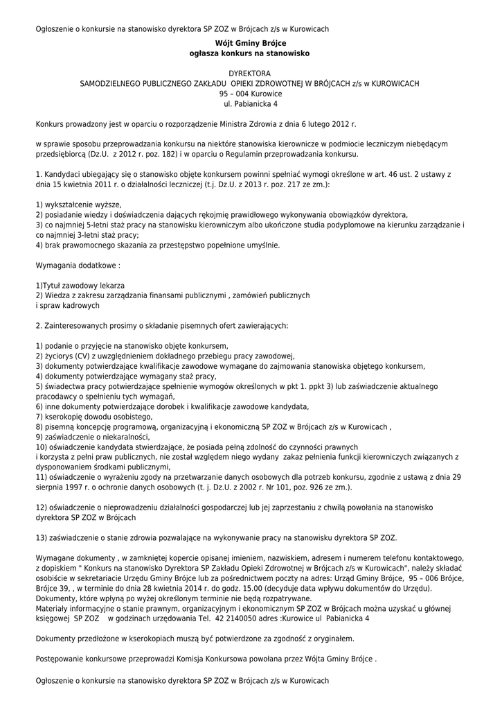 Ogłoszenie o konkursie na stanowisko dyrektora SP ZOZ w Brójcach z/s w Kurowicach Wójt Gminy Brójce ogłasza konkurs na stanowisko DYREKTORA SAMODZIELNEGO PUBLICZNEGO ZAKŁADU OPIEKI ZDROWOTNEJ W BRÓJCACH z/s w KUROWICACH 95 – 004 Kurowice ul. Pabianicka 4 Konkurs prowadzony jest w oparciu o rozporządzenie Ministra Zdrowia z dnia 6 lutego 2012 r. w sprawie sposobu przeprowadzania konkursu na niektóre stanowiska kierownicze w podmiocie leczniczym niebędącym przedsiębiorcą (Dz.U. z 2012 r. poz. 182) i w oparciu o Regulamin przeprowadzania konkursu. 1. Kandydaci ubiegający się o stanowisko objęte konkursem powinni spełniać wymogi określone w art. 46 ust. 2 ustawy z dnia 15 kwietnia 2011 r. o działalności leczniczej (t.j. Dz.U. z 2013 r. poz. 217 ze zm.): 1) wykształcenie wyższe, 2) posiadanie wiedzy i doświadczenia dających rękojmię prawidłowego wykonywania obowiązków dyrektora, 3) co najmniej 5-letni staż pracy na stanowisku kierowniczym albo ukończone studia podyplomowe na kierunku zarządzanie i co najmniej 3-letni staż pracy; 4) brak prawomocnego skazania za przestępstwo popełnione umyślnie. Wymagania dodatkowe : 1)Tytuł zawodowy lekarza 2) Wiedza z zakresu zarządzania finansami publicznymi , zamówień publicznych i spraw kadrowych 2. Zainteresowanych prosimy o składanie pisemnych ofert zawierających: 1) podanie o przyjęcie na stanowisko objęte konkursem, 2) życiorys (CV) z uwzględnieniem dokładnego przebiegu pracy zawodowej, 3) dokumenty potwierdzające kwalifikacje zawodowe wymagane do zajmowania stanowiska objętego konkursem, 4) dokumenty potwierdzające wymagany staż pracy, 5) świadectwa pracy potwierdzające spełnienie wymogów określonych w pkt 1. ppkt 3) lub zaświadczenie aktualnego pracodawcy o spełnieniu tych wymagań, 6) inne dokumenty potwierdzające dorobek i kwalifikacje zawodowe kandydata, 7) kserokopię dowodu osobistego, 8) pisemną koncepcję programową, organizacyjną i ekonomiczną SP ZOZ w Brójcach z/s w Kurowicach , 9) zaświadczenie o niekaralności, 10) oświadczenie kandydata stwierdzające, że posiada pełną zdolność do czynności prawnych i korzysta z pełni praw publicznych, nie został względem niego wydany zakaz pełnienia funkcji kierowniczych związanych z dysponowaniem środkami publicznymi, 11) oświadczenie o wyrażeniu zgody na przetwarzanie danych osobowych dla potrzeb konkursu, zgodnie z ustawą z dnia 29 sierpnia 1997 r. o ochronie danych osobowych (t. j. Dz.U. z 2002 r. Nr 101, poz. 926 ze zm.). 12) oświadczenie o nieprowadzeniu działalności gospodarczej lub jej zaprzestaniu z chwilą powołania na stanowisko dyrektora SP ZOZ w Brójcach 13) zaświadczenie o stanie zdrowia pozwalające na wykonywanie pracy na stanowisku dyrektora SP ZOZ. Wymagane dokumenty , w zamkniętej kopercie opisanej imieniem, nazwiskiem, adresem i numerem telefonu kontaktowego, z dopiskiem " Konkurs na stanowisko Dyrektora SP Zakładu Opieki Zdrowotnej w Brójcach z/s w Kurowicach", należy składać osobiście w sekretariacie Urzędu Gminy Brójce lub za pośrednictwem poczty na adres: Urząd Gminy Brójce, 95 – 006 Brójce, Brójce 39, , w terminie do dnia 28 kwietnia 2014 r. do godz. 15.00 (decyduje data wpływu dokumentów do Urzędu). Dokumenty, które wpłyną po wyżej określonym terminie nie będą rozpatrywane. Materiały informacyjne o stanie prawnym, organizacyjnym i ekonomicznym SP ZOZ w Brójcach można uzyskać u głównej księgowej SP ZOZ w godzinach urzędowania Tel. 42 2140050 adres :Kurowice ul Pabianicka 4 Dokumenty przedłożone w kserokopiach muszą być potwierdzone za zgodność z oryginałem. Postępowanie konkursowe przeprowadzi Komisja Konkursowa powołana przez Wójta Gminy Brójce . Ogłoszenie o konkursie na stanowisko dyrektora SP ZOZ w Brójcach z/s w Kurowicach Ogłoszenie o konkursie na stanowisko dyrektora SP ZOZ w Brójcach z/s w Kurowicach O terminie rozmów kwalifikacyjnych kandydaci zostaną powiadomieni indywidualnie telefonicznie lub pisemnie (lub e-mailowo). Przewidywany termin rozpatrzenia zgłoszonych kandydatur - do 30 dni od ostatniego dnia składania ofert. Z wybranym kandydatem zostanie nawiązany stosunek pracy na podstawie powołania, zgodnie z art. 47 ustawy o działalności leczniczej. Informacja o wynikach konkursu podana zostanie do publicznej wiadomości w Biuletynie Informacji Publicznej Urzędu Gminy Brójce: bip.brojce.pl oraz na tablicy informacyjnej w siedzibie Urzędu Gminy Brójce i w SP ZOZ w Brójcach z/s w Kurowicach. Wójt Gminy Brójce Władysław Glubowski Ogłoszenie o konkursie na stanowisko dyrektora SP ZOZ w Brójcach z/s w Kurowicach