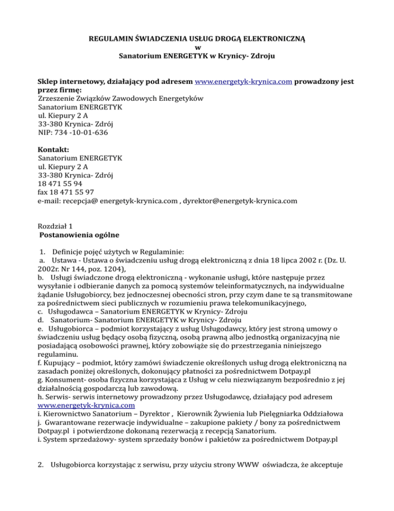 REGULAMIN ŚWIADCZENIA USŁUG DROGĄ ELEKTRONICZNĄ w Sanatorium ENERGETYK w Krynicy- Zdroju Sklep internetowy, działający pod adresem www.energetyk-krynica.com prowadzony jest przez firmę: Zrzeszenie Związków Zawodowych Energetyków Sanatorium ENERGETYK ul. Kiepury 2 A 33-380 Krynica- Zdrój NIP: 734 -10-01-636 Kontakt: Sanatorium ENERGETYK ul. Kiepury 2 A 33-380 Krynica- Zdrój 18 471 55 94 fax 18 471 55 97 e-mail: recepcja@ energetyk-krynica.com , [email protected] Rozdział 1 Postanowienia ogólne 1. Definicje pojęć użytych w Regulaminie: a. Ustawa - Ustawa o świadczeniu usług drogą elektroniczną z dnia 18 lipca 2002 r. (Dz. U. 2002r. Nr 144, poz. 1204), b. Usługi świadczone drogą elektroniczną - wykonanie usługi, które następuje przez wysyłanie i odbieranie danych za pomocą systemów teleinformatycznych, na indywidualne żądanie Usługobiorcy, bez jednoczesnej obecności stron, przy czym dane te są transmitowane za pośrednictwem sieci publicznych w rozumieniu prawa telekomunikacyjnego, c. Usługodawca – Sanatorium ENERGETYK w Krynicy- Zdroju d. Sanatorium- Sanatorium ENERGETYK w Krynicy- Zdroju e. Usługobiorca – podmiot korzystający z usług Usługodawcy, który jest stroną umowy o świadczeniu usług będący osobą fizyczną, osobą prawną albo jednostką organizacyjną nie posiadającą osobowości prawnej, który zobowiąże się do przestrzegania niniejszego regulaminu. f. Kupujący – podmiot, który zamówi świadczenie określonych usług drogą elektroniczną na zasadach poniżej określonych, dokonujący płatności za pośrednictwem Dotpay.pl g. Konsument- osoba fizyczna korzystająca z Usług w celu niezwiązanym bezpośrednio z jej działalnością gospodarczą lub zawodową. h. Serwis- serwis internetowy prowadzony przez Usługodawcę, działający pod adresem www.energetyk-krynica.com i. Kierownictwo Sanatorium – Dyrektor , Kierownik Żywienia lub Pielęgniarka Oddziałowa j. Gwarantowane rezerwacje indywidualne – zakupione pakiety / bony za pośrednictwem Dotpay.pl i potwierdzone dokonaną rezerwacją z recepcją Sanatorium. i. System sprzedażowy- system sprzedaży bonów i pakietów za pośrednictwem Dotpay.pl 2. Usługobiorca korzystając z serwisu, przy użyciu strony WWW oświadcza, że akceptuje warunki regulaminu bez konieczności sporządzenia odrębnej umowy. Rozdział 2 Ogólne warunki świadczenia usług drogą elektroniczną. 1. Usługodawca świadczy usługi na rzecz Usługobiorcy w zakresie i na warunkach określonych w niniejszym regulaminie. 2. Regulamin ten jest regulaminem, o którym mowa w art. 8 ustawy z dnia 18 lipca 2002 r. o świadczeniu usług drogą elektroniczną, udostępnianym nieodpłatnie Usługobiorcom przed zawarciem umowy. Regulamin został umieszczony przez Usługodawcę na stronach Serwisu w sposób, który umożliwia pozyskanie, odtwarzanie i utrwalanie treści Regulaminu za pomocą systemu teleinformatycznego, którym posługuje się Usługobiorca. 3. Usługodawca zobowiązuje się świadczyć usługi zgodnie z Regulaminem. 4. Usługobiorca zobowiązuje się do przestrzegania niniejszego regulaminu. 5. Zaznaczenie opcji „Zapoznałem się i akceptuję Regulamin świadczenia usług drogą elektroniczną ” oznacza, iż Kupujący zapoznał się z Regulamin świadczenia usług drogą elektroniczną w Sanatorium ENERGETYK w Krynicy - Zdroju, rozumie jego postanowienia, wyraża zgodę na warunki w nim umieszczone oraz akceptuje warunki wybranej oferty. Brak takiej akceptacji spowoduje brak możliwości skorzystania z usług świadczonych przez Usługodawcę drogą elektroniczną. 6. Rozpoczęciem korzystania z usługi w przypadku usług dostępnych w oparciu o informacje podane przez Usługobiorcę jest przesłanie Usługodawcy wypełnionego formularza zawierającego te informacje. Usługobiorca jest zobowiązany do podawania kompletnych i rzetelnych informacji. 7. Usługodawca zastrzega sobie prawo do prowadzenia prac konserwacyjnych systemu teleinformatycznego, mogących powodować utrudnienia lub uniemożliwienie Usługobiorcom korzystania z usług. Terminy prac i przewidywany czas ich trwania będzie publikowany na stronie WWW przed rozpoczęciem prac. 8. W przypadkach szczególnych mających wpływ na bezpieczeństwo lub stabilność systemu sprzedażowego , Sanatorium ma prawo do czasowego zaprzestania lub ograniczenia świadczenia usług, bez wcześniejszego powiadomienia i przeprowadzenia prac konserwacyjnych mających na celu przywrócenie bezpieczeństwa i stabilności systemu . 9. Usługodawca zapewnia Usługobiorcom tajemnicę komunikacji zwaną "tajemnicą telekomunikacyjną", która obejmuje informacje przekazywane w publicznej sieci Internet, dane dotyczące i wprowadzone przez Usługobiorców tylko w obrębie systemu sprzedażowego Usługodawcy i tylko w przypadku, w którym informacje objęte "tajemnicą telekomunikacyjną" nie są jawne z zasady lub ich ujawnienie nie jest niezbędne dla prawidłowego świadczenia usługi, której dotyczą. Informacje objęte "tajemnicą telekomunikacyjną" mogą zostać ujawnione jedynie w przypadkach określonych umową lub w przepisach prawa. 10. Informacje objęte "tajemnicą telekomunikacyjną" mogą być przetwarzane przez Usługodawcę tylko wówczas, gdy przetwarzanie ich jest przedmiotem usługi świadczonej Usługobiorcom, jest niezbędne do jej prawidłowego wykonania lub nadzoru nad prawidłowym działaniem systemu sprzedażowego Usługodawcy. Rozdział 3 Rodzaje i zakres świadczonych usług drogą elektroniczną Usługodawca świadczy drogą elektroniczną usługi w zakresie: 1. Sprzedaży pakietów pobytowych w Sanatorium ENERGETYK w Krynicy – Zdroju. 2. Sprzedaży bonów podarunkowych 3. Korespondencja e-mailowa 4. Wysyłka newsletterów I. Sprzedaż pakietów pobytowych w Sanatorium ENERGETYK w Krynicy – Zdroju. 1. Proces sprzedaży. a. Sprzedaży pakietów dokonuje się poprzez wybór pakietu oraz zlecenie wymaganej płatno