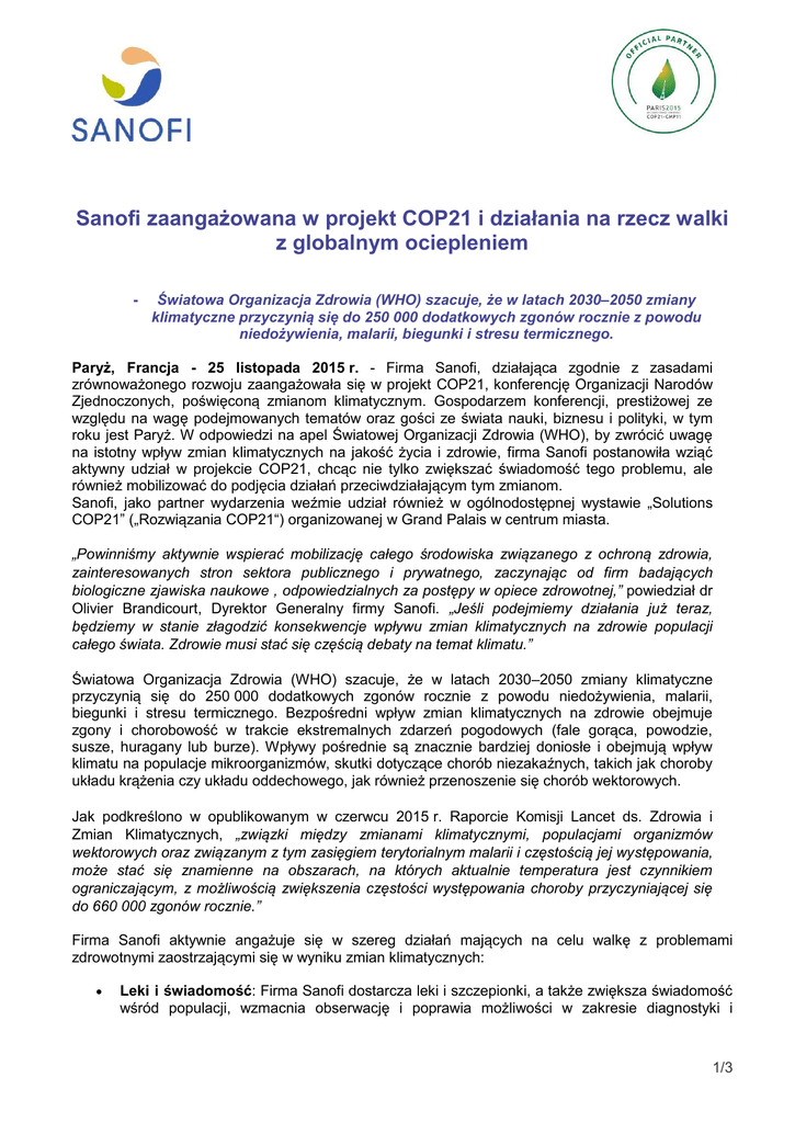 Sanofi zaangażowana w projekt COP21 i działania na rzecz walki z globalnym ociepleniem - Światowa Organizacja Zdrowia (WHO) szacuje, że w latach 2030–2050 zmiany klimatyczne przyczynią się do 250 000 dodatkowych zgonów rocznie z powodu niedożywienia, malarii, biegunki i stresu termicznego. Paryż, Francja - 25 listopada 2015 r. - Firma Sanofi, działająca zgodnie z zasadami zrównoważonego rozwoju zaangażowała się w projekt COP21, konferencję Organizacji Narodów Zjednoczonych, poświęconą zmianom klimatycznym. Gospodarzem konferencji, prestiżowej ze względu na wagę podejmowanych tematów oraz gości ze świata nauki, biznesu i polityki, w tym roku jest Paryż. W odpowiedzi na apel Światowej Organizacji Zdrowia (WHO), by zwrócić uwagę na istotny wpływ zmian klimatycznych na jakość życia i zdrowie, firma Sanofi postanowiła wziąć aktywny udział w projekcie COP21, chcąc nie tylko zwiększać świadomość tego problemu, ale również mobilizować do podjęcia działań przeciwdziałającym tym zmianom. Sanofi, jako partner wydarzenia weźmie udział również w ogólnodostępnej wystawie „Solutions COP21” („Rozwiązania COP21“) organizowanej w Grand Palais w centrum miasta. „Powinniśmy aktywnie wspierać mobilizację całego środowiska związanego z ochroną zdrowia, zainteresowanych stron sektora publicznego i prywatnego, zaczynając od firm badających biologiczne zjawiska naukowe , odpowiedzialnych za postępy w opiece zdrowotnej,” powiedział dr Olivier Brandicourt, Dyrektor Generalny firmy Sanofi. „Jeśli podejmiemy działania już teraz, będziemy w stanie złagodzić konsekwencje wpływu zmian klimatycznych na zdrowie populacji całego świata. Zdrowie musi stać się częścią debaty na temat klimatu.” Światowa Organizacja Zdrowia (WHO) szacuje, że w latach 2030–2050 zmiany klimatyczne przyczynią się do 250 000 dodatkowych zgonów rocznie z powodu niedożywienia, malarii, biegunki i stresu termicznego. Bezpośredni wpływ zmian klimatycznych na zdrowie obejmuje zgony i chorobowość w trakcie ekstremalnych zdarzeń pogodowych (fale gorąca, powodzie, susze, huragany lub burze). Wpływy pośrednie są znacznie bardziej doniosłe i obejmują wpływ klimatu na populacje mikroorganizmów, skutki dotyczące chorób niezakaźnych, takich jak choroby układu krążenia czy układu oddechowego, jak również przenoszenie się chorób wektorowych. Jak podkreślono w opublikowanym w czerwcu 2015 r. Raporcie Komisji Lancet ds. Zdrowia i Zmian Klimatycznych, „związki między zmianami klimatycznymi, populacjami organizmów wektorowych oraz związanym z tym zasięgiem terytorialnym malarii i częstością jej występowania, może stać się znamienne na obszarach, na których aktualnie temperatura jest czynnikiem ograniczającym, z możliwością zwiększenia częstości występowania choroby przyczyniającej się do 660 000 zgonów rocznie.” Firma Sanofi aktywnie angażuje się w szereg działań mających na celu walkę z problemami zdrowotnymi zaostrzającymi się w wyniku zmian klimatycznych: Leki i świadomość: Firma Sanofi dostarcza leki i szczepionki, a także zwiększa świadomość wśród populacji, wzmacnia obserwację i poprawia możliwości w zakresie diagnostyki i 1/3 leczenia. Na przykład w zakresie walki z malarią firma Sanofi nawiązała strategiczne partnerstwo z narodowymi programami zwalczania malarii w kilku krajach w Afryce, aby dostarczać tańsze leki i wspierać miejscowe podmioty w zapobieganiu, diagnostyce i leczeniu malarii. Ślad węglowy: Wprowadzanie gospodarki niskoemisyjnej wymaga zbiorowych wysiłków. Sektor ochrony zdrowia jako całość odpowiada za 3 do 5% emisji państw OECD. Firma Sanofi zobowiązała się osiągnąć zmniejszenie emisji CO2 (z ośrodków przemysłowych i badawczorozwojowych) o 20% od 2010 do 2020 r. Do końca 2014 r. w firmie Sanofi odnotowano zmniejszenie emisji CO2 o 15%. Współpraca na skalę globalną: Jako działający na skalę globalną lider sektora farmaceutycznego, firma Sanofi zajmuje wyjątkową pozycję, która umożliwia jej udział w zbiorowym wysiłku uwzględniania wpływu zmian klimatycznych na zdrowie w debacie publicznej. Z tego względu firma Sanofi podejmuje współpracę z przedstawicielami rządów, organizacji pozarządowych oraz środowiskiem naukowym, której celem jest wynalezienie sposobów ograniczających negatywne konsekwencje zmian klimatycznych na zdrowie ludzi na całym świecie. Dodatkowo i w ramach projektu COP21, mając na celu mobilizację społeczeństw oraz niesienie pomocy w przystosowywaniu się do skutków zmian klimatycznych, firma Sanofi rozpocznie w mediach społecznościowych kampanię #HealthCOP21. W dniach 4–10 grudnia 2015 r. firma Sanofi zaprezentuje również swoje ogólnodostępne stoisko w Grand Palais podczas ogólnodostępnej wystawy „Solutions COP21”, która odbędzie się w centrum Paryża. Informacje o firmie Sanofi Firma Sanofi, działający na skalę globalną lider sektora farmaceutycznego, zajmuje się odkrywaniem, opracowywaniem i upowszechnianiem rozwiązań terapeutycznych, które zaspokajają potrzeby pacjentów. Sanofi rozwija pozycję lidera w obszarach takich jak rozwiązania dla cukrzyków, szczepionki dla ludzi, innowacyjne leki, środki ochrony zdrowia, rynki wschodzące, zdrowie zwierząt oraz Genzyme. Spółka Sanofi jest notowana na giełdach w Paryżu (EURONEXT: SAN) i Nowym Jorku (NYSE: SNY). Stwierdzenia odnoszące się do przyszłości firmy Alnylam Różne deklaracje zawarte w niniejszej informacji, dotyczące przyszłych oczekiwań, planów i perspektyw firmy Alnylam, w tym, bez ograniczeń, przyszłości firmy Alnylam w kontekście potencjalnych produktów terapeutycznych RNAi, włączając produkt ALN-AT3 przeznaczony do leczenia hemofilii i rzadkich zaburzeń krzepnięcia, oczekiwań dotyczących przedstawiania danych z badań klinicznych, w tym zakończenia badania produktu ALN-AS