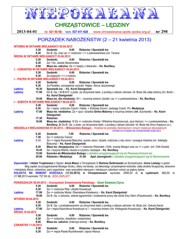 NIEPOKALANA CHRZĄSTOWICE – LĘDZINY tel. 421 90 88; kom. 537 411 928 2013-04-01 www.chrzastowice.opole.opoka.org.pl nr 298 PORZĄDEK NABOŻEŃSTW (2 – 21 kwietnia 2013) WTOREK W OKTAWIE WIELKANOCY 02.04.2013 5.38 Godzinki 6.00 Różaniec i Spowiedź św. 6.30 Do B. Op. oraz za ++ rodziców i ++ z pokrewieństwa (int. Tarara) ŚRODA W OKTAWIE WIELKANOCY 03.04.2013 5.38 Godzinki 6.00 Różaniec i Spowiedź św. 6.30 Za + Ks. Józefa Skowroneka 8.00 Msza św. szkolna: Za ++ księży z dekanatu – Ks. Bonifacy I – CZWARTEK W OKTAWIE WIELKANOCY 04.04.2013 5.38 Godzinki 6.00 Różaniec i Spowiedź św. 6.30 Za żyjących i ++ z rodziny I – PIĄTEK W OKTAWIE WIELKANOCY 05.04.2013 5.38 Godzinki 6.00 Różaniec i Spowiedź św. 6.30 Za Parafian, szczególnie czcicieli Najśw. Serca Jezusowego Lędziny 16.30 Spowiedź św. – Ks. Karol Dźwigoński Lędziny 17.00 Do B. Op. i M.B.N.P. z podz. za otrzymane łaski, z prośbą o dalsze zdrowie i bł. Boże dla całej rodziny (int. Buhl) – Ks. Karol Dźwigoński 18.00 Msza św. dla młodzieży: W I – rocznicę śmierci Józefa i za ++ z pokrewieństwa – Ks. Bonifacy I – SOBOTA W OKTAWIE WIELKANOCY 06.04.2013 5.38 Godzinki 6.00 Różaniec i Spowiedź św. 6.30 Za + męża, rodziców Czech i Halek, + Elżbietę Grund i Jadwigę Czech. Po: Medytacja Lędziny 17.00 Msza św. niedzielna: Za + ojca i dziadka Gintra Malorny w rocznicę śmierci (int. Suchanek) – Ks. Karol Dźwigoński 17.30 Różaniec 18.00 Msza św. niedzielna: 1/ Za ++ rodziców Anielę i Wilhelma Kaczmarczyk, ojca Heinza i ++ z pokrewieństwa – Ks. Bonifacy; 2/ Do B. Op. z podz. za otrzymane łaski, z prośbą o dalsze zdrowie i bł. Boże dla Anny Kajstura (ur.) NIEDZIELA II WIELKANOCNA 07.04.2013 – (Miłosierdzia Bożego) – Kolekta na potrzeby Seminarium i innych instytucji diecezjalnych OFIARA DO PUSZEK NA OGRZEWANIE KOŚCIOŁA Lędziny 6.38 7.30 8.30 9.30 10.45 15.00 20.00 Godzinki 7.00 Różaniec i Spowiedź św. Za ++ rodziców Ciecior Za ++ męża Ryszarda Bialucha, synów Jana i Józefa, rodziców z obu stron i szwagra Huberta (int. Adelajdy Bialucha) – Ks. Karol Dźwigoński Msza św. dwujęzyczna: Za ++ rodziców Wiesiołek i Orlik, siostrę Margot oraz za ++ z pokr. (int. Orlik Ewald) Za + kuzyna Marka i dusze w czyśćcu cierpiące – Ks. Bonifacy Koronka do Miłosierdzia Bożego z udziałem przygotowujących się do Pierwszej Komunii św. Różaniec i Medytacja 21.00 Apel Jasnogórski z udziałem przygotowujących się do Bierzmowania Zapowiedzi: 1/Adam Trupkiewicz z Opola i Anna Mazur z Chrząstowic 2/ Bartosz Świtniewski ze Szczedrzyka i Anna Ledwig z Lędzin Bóg zapłać za przygotowanie Bożego Grobu, ofiary na kwiaty, za dekorację i przystrojenie kościoła; całej służbie liturgicznej, dzieciom i młodzieży Maryi, orkiestrze, pani organistce oraz wszystkim starszym i młodszym członkom scholi za piękny śpiew. KOLEKTA NA REMONT KOŚCIOŁA (17.03.2013) w Chrząstowicach wyniosła: 2595,54 zł; w Lędzinach: 682,50 zł, (17.02.2013 wyniosła: 727,00 zł). „BÓG ZAPŁAĆ”! PONIEDZIAŁEK 08.04.2013 – Uroczystość Zwiastowania Pańskiego – Dzień Świętości Życia 5.38 Godzinki 6.00 Różaniec i Spowiedź św. 6.30 Za ++ rodziców Ritę i Józefa Kowalczyk Lędziny 17.00 Za ++ rodziców Marię i Stanisława Kisielewicz – Ks. Karol Dźwigoński 18.00 Do B. Op. o zdrowie, zdanie egzaminów i znalezienie pracy dla córek Ewy Stern (Paszkowski) – Ks. Bonifacy WTOREK 09.04.2013 5.38 Godzinki 6.00 Różaniec i Spowiedź św. 6.30 Do B. Op. z podziękowaniem za otrzymane łaski z prośbą o dalsze zdrowie i bł. Boże (int. Cebula Karol) Lędziny 17.00 Za + męża Kazimierza Kowalczyk w I – rocznicę śmierci (int. Hildegarda Kowalczyk) – Ks. Karol Dźwigoński ŚRODA 10.04.2013 5.38 Godzinki 6.00 Różaniec i Spowiedź św. 6.30 Za ++ rodziców, dziadków i rodzeństwo 8.00 Msza św. szkolna: (intencja wolna) – Ks. Bonifacy CZWARTEK 11.04.2013 5.38 Godzinki 6.00 Różaniec i Spowiedź św. 6.30 Za ++ męża Pawła Rychlikowski i zięcia Heinza PIĄTEK 12.04.2013 5.38 6.30 18.00 SOBOTA 13.04.2013 5.38 6.30 Godzinki 6.00 Różaniec i Spowiedź św. Do M.B.N.P. z podz. za otrzymane łaski, z prośbą o bł. Boże i zdrowie z okazji rocznicy urodzin (int. Jerzego Kochanek) Msza św. dla młodzieży: Za ++ męża, rodziców, rodzeństwo i dziadków z obu stron oraz o zdrowie dla Anny – Ks. Bonifacy Godzinki 6.00 Różaniec i Spowiedź św. Za ++ Walburgę i Ryszarda Duda, brata Piotra oraz za ++ z pokrewieństwa (int. Duda Paweł) NIEDZIELA III WIELKANOCNA 14.04.2013 – Niedziela Biblijna – Zbiórka do puszek na Caritas na zakończenie Tygodnia Miłosierdzia 6.38 Godzinki 7.00 Różaniec i Spowiedź św. 7.30 Za ++ rodziców Annę i Edmunda Bul, brata, ojca Alojza Mazur oraz ++ z pokrewieństwa (int. Mazur) Lędziny 8.30 Za + Ryszarda Baron – Ks. Karol Dźwigoński 9.30 Msza św. dwujęzyczna: Do B. Op. i M.B.N.P. z podz. za otrzymane łaski, z prośbą o dalsze zdrowie i bł. Boże oraz za ++ rodziców, brata i siostry (int. Adela Klimek) – Ks. Bonifacy 10.45 Za ++ rodziców Jana i Marię Bąk, rodziców Marię i Ryszarda Twardawski oraz ++ z pokrewieństwa 15.00 Nabożeństwo biblijne z udziałem przygotowujących się do Bierzmowania i Pierwszej Komunii św. Zapowiedzi: 1/Adam Trupkiewicz z Opola i Anna Mazur z Chrząstowic 2/ Bartosz Świtniewski ze Szczedrzyka i Anna Ledwig z Lędzin Naczelnik Drugiego Urzędu Skarbowego w Opolu informuje, iż w dniu 12 kwietnia 2013 roku w godz. 9-14 w siedzibie Urzędu Gminy Chrząstowice, przy ul. Dworcowej 38, zorganizowano dodatkowy punkt przyjmowania zeznań podatkowych za 2012 rok przez pracowników urzędu skarbowego. W punkcie będzie można pobrać formularze rozliczeń podatkowych, złożyć zeznanie podatkowe oraz uzyskać informacje. PONIEDZIAŁEK 15.04.2013 5.38 Godzinki 6.00 Różaniec i Spowiedź św. 6.30 Za ++ Piotra Cichoń, jego rodziców, brata, bratową, siost