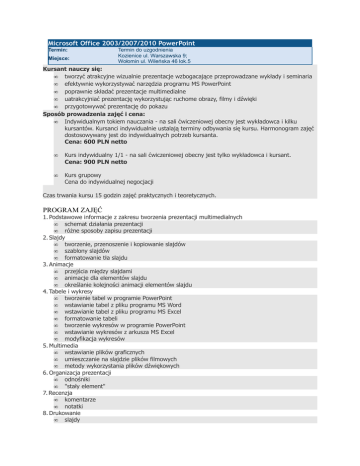 Microsoft Office 2003/2007/2010 PowerPoint Termin: Miejsce: Termin do uzgodnienia Kozienice ul. Warszawska 9; Wołomin ul. Wileńska 46 lok.5 Kursant nauczy się: • tworzyć atrakcyjne wizualnie prezentacje wzbogacające przeprowadzane wykłady i seminaria • efektywnie wykorzystywać narzędzia programu MS PowerPoint • poprawnie składać prezentacje multimedialne • uatrakcyjniać prezentację wykorzystując ruchome obrazy, filmy i dźwięki • przygotowywać prezentację do pokazu Sposób prowadzenia zajęć i cena: • Indywidualnym tokiem nauczania - na sali ćwiczeniowej obecny jest wykładowca i kilku kursantów. Kursanci indywidualnie ustalają terminy odbywania się kursu. Harmonogram zajęć dostosowywany jest do indywidualnych potrzeb kursanta. Cena: 600 PLN netto • Kurs indywidualny 1/1 - na sali ćwiczeniowej obecny jest tylko wykładowca i kursant. Cena: 900 PLN netto • Kurs grupowy Cena do indywidualnej negocjacji Czas trwania kursu 15 godzin zajęć praktycznych i teoretycznych. PROGRAM ZAJĘĆ 1. Podstawowe informacje z zakresu tworzenia prezentacji multimedialnych • schemat działania prezentacji • różne sposoby zapisu prezentacji 2. Slajdy • tworzenie, przenoszenie i kopiowanie slajdów • szablony slajdów • formatowanie tła slajdu 3. Animacje • przejścia między slajdami • animacje dla elementów slajdu • określanie kolejności animacji elementów slajdu 4. Tabele i wykresy • tworzenie tabel w programie PowerPoint • wstawianie tabel z pliku programu MS Word • wstawianie tabel z pliku programu MS Excel • formatowanie tabeli • tworzenie wykresów w programie PowerPoint • wstawianie wykresów z arkusza MS Excel • modyfikacja wykresów 5. Multimedia • wstawianie plików graficznych • umieszczanie na slajdzie plików filmowych • metody wykorzystania plików dźwiękowych 6. Organizacja prezentacji • odnośniki • "stały element" 7. Recenzja • komentarze • notatki 8. Drukowanie • slajdy • notatki • materiały informacyjne 9. Przygotowanie prezentacji do pokazu • próba tempa • narracja • pokaz niestandardowy