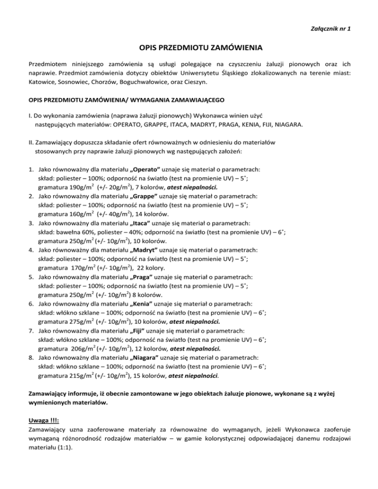 Załącznik nr 1 OPIS PRZEDMIOTU ZAMÓWIENIA Przedmiotem niniejszego zamówienia są usługi polegające na czyszczeniu żaluzji pionowych oraz ich naprawie. Przedmiot zamówienia dotyczy obiektów Uniwersytetu Śląskiego zlokalizowanych na terenie miast: Katowice, Sosnowiec, Chorzów, Boguchwałowice, oraz Cieszyn. OPIS PRZEDMIOTU ZAMÓWIENIA/ WYMAGANIA ZAMAWIAJĄCEGO I. Do wykonania zamówienia (naprawa żaluzji pionowych) Wykonawca winien użyć następujących materiałów: OPERATO, GRAPPE, ITACA, MADRYT, PRAGA, KENIA, FIJI, NIAGARA. II. Zamawiający dopuszcza składanie ofert równoważnych w odniesieniu do materiałów stosowanych przy naprawie żaluzji pionowych wg następujących założeń: 1. Jako równoważny dla materiału „Operato” uznaje się materiał o parametrach: skład: poliester – 100%; odporność na światło (test na promienie UV) – 5˚; gramatura 190g/m2 (+/- 20g/m2), 7 kolorów, atest niepalności. 2. Jako równoważny dla materiału „Grappe” uznaje się materiał o parametrach: skład: poliester – 100%; odporność na światło (test na promienie UV) – 5˚; gramatura 160g/m2 (+/- 40g/m2), 14 kolorów. 3. Jako równoważny dla materiału „Itaca” uznaje się materiał o parametrach: skład: bawełna 60%, poliester – 40%; odporność na światło (test na promienie UV) – 6˚; gramatura 250g/m2 (+/- 10g/m2), 10 kolorów. 4. Jako równoważny dla materiału „Madryt” uznaje się materiał o parametrach: skład: poliester – 100%; odporność na światło (test na promienie UV) – 5˚; gramatura 170g/m2 (+/- 10g/m2), 22 kolory. 5. Jako równoważny dla materiału „Praga” uznaje się materiał o parametrach: skład: poliester – 100%; odporność na światło (test na promienie UV) – 5˚; gramatura 250g/m2 (+/- 10g/m2) 8 kolorów. 6. Jako równoważny dla materiału „Kenia” uznaje się materiał o parametrach: skład: włókno szklane – 100%; odporność na światło (test na promienie UV) – 6˚; gramatura 275g/m2 (+/- 10g/m2), 10 kolorów, atest niepalności. 7. Jako równoważny dla materiału „Fiji” uznaje się materiał o parametrach: skład: włókno szklane – 100%; odporność na światło (test na promienie UV) – 6˚; gramatura 206g/m2 (+/- 10g/m2), 12 kolorów, atest niepalności. 8. Jako równoważny dla materiału „Niagara” uznaje się materiał o parametrach: skład: włókno szklane – 100%; odporność na światło (test na promienie UV) – 6˚; gramatura 215g/m2 (+/- 10g/m2), 15 kolorów, atest niepalności. Zamawiający informuje, iż obecnie zamontowane w jego obiektach żaluzje pionowe, wykonane są z wyżej wymienionych materiałów. Uwaga !!!: Zamawiający uzna zaoferowane materiały za równoważne do wymaganych, jeżeli Wykonawca zaoferuje wymaganą różnorodność rodzajów materiałów – w gamie kolorystycznej odpowiadającej danemu rodzajowi materiału (1:1). Usługi winny być świadczone wg bieżących potrzeb Zamawiającego, przez okres 2 lat tj. od 01.01.2017r. do 31.12.2018r. Wartość umowy nie może przekroczyć kwoty jaką Zamawiający przeznaczył na ten cel. Usługi świadczone będą do ostatniego dnia obowiązywania umowy lub do wcześniejszego wyczerpania kwoty stanowiącej wartość umowy. Czyszczenie żaluzji pionowych nie powinno powodować ich zniszczenia lub uszkodzenia. Przez naprawę należy rozumieć w szczególności wymianę uszkodzonych części, elementów, w tym wymianę pasów, oraz wszelkiego rodzaju zabiegi przywracające sprawność działania żaluzji. Koszty transportu związane z realizacją przedmiotu umowy obciążają wyłącznie Wykonawcę. Termin realizacji każdorazowego zlecenia obejmującego naprawę lub czyszczenie żaluzji pionowych wynosi max 5 dni roboczych od daty przyjęcia zgłoszenia przez Wykonawcę. Termin gwarancji: a) na wykonaną usługę wynosi minimum 6 miesięcy, b) na zamontowane materiały, urządzenia, części itp. wynosi minimum 12 miesięcy, Bieg terminów gwarancji rozpoczyna się w dacie podpisania Protokołu Odbioru Zamawiający nie dopuszcza składania ofert częściowych. Cennik zostanie dołączony do umowy jako jej integralna część i będzie stanowić załącznik nr 1 do umowy. DOKUMENTY WYMAGANE OD WYKONAWCÓW 1. Wykonawca winien wykazać się doświadczeniem w wykonaniu lub wykonywaniu w okresie ostatnich 3 lat przed dniem ogłoszenia postępowania (tj. licząc wstecz 3 lata od dnia poprzedzającego dzień ogłoszenia niniejszego postępowania) minimum 2 usługami odpowiadającymi rodzajem przedmiotu zamówienia. 1.1. Zamawiający uzna za usługę odpowiadającą swoim rodzajem usłudze będącej przedmiotem zamówienia usługę obejmującą czyszczenie żaluzji pionowych na metrażu co najmniej 1000m2 oraz naprawę żaluzji pionowych. 2. Wykonawca przedłoży dokumenty (np. referencje) potwierdzające wykonanie usług z należytą starannością (wzór wykazu stanowi Załącznik nr 4) 3. Wykonawca przedłoży stosowne oświadczenie (załącznik nr 6) potwierdzające parametry oferowanych materiałów wskazanych w opisie przedmiotu. Oświadczenie winno zawierać informację dotyczącą co najmniej: składu, gramatury i stopień UV materiału. 4. Wykonawca przedłoży dokumenty potwierdzające niepalność materiałów wyszczególnionych w opisie przedmiotu zamówienia. 5. Informację o technologii czyszczenia żaluzji pionowych wraz z oświadczeniem, że nie powoduje ona ich zniszczenia lub uszkodzenia.