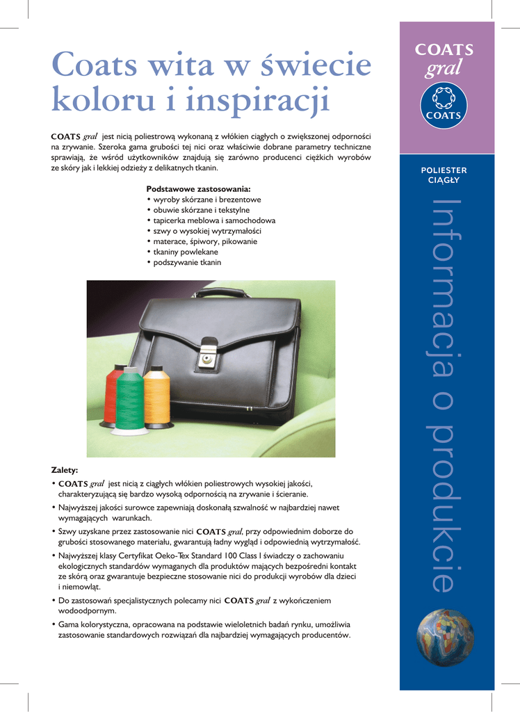 Coats wita w swiecie koloru i inspiracji Coats gral gral jest nici¹ poliestrow¹ wykonan¹ z w³ókien ci¹g³ych o zwiêkszonej odpornoœci na zrywanie. Szeroka gama gruboœci tej nici oraz w³aœciwie dobrane parametry techniczne sprawiaj¹, ¿e wœród u¿ytkowników znajduj¹ siê zarówno producenci ciê¿kich wyrobów ze skóry jak i lekkiej odzie¿y z delikatnych tkanin. Zalety: • Coats gralgral jest nici¹ z ci¹g³ych w³ókien poliestrowych wysokiej jakoœci, charakteryzuj¹c¹ siê bardzo wysok¹ odpornoœci¹ na zrywanie i œcieranie. • Najwy¿szej jakoœci surowce zapewniaj¹ doskona³¹ szwalnoœæ w najbardziej nawet wymagaj¹cych warunkach. • Szwy uzyskane przez zastosowanie nici Coats gralgral, przy odpowiednim doborze do gruboœci stosowanego materia³u, gwarantuj¹ ³adny wygl¹d i odpowiedni¹ wytrzyma³oœæ. • Najwy¿szej klasy Certyfikat Oeko-Tex Standard 100 Class I œwiadczy o zachowaniu ekologicznych standardów wymaganych dla produktów maj¹cych bezpoœredni kontakt ze skór¹ oraz gwarantuje bezpieczne stosowanie nici do produkcji wyrobów dla dzieci i niemowl¹t. • Do zastosowañ specjalistycznych polecamy nici Coats gralgral z wykoñczeniem wodoodpornym. • Gama kolorystyczna, opracowana na podstawie wieloletnich badañ rynku, umo¿liwia zastosowanie standardowych rozwi¹zañ dla najbardziej wymagaj¹cych producentów. POLIESTER CI¥G£Y Informacja o produkcie Podstawowe zastosowania: • wyroby skórzane i brezentowe • obuwie skórzane i tekstylne • tapicerka meblowa i samochodowa • szwy o wysokiej wytrzyma³oœci • materace, œpiwory, pikowanie • tkaniny powlekane • podszywanie tkanin gral Artyku³ Tex WytrzyRozci¹glima³oœæ Gruboœæ woœæ dtex na zrywanie % cN Rodzaj nawoju m Zalecane ig³y nr Zastosowanie 10 50x2 650 18-20 6 000 60 podszywanie tkanin gral 180 15 74x2 930 16-21 10x5 000 10 000 70-75 gral 120 22 74x3 1430 16-21 10 000 75-80 uzbrojenie chwytaczy overlocków podszywanie tkanin, pikowanie tkanin i materaców gral 80 33 113x3 2130 16-21 5 000 80-90 gral 60 40 150x3 2800 15-20 4 000 90-100 gral 40 75 226x3 4400 15-21 3 000 100-120 gral 30 80 275x3 5200 15-21 2 000 110-130 gral 20 136 455x3 8770 18-25 2 000 130-140 gral 15 200 660x3 12450 22-29 1 000 140-160 gral 10 280 940x3 17600 23-30 1 000 160-200 skórzanych, pasy bezpieczeñstwa, gral 8 330 1100x3 20500 19-25 1 000 160-200 pikowanie materaców, koce, œpiwory, tkaniny powlekane, obuwie tekstylne, meble tapicerowane, wyroby skórzane, torby, plecaki, walizki, obuwie, namioty, pokrowce plecaki, plandeki, œrednie i ciê¿kie wyroby ze skóry, tkaniny techniczne, tapicerka meblowa i samochodowa szwy ozdobne w wyrobach szwy o wysokiej wytrzyma³oœci Fizyczne i chemiczne w³asnoœci nici z poliestru ci¹g³ego: W³asnoœci termiczne: • Temperatura topnienia 250 - 260°C • Wykurcz < 1% w temperaturze 150°C W³asnoœci chemiczne: • Kwasy: odporne na dzia³anie wiêkszoœci kwasów • Alkalia: w du¿ej mierze odporne na s³abe alkalia, nieodporne na silne stê¿enia, zw³aszcza w wysokich temperaturach • Rozpuszczalniki organiczne: generalnie odporne z wyj¹tkiem niektórych zwi¹zków fenolowych • Bielenie: odporne • Mikroorganizmy i pleœnie: odporne • Pranie chemiczne i na mokro: odporne • Wilgotnoœæ: 0,4% Coats gral gral - odpornoœci: Odpornoœæ na pranie: Odpornoœæ na wodê: Odpornoœæ na tarcie: Odpornoœæ na podchloryny: Odpornoœæ na pranie chemiczne: Odpornoœæ na pot: Odpornoœæ na œwiat³o: (zgodnie z ISO 105 CO3) (zgodnie z ISO 105 E01) (zgodnie z ISO 105 X12) (zgodnie z ISO 105 NO1) (zgodnie z ISO 105 D01) (zgodnie z ISO 105 EO4) (zgodnie z ISO 105 B02) Coats Polska Sp. z o.o., ul. Kaczeñcowa 16, 91-214 £ódŸ Tel.: +48 42 640 50 53, Fax +48 42 640 51 16 www.coats.pl Min.4 Min.4 Min.4 Min.4 Min.4 Min.4 Min.4 POLIESTER CI¥G£Y Informacja o produkcie gral 220 120 gral