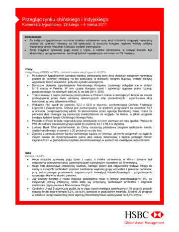 Przegl d rynku chi skiego i indyjskiego Komentarz tygodniowy, 28 lutego 4 marca 2011 Streszczenie Po kolejnym tygodniowym wzro cie indeksu odniesienia ceny akcji chi skich osi gn y najwy szy poziom od czterech miesi cy na fali spekulacji, i doroczny kongres rz dowy wdro y polityk wspierania tanich mieszka i pobudzi wydatki wewn trzne. Akcje indyjskie zyskiwa y pi ty dzie z rz du, a indeks odniesienia, w którym liderami byli eksporterzy oprogramowania, zamkn tydzie najwi kszym wzrostem od 19 miesi cy. Chiny Hong Kong HSCEI +4,72%, chi ski indeks akcji typu A +2,22% Po kolejnym tygodniowym wzro cie indeksu odniesienia ceny akcji chi skich osi gn y najwy szy poziom od czterech miesi cy na fali spekulacji, i doroczny kongres rz dowy wdro y polityk wspierania tanich mieszka i pobudzi wydatki wewn trzne. Doroczne plenarne zgromadzenie Narodowego Kongresu Ludowego odb dzie si w dniach 5 15 marca w Pekinie. W tym czasie Kongres oceni i zatwierdzi rz dowe plany rozwoju gospodarczego na kolejnych pi lat, tj. na lata 2011 2015. Trzeci miesi c z rz du produkcja przemys owa w Chinach ro nie w wolniejszym tempie na skutek podwy szenia przez bank centralny referencyjnych stóp procentowych i ograniczenia akcji kredytowej w celu zd awienia inflacji. Wska nik PMI spad do poziomu 52,2 z 52,9 w styczniu, poinformowa a Chi ska Federacja Logistyki i Zaopatrzenia. Odczyt jest porównywalny ze rednimi prognozami na poziomie 52,1 w ankiecie przeprowadzonej w ród 14 ekonomistów przez agencj Bloomberg News. Dane za pierwsze dwa miesi ce s zazwyczaj zniekszta cone ze wzgl du na termin, w jakim przypada trwaj ce tydzie wi to Chi skiego Nowego Roku. Ponadto chi skie bran e nieprodukcyjne odnotowa y w lutym pierwszy od roku spadek. Wska nik PMI dla sektora nieprodukcyjnego spad do poziomu 44,1 z 56,4 w styczniu. Ludowy Bank Chin poinformowa , e Chiny rozszerz pilota owy program rozliczania handlu mi dzynarodowego w juanach z 20 prowincji na ca y kraj. Zgodnie z o wiadczeniem banku centralnego b dzie on równie aktywnie reagowa na d enie innych krajów do wykorzystywania juana jako waluty rezerwowej i b dzie pomaga firmom zagranicznym w gromadzeniu kapita u denominowanego w juanach na inwestycje poza Chinami. Indie Sensex +4,44% Akcje indyjskie zyskiwa y pi ty dzie z rz du, a indeks odniesienia, w którym liderami byli eksporterzy oprogramowania, zamkn tydzie najwi kszym wzrostem od 19 miesi cy. Rz d Indii przedstawi propozycj bud etu, którego celem jest z agodzenie wp ywu inflacji na osoby o ni szych dochodach poprzez zwolnienie wi kszej grupy obywateli z p acenia podatków, przy jednoczesnym promowaniu zagranicznych inwestycji infrastrukturalnych i przyspieszeniu sprzeda y aktywów skarbu pa stwa. Ju czwarty kwarta z rz du indyjska gospodarka ros a w tempie przekraczaj cym 8%, co zwi kszy o presj inflacyjn , która sta a si przyczyn publicznych protestów i zagrozi a stabilno ci rz du premiera Manmohana Singha. Centralny Urz d Statystyczny poda , e w ci gu trzech miesi cy zako czonych 31 grudnia produkt krajowy brutto rós w tempie 8,2%, po 8,9% wzro cie w poprzednim kwartale. rednia 29 prognoz w ankiecie przeprowadzonej przez agencj Bloomberg News wskazywa a na 8,6% wzrost. Produkcja przemys owa Indii rozwija a si w najszybszym tempie od trzech miesi cy, zwi kszaj c presj na bank centralny, by ten podniós stopy procentowe po raz ósmy w ci gu roku. HSBC Holdings Plc i Markit Economics poinformowa y, e wska nik PMI wzrós w lutym do poziomu 57,9 z 56,8 w styczniu. Odczyt powy ej 50 oznacza wzrost gospodarczy. Sektor us ug w Indiach odnotowa w lutym najszybszy rozwój od siedmiu miesi cy. Indeks PMI wzrós do poziomu 60,2 z 58,1 w styczniu, poinformowa y HSBC Holdings Plc i Markit Economics. Informacja prawna Niniejszy komentarz powsta na podstawie obserwacji i analiz przeprowadzonych przez spó k HSBC Global Asset Management, która jest cz ci Grupy HSBC. Dokument ten nale y traktowa wy cznie jako materia marketingowy, nie jest on natomiast ofert ani zach t lub zaproszeniem do nabycia lub udzia u w subskrypcji instrumentu finansowego; nie jest te porad ani rekomendacj inwestycyjn lub niezale n analiz finansow . Ze wzgl du na swoj specyfik inwestycje na rynkach wschodz cych s obarczone wi kszym ryzykiem i charakteryzuj si wi ksz zmienno ci cen ni inwestycje na rynkach w krajach rozwini tych. Na warto inwestycji mog równie wp ywa zmiany kursów walut, zw aszcza w przypadku inwestorów posiadaj cych papiery warto ciowe denominowane w walutach obcych. Wszelkie projekcje, prognozy lub cele dotycz ce przysz ych zysków lub poziomów cen zawarte w niniejszym dokumencie maj wy cznie charakter pogl dowy i nie s w aden sposób gwarantowane. Ani HSBC Global Asset Management ani HSBC Bank Polska SA nie ponosi adnej odpowiedzialno ci, je li te projekcje, prognozy lub cele oka si nietrafne. Niniejszy komentarz nie zast puje indywidualnej porady fachowej lokalnego doradcy inwestora. Komentarz jest przeznaczony wy cznie dla osób przebywaj cych na sta e w Polsce. Nie jest natomiast przeznaczony dla osób z innych krajów lub jurysdykcji, a w szczególno ci podmiotów lub osób b d cych rezydentami lub obywatelami Stanów Zjednoczonych Ameryki Pó nocnej jak równie nie jest przeznaczony dla osób z krajów lub jurysdykcji, które wprowadzi y zakaz b d ograniczenia rozpowszechniania materia ów analitycznych dla swoich obywateli. Warto inwestycji oraz dochodów uzyskiwanych z inwestycji mo e si zmniejszy lub zwi kszy . Wcze niejsze wyniki, symulacje lub prognozy nie s wiarygodnym wska nikiem przysz ych wyników. Informacje zamieszczone w niniejszym biuletynie uzyskano ze róde , które uznajemy za wiarygodne, lecz nie zosta y przez nas poddane niezale nej weryfikacji, dlatego nie ponosimy odpowiedzialno ci za ich rzetelno lub kompletno . Wszystkie opinie wyra one w niniejszym komentarzu s opiniami HSBC Global Asset Management i mog w przysz o ci ulec zmianom, które nie podlegaj obowi zkowi publikacji. Wi cej informacji mo na 