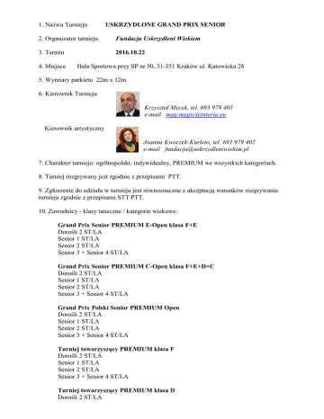 1. Nazwa Turnieju USKRZYDLONE GRAND PRIX SENIOR 2. Organizator turnieju Fundacja Uskrzydleni Wiekiem 3. Termin 2016.10.22 4. Miejsce Hala Sportowa przy SP nr 50, 31-351 Kraków ul. Katowicka 28 5. Wymiary parkietu 22m x 12m 6. Kierownik Turnieju Krzysztof Mycek, tel. 693 979 401 e-mail [email protected] Kierownik artystyczny Joanna Kwoczek-Kurleto, tel. 693 979 402 e-mail [email protected] 7. Charakter turnieju: ogólnopolski, indywidualny, PREMIUM we wszystkich kategoriach. 8. Turniej rozgrywany jest zgodnie z przepisami PTT. 9. Zgłoszenie do udziału w turnieju jest równoznaczne z akceptacją warunków rozgrywania turnieju zgodnie z przepisami STT PTT. 10. Zawodnicy - klasy taneczne / kategorie wiekowe: Grand Prix Senior PREMIUM E-Open klasa F+E Dorośli 2 ST/LA Senior 1 ST/LA Senior 2 ST/LA Senior 3 + Senior 4 ST/LA Grand Prix Senior PREMIUM C-Open klasa F+E+D+C Dorośli 2 ST/LA Senior 1 ST/LA Senior 2 ST/LA Senior 3 + Senior 4 ST/LA Grand Prix Polski Senior PREMIUM Open Dorośli 2 ST/LA Senior 1 ST/LA Senior 2 ST/LA Senior 3 + Senior 4 ST/LA Turniej towarzyszący PREMIUM klasa F Dorośli 2 ST/LA Senior 1 ST/LA Senior 2 ST/LA Senior 3 + Senior 4 ST/LA Turniej towarzyszący PREMIUM klasa D Dorośli 2 ST/LA Senior 1 ST/LA Senior 2 ST/LA Senior 3 ST/LA Senior 4 ST/LA Turniej towarzyszący Freestyle Dorośli 2 Freestyle Senior 1 Freestyle Senior 2 Freestyle Senior 3 Freestyle Mistrzostwa Okręgu Małopolskiego PTT Senior 1 ST/LA Senior 2 ST/LA Senior 3 + Senior 4 ST/LA 11. Skład Komisji Sędziowskiej, w tym Sędzia Główny punktujący Maria Nowak – Kraków (Sędzia Główny) Adam Berkowicz – Jasło Andrzej Bieniek – Wrocław Jerzy Oleszczyński – Lublin Andrzej Orszulak – Krosno Barbara Pisarska-Gubernat - Wrocław Grzegorz Rybicki – Tomaszów Mazowiecki Marek Trzemżalski – Gliwice Adam Berkowicz – Jasło (Prowadzący) 12. Skład Komisji Skrutacyjnej Artur Drąg – Kraków Paweł Łyczko – Kraków 13. Opłata za przekazanie praw do organizacji turnieju w kwocie 300,- zł wniesiona na konto ZG PTT w dniu 2016-09-22. 14. Warunki uczestnictwa w turnieju W turnieju może wziąć udział para, która: - jest zarejestrowana w CBD PTT lub jest parą zagraniczną - posiada licencję taneczną na dany rok kalendarzowy krajową lub zagraniczną - posiada książeczkę startową z wpisaną aktualną licencją taneczną krajową lub zagraniczną - ma opłaconą składkę członka zwyczajnego na dany rok kalendarzowy - należy do członka wspierającego, który ma opłaconą składkę członka wspierającego na dany rok kalendarzowy lub spełnia kryteria Uchwały nr 8/2016 ZG PTT - w klasie F może startować para zarejestrowana w CBD PTT na kartę tancerza seniora - zostanie zgłoszona on-line przez CBD PTT w terminie do dnia 19 października (środa) do godziny 24:00 (baza jest zamykana automatycznie); oficjalny program turnieju zostanie podany zgodnie z przepisami PTT do 20 października do godziny 22:00 - wniesie opłatę startową za każdy punkt programu w wysokości: Grand Prix Senior E-Open 25,- zł/osoba/styl Grand Prix Senior C-Open 30,- zł/osoba/styl Grand Prix Polski Open 35,- zł/osoba/styl Turniej towarzyszący PREMIUM klasa F i D 20,- zł/osoba/styl Turniej towarzyszący Freestyle 15,- zł/osoba/styl (z opłaty zwolnione są pary, które wniosły opłatę startową za dowolny inny punkt programu) [uwaga szczegółowe informacje na temat Turnieju towarzyszącego Freestyle w zakładce „informacje”] Mistrzostwa Okręgu Małopolskiego PTT bez opłat [uwaga regulamin Mistrzostw Okręgu Małopolskiego PTT w zakładce „informacje”] Organizator nie ogranicza ilości par za wyjątkiem rywalizacji w kategorii Freestyle. W razie wycofania pary z turnieju opłata startowa nie podlega zwrotowi. Dokonanie zgłoszenia i udział w turnieju równoznaczny jest z wyrażeniem na zawsze i bezwarunkowo zgody na rejestrację fotograficzną, wideo i telewizyjną wszystkich prezentacji oraz ich wykorzystywanie, publikację i emisję w dowolnych mediach, a także na potrzeby reklamy. 15. Wejściówki Widownia 20,- zł za jeden blok (pary biorące udział w turnieju i trenerzy, którzy potwierdzili obecność do 19 października są naszymi gośćmi). Miejsce przy stoliku dodatkowo 25,- zł od osoby za jeden blok (obejmuje bezpłatną kawę lub herbatę i wymaga wcześniejszej rezerwacji). Nie pobieramy opłat za nagrywanie lub robienie zdjęć. 16. Dodatkowe informacje organizatora Pary biorą udział w rywalizacji na własne ryzyko i oświadczają, że nie mają przeciwwskazań do uczestnictwa w rywalizacji sportowej. - opieka medyczna Joanna Sułowska - prowadzenie Adam Berkowicz - Jasło - muzyka Jerzy Zieliński – Lublin - nagłośnienie, oświetlenie – Samorządowe Centrum Kultury i Promocji Gminy Zabierzów - scenografia, wystrój – Izabela Sater Studio Kwiatowe Klasyka Kraków - stoisko stroje taneczne – Iwona Hołowczak Stroje Taneczne Kraków - stoisko obuwie (firmy Kozdra) i akcesoria – Katarzyna Skiba Trendy Dance Żabno - stoisko rękodzieła i Moje Piernikowo - bufet – napoje, ciasta domowego wypieku - noclegi – w InterHouse Hotel na hasło GPS oferta specjalna - serwis fotograficzny i filmowy – PeterLi - stołówka – zestaw obiadowy lub pierogi [uwaga szczegółowe informacje na temat jadłospisu w zakładce „informacje”] 17. Odpowiedzialność organizatora - organizator nie ubezpiecza zawodników - organizator nie odpowiada za rzeczy pozostawione w szatni i na terenie obiektu - organizator nie zapewnia miejsc parkingowych - obowiązują ochraniacze na obcasy dla tancerek - obowiązuje zakaz polewania parkietu wodą 18. Facebook grupa otwarta Taniec Towarzyski Seniorów PTT 19. Przestrzeganie przepisów STT PTT - organizator zastrzega sobie prawo do połączenia kategorii wiekowych - pkt. 2.3.9 (Regulamin współzawodnictwa w grupach seniorów) - nie obowiązuje limit ilości startów - pkt. 2.3.11 Regulamin współzawodnictwa w grupach senior
