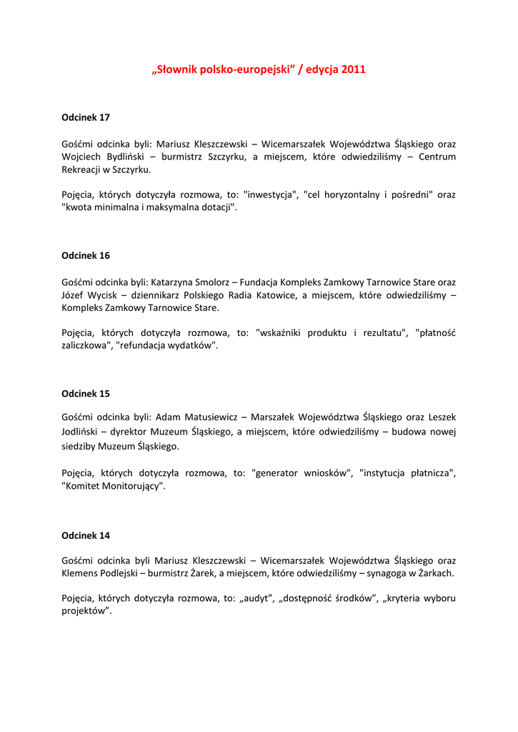 „Słownik polsko-europejski” / edycja 2011 Odcinek 17 Gośdmi odcinka byli: Mariusz Kleszczewski – Wicemarszałek Województwa Śląskiego oraz Wojciech Bydlioski – burmistrz Szczyrku, a miejscem, które odwiedziliśmy – Centrum Rekreacji w Szczyrku. Pojęcia, których dotyczyła rozmowa, to: "inwestycja", "cel horyzontalny i pośredni" oraz "kwota minimalna i maksymalna dotacji". Odcinek 16 Gośdmi odcinka byli: Katarzyna Smolorz – Fundacja Kompleks Zamkowy Tarnowice Stare oraz Józef Wycisk – dziennikarz Polskiego Radia Katowice, a miejscem, które odwiedziliśmy – Kompleks Zamkowy Tarnowice Stare. Pojęcia, których dotyczyła rozmowa, to: "wskaźniki produktu i rezultatu", "płatnośd zaliczkowa", "refundacja wydatków". Odcinek 15 Gośdmi odcinka byli: Adam Matusiewicz – Marszałek Województwa Śląskiego oraz Leszek Jodlioski – dyrektor Muzeum Śląskiego, a miejscem, które odwiedziliśmy – budowa nowej siedziby Muzeum Śląskiego. Pojęcia, których dotyczyła rozmowa, to: "generator wniosków", "instytucja płatnicza", "Komitet Monitorujący". Odcinek 14 Gośdmi odcinka byli Mariusz Kleszczewski – Wicemarszałek Województwa Śląskiego oraz Klemens Podlejski – burmistrz Żarek, a miejscem, które odwiedziliśmy – synagoga w Żarkach. Pojęcia, których dotyczyła rozmowa, to: „audyt”, „dostępnośd środków”, „kryteria wyboru projektów”. Odcinek 13 Gościem odcinka był Zdzisław Banaś – burmistrz Siewierza, a miejscem, które odwiedziliśmy – zamek w Siewierzu. Pojęcia, których dotyczyła rozmowa, to: „wkład własny”, „projekt”, „zakres rzeczowy i finansowy projektu”. Odcinek 12 Gośdmi odcinka byli: Małgorzata Staś – dyrektor Wydziału Rozwoju Regionalnego, Adam Morawiec – dyrektor Pałacu w Rybnej oraz Arkadiusz Czech – burmistrz Tarnowskich Gór, a miejscem, które odwiedziliśmy – zamek w Siewierzu. Pojęcia, których dotyczyła rozmowa, to: „instytucja otoczenia biznesu”, „obszar wsparcia”, „partnerstwo publiczno-prywatne”. Odcinek 11 Gośdmi odcinka byli: dr hab. inż. Zdzisław Duda – dziekan Wydziału Automatyki, Elektroniki i Informatyki Politechniki Śląskiej, oraz dr Krzysztof Cyran – kierownik Laboratorium Wirtualnego Latania, a miejscem, które odwiedziliśmy – Laboratorium Wirtualnego Latania na Wydziale Automatyki Elektroniki i Informatyki Politechniki Śląskiej w Gliwicach. Pojęcia, których dotyczyła rozmowa, to: „kwota dofinansowania”, „szerokopasmowy dostęp do Internetu”, „ocena oddziaływania na środowisko”. Odcinek 10 Gościem odcinka był Michał Czarski – wiceprzewodniczący Sejmiku Województwa Śląskiego, a miejscem, które odwiedziliśmy – Teatr Nowy w Zabrzu. Pojęcia, których dotyczyła rozmowa, to: „wartośd projektu”, „studium wykonalności”, „współfinansowanie”. Odcinek 9 Gośdmi odcinka byli: Krzysztof Matyjaszczyk – prezydent Częstochowy oraz Janusz Jadczyk – dyrektor Muzeum Częstochowskiego, a miejscem, które odwiedziliśmy – Multicentrum w Częstochowie. Pojęcia, których dotyczyła rozmowa, mikro/małe/średnie”, „linia demarkacyjna”. to: „analiza SWOT”, „przedsiębiorstwo Odcinek 8 Gośdmi odcinka byli: Agnieszka Sikorska – dyrektor Śląskiej Organizacji Turystycznej oraz Ryszard Mach – prezydent Zawiercia, a miejscem, które odwiedziliśmy – Huta Szkła w Zawierciu. Pojęcia, których dotyczyła rozmowa, to: „ocena formalna i merytoryczna”, „rzeczowe zakooczenie realizacji projektu”, „konkurs”. Odcinek 7 Gośdmi odcinka byli: Jan Olbrycht – eurodeputowany oraz Józef Wycisk – dziennikarz Radia Katowice, a miejscem, które odwiedziliśmy – budynek Wydziału Organizacji i Zarządzania Politechniki Śląskiej w Zabrzu. Pojęcia, których dotyczyła rozmowa, to: „innowacja”, „program operacyjny”, „Europejski Fundusz Rozwoju Regionalnego” oraz „Narodowa Strategia Spójności”. Odcinek 6 Gośdmi odcinka byli: Antoni Szlagor – burmistrz Żywca oraz Justyna Homa – dziennikarka „Super-Nowej”, a miejscem, które odwiedziliśmy – kompleks zamkowo-pałacowy w Żywcu. Pojęcia, których dotyczyła rozmowa, to: „koszty kwalifikowalne”, „instytucja (zarządzająca, pośrednicząca)”, „wnioski”. Odcinek 5 Gośdmi odcinka były: Małgorzata Handzlik – eurodeputowana oraz Anna Fenby-Taylor – wnuczka Zofii Kossak, a miejscem, które odwiedziliśmy – Centrum Kultury „Dwór Kossaków” w Górkach Wielkich. Pojęcia, których dotyczyła rozmowa, to: „promocja”, „priorytet”, „trwałośd (projektu)”. Odcinek 4 Gośdmi odcinka byli: Mariusz Kleszczewski – Wicemarszałek Województwa Śląskiego oraz ks. Jan Rosiek – dyrektor Ośrodka Formacyjno-Edukacyjnego Diecezji Gliwickiej w Rudach, a miejscem, które odwiedziliśmy – Zespół Klasztorno-Pałacowy w Rudach. Pojęcia, których dotyczyła rozmowa, to: „rewitalizacja”, „cross-financing”, „alokacja”. Odcinek 3 Gośdmi odcinka byli: Maria Paoczyk-Pozdziej – senator, dziennikarka oraz Piotr Masłowski – członek grupy doradców prezydenta RP, a miejscem, które odwiedziliśmy – Muzeum Historii Katowic, filia w Katowicach Nikiszowcu. Pojęcia, których dotyczyła rozmowa, to: „spójnośd”, „harmonogram”, „grant”. Odcinek 2 Gościem odcinka był Adam Matusiewicz – Marszałek Województwa Śląskiego, a miejscem, które odwiedziliśmy – Centrum Edukacji Przyrodniczej i Ekologicznej w Mikołowie. Pojęcia, których dotyczyła rozmowa, to: „fundusze”, „działanie”, „biznesplan”. Odcinek 1 Gośdmi odcinka byli: Elżbieta Bieokowska – Minister Rozwoju Regionalnego oraz Marek Czyż – dziennikarz TVP, a miejscem, które odwiedziliśmy – Centrum Informacji Naukowej i Biblioteka Akademicka. Pojęcia, których dotyczyła rozmowa, to: „absorpcja”, „region”, „beneficjent”.
