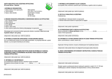 KARTA KWALIFIKACYJNA UCZESTNIKA WYPOCZYNKU KS Junak Słocina – Rzeszów I. INFORMACJE ORGANIZATORA 1. Nazwa imprezy, forma wypoczynku: 2. Termin imprezy: 3. Nazwa i adres ośrodka: Obóz sportowy 30.01.2015 r. do 01.02.2015 r. Zespół Szkół w Cmolasie Cmolas 269 36-105 Cmolas V. INFORMACJA WYCHOWAWCY KLASY O DZIECKU (w przypadku braku możliwości uzyskania opinii wychowawcy -wypełnia rodzic lub opiekun) ................................................................................................................................................................. ................................................................................................................................................................. ................................. ................................................... (miejscowość, data) (podpis ojca, matki lub opiekuna) VI. DECYZJA O KWALIFIKACJI UCZESTNIKA Postanawia się: II. WNIOSEK RODZICÓW (OPIEKUNÓW) O SKIEROWANIE DZIECKA NA WYPOCZYNEK 1. Imię i nazwisko dziecka ...................................................................................................................... 2. Data urodzenia ................................................................................................................................... 3. Adres zamieszkania ........................................................................................................................... 4. Numer PESEL ..................................................................................... telefon .................................... 5. Nazwa i adres szkoły .......................................................................................................................... 6. Adres rodziców (opiekunów) dziecka przebywającego na wypoczynku ............................................. .................................................................................................................. telefon .................................. Zobowiązuję się do uiszczenia kosztów wypoczynku dziecka w wysokości 130 zł słownie sto trzydzieści złotych i zero groszy. ................................. ................................................... (miejscowość, data) (podpis ojca, matki lub opiekuna) 1. Zakwalifikować i skierować dziecko na wypoczynek 2. Odmówić skierowania dziecka na wypoczynek ze względu: .............................................................. ................................................................................................................................................................. ................................................................................................................................................................. ................................. ................................................... (miejscowość, data) (podpis organizatora) III. INFORMACJA RODZICÓW (OPIEKUNÓW) O STANIE ZDROWIA DZIECKA (np. na co dziecko jest uczulone, jak znosi jazdę samochodem, czy przyjmuje stale leki i w jakich dawkach, czy nosi aparat ortodontyczny lub okulary) ................................................................................................................................................................. ................................................................................................................................................................. ................................................................................................................................................................. ................................................................................................................................................................. VIII. INFORMACJE O STANIE ZDROWIA DZIECKA W CZASIE TRWANIA WYPOCZYNKU (dane o zachorowanych, urazach, leczeniu itp.) ................................................................................................................................................................. ................................................................................................................................................................. Organizator informuje rodziców o leczeniu ambulatoryjnym lub hospitalizacji dziecka ................................. .................................................................................................. (miejscowość, data) (podpis lekarza lub pielęgniarki sprawującej opiekę medyczna) STWIERDZAM, ŻE PODAŁAM(EM) WSZYSTKIE ZNANE MI INFORMACJE O DZIECKU, KTÓRE MOGĄ POMÓC W ZAPEWNIENIU WŁAŚCIWEJ OPIEKI DZIECKU W CZASIE TRWANIA WYPOCZYNKU. ................................. ................................................... (miejscowość, data) (podpis ojca, matki lub opiekuna) IX. UWAGI I SPOSTRZEŻENIA WYCHOWAWCY-INSTRUKTORA O DZIECKU PODCZAS TRWANIA WYPOCZYNKU ................................................................................................................................................................. ................................................................................................................................................................. ................................................................................................................................................................. ................................................................................................................................................................. ................................................................................................................................................................. ................................. .................................. (miejscowość, data) (podpis wychowawcy) IV. INFORMACJA O SZCZEPIENIACH lub przedstawienie książeczki zdrowia z aktualnym wpisem szczepień: Szczepienia ochronne (podać rok): tężec ..............