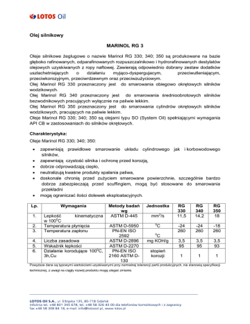 Olej silnikowy MARINOL RG 3 Oleje silnikowe żeglugowe o nazwie Marinol RG 330; 340; 350 są produkowane na bazie głęboko rafinowanych, odparafinowanych rozpuszczalnikowo i hydrorafinowanych destylatów olejowych uzyskiwanych z ropy naftowej. Zawierają odpowiednio dobrany zestaw dodatków uszlachetniających o działaniu myjąco-dyspergujacym, przeciwutleniającym, przeciwkorozyjnym, przeciwrdzewnym oraz przeciwzużyciowym. Olej Marinol RG 330 przeznaczony jest do smarowania obiegowo okrętowych silników wodzikowych. Olej Marinol RG 340 przeznaczony jest do smarowania średnioobrotowych silników bezwodnikowych pracujących wyłącznie na paliwie lekkim. Olej Marinol RG 350 przeznaczony jest do smarowania cylindrów okrętowych silników wodzikowych, pracujących na paliwie lekkim. Oleje Marinol RG 330; 340; 350 są olejami typu SO (System Oil) spełniającymi wymagania API CB w zastosowaniach do silników okrętowych. Charakterystyka: Oleje Marinol RG 330; 340; 350: • • • • • • zapewniają prawidłowe smarowanie układu cylindrowego jak i korbowodowego silników, zapewniają czystość silnika i ochronę przed korozją, dobrze odprowadzają ciepło, neutralizują kwaśne produkty spalania paliwa, doskonale chronią przed zużyciem smarowane powierzchnie, szczególnie bardzo dobrze zabezpieczają przed scuffingiem, mogą być stosowane do smarowania przekładni mogą ograniczać ilości dolewek eksploatacyjnych. Lp. Wymagania 1. Lepkość kinematyczna w 1000C Temperatura płynięcia Temperatura zapłonu 2. 3. 4. 5. 6. Liczba zasadowa Wskaźnik lepkości Działanie korodujące 1000C, 3h,Cu Metody badań wg ASTM D-445 ASTM D-5950 PN-EN ISO 2592 ASTM D-2896 ASTM D-2270 PN-EN ISO 2160 ASTM D130 Jednostka mm2/s 0 C RG 330 11,5 RG 340 14,2 RG 350 18 -24 260 -24 260 -18 260 3,5 95 3,5 95 3,5 93 1 1 1 0 C mg KOH/g stopień korozji Powyższe dane są typowymi wartościami uzyskiwanymi przy normalnej tolerancji partii produkcyjnych, nie stanowią specyfikacji technicznej, z uwagi na ciągły rozwój produktu mogą ulegać zmianie. __________________________________________________________________________________________ Specyfikacje, klasyfikacje: RG 330 – SAE 30 RG 340 – SAE 40 RG 350 – SAE 50 Produkt odpowiada klasyfikacji API CB w zastosowaniach do silników okrętowych. Opakowanie: 180kg, 1 tona Składowanie: Wszelkie opakowania powinny być przechowywane w zadaszonych pomieszczeniach. Jeżeli beczki przechowuje się na otwartej przestrzeni, gdzie mogą być narażone na czynniki atmosferyczne - opady, należy je ustawić w pozycji poziomej, tak aby uniemożliwić dostęp wody oraz zapobiec zniszczeniu oznakowania, najwłaściwiej przykryć brezentem. Produkt nie może być przechowywany w temperaturze wyższej niż 60 ºC, ani tez narażony na działanie promieni słonecznych lub niskich temperatur poniżej 0 ºC. Gwarantowany okres przydatności produktu do użycia przy zachowaniu warunków magazynowania wynosi nie mniej niż 3 lata. Zdrowie, BHP, środowisko: Informacje na temat bezpieczeństwa zawarte są w zbiorze danych dotyczących bezpieczeństwa materiałów (karta bezpieczeństwa MSDS). Zawarte tam są szczegółowe informacje odnośne potencjalnych zagrożeń, środków ostrożności oraz zasad udzielania pierwszej pomocy wraz z informacjami na temat wpływu na środowisko naturalne i usuwania wykorzystanych produktów. Lotos Oil SA i firmy współpracujące nie ponoszą odpowiedzialności za skutki niezgodnego z przeznaczenie wykorzystania produktu lub niestosowania opisanych środków ostrożności. Przed zastosowaniem produktu do innych niż wymienione celów, należy zasięgnąć porady lokalnego biura Lotos Oil SA. Dane zawarte w niniejszej karcie nie stanowią oferty w rozumieniu przepisów ustawy z dnia 23 kwietnia 1964 roku - kodeks cywilny. LOTOS Oil S.A. nie ponosi żadnej odpowiedzialności za jakiekolwiek skutki wykorzystywania danych zawartych w karcie, w szczególności przy podejmowaniu decyzji handlowych i inwestycyjnych. Wszelkie dane zawarte w karcie są typowymi wartościami uzyskiwanymi przy normalnej tolerancji partii produkcyjnych, mogą się nieznacznie różnić z uwagi na charakterystykę procesu produkcji, a także z uwagi na ciągły rozwój produktu. Dane zawarte w karcie mogą podlegać zmianom. LOTOS Oil S.A. nie ponosi odpowiedzialności za dostępność produktu. Opracowano:18.03.2008 Wydanie nr 2 Aktualizacja:10.12.2010 __________________________________________________________________________________________