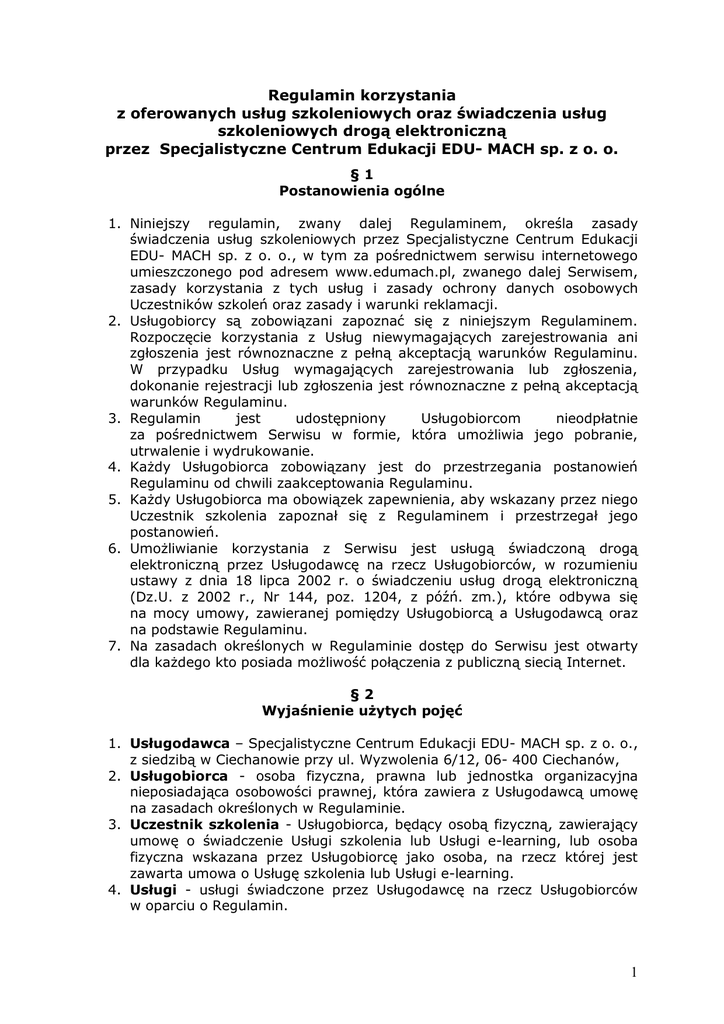 Regulamin korzystania z oferowanych usług szkoleniowych oraz świadczenia usług szkoleniowych drogą elektroniczną przez Specjalistyczne Centrum Edukacji EDU- MACH sp. z o. o. §1 Postanowienia ogólne 1. Niniejszy regulamin, zwany dalej Regulaminem, określa zasady świadczenia usług szkoleniowych przez Specjalistyczne Centrum Edukacji EDU- MACH sp. z o. o., w tym za pośrednictwem serwisu internetowego umieszczonego pod adresem www.edumach.pl, zwanego dalej Serwisem, zasady korzystania z tych usług i zasady ochrony danych osobowych Uczestników szkoleń oraz zasady i warunki reklamacji. 2. Usługobiorcy są zobowiązani zapoznać się z niniejszym Regulaminem. Rozpoczęcie korzystania z Usług niewymagających zarejestrowania ani zgłoszenia jest równoznaczne z pełną akceptacją warunków Regulaminu. W przypadku Usług wymagających zarejestrowania lub zgłoszenia, dokonanie rejestracji lub zgłoszenia jest równoznaczne z pełną akceptacją warunków Regulaminu. 3. Regulamin jest udostępniony Usługobiorcom nieodpłatnie za pośrednictwem Serwisu w formie, która umożliwia jego pobranie, utrwalenie i wydrukowanie. 4. Każdy Usługobiorca zobowiązany jest do przestrzegania postanowień Regulaminu od chwili zaakceptowania Regulaminu. 5. Każdy Usługobiorca ma obowiązek zapewnienia, aby wskazany przez niego Uczestnik szkolenia zapoznał się z Regulaminem i przestrzegał jego postanowień. 6. Umożliwianie korzystania z Serwisu jest usługą świadczoną drogą elektroniczną przez Usługodawcę na rzecz Usługobiorców, w rozumieniu ustawy z dnia 18 lipca 2002 r. o świadczeniu usług drogą elektroniczną (Dz.U. z 2002 r., Nr 144, poz. 1204, z późń. zm.), które odbywa się na mocy umowy, zawieranej pomiędzy Usługobiorcą a Usługodawcą oraz na podstawie Regulaminu. 7. Na zasadach określonych w Regulaminie dostęp do Serwisu jest otwarty dla każdego kto posiada możliwość połączenia z publiczną siecią Internet. §2 Wyjaśnienie użytych pojęć 1. Usługodawca – Specjalistyczne Centrum Edukacji EDU- MACH sp. z o. o., z siedzibą w Ciechanowie przy ul. Wyzwolenia 6/12, 06- 400 Ciechanów, 2. Usługobiorca - osoba fizyczna, prawna lub jednostka organizacyjna nieposiadająca osobowości prawnej, która zawiera z Usługodawcą umowę na zasadach określonych w Regulaminie. 3. Uczestnik szkolenia - Usługobiorca, będący osobą fizyczną, zawierający umowę o świadczenie Usługi szkolenia lub Usługi e-learning, lub osoba fizyczna wskazana przez Usługobiorcę jako osoba, na rzecz której jest zawarta umowa o Usługę szkolenia lub Usługi e-learning. 4. Usługi - usługi świadczone przez Usługodawcę na rzecz Usługobiorców w oparciu o Regulamin. 1 5. Usługi szkolenia - Usługi, o których mowa w § 3 ust. 1 pkt 1) Regulaminu. 6. Usługi elektroniczne - Usługi świadczone drogą elektroniczną przez Usługodawcę na rzecz Usługobiorców w oparciu o Regulamin. §3 Zakres świadczonych usług 1. Usługodawca świadczy: 1) Usługi szkolenia, polegające na możliwości uczestniczenia w szkoleniach, warsztatach, kursach (zwanych dalej „Szkoleniami”), organizowanych we wskazanym miejscu, w terminach określonych przez Usługodawcę; 2) Usługi elektroniczne, w tym: a) możliwość przeglądania i odczytywania przez Usługobiorców materiałów zamieszczanych w Serwisie, b) przesyłanie Usługobiorcom informacji o nowościach zamieszczonych na stronie Serwisu, c) możliwość uczestnictwa w szkoleniach e-learning (szkolenia on-line). 2. Korzystanie z niektórych Usług wymaga zarejestrowania w Serwisie. Usługodawca określa w Serwisie rodzaje Usług wymagających zarejestrowania. 3. Oferta świadczenia Usług elektronicznych jest ważna do czasu zawieszenia lub zaprzestania ich świadczenia przez Usługodawcę. Usługodawca uprawniony jest do zawieszenia lub zaprzestania świadczenia Usług elektronicznych bez uprzedniego zawiadamiania Usługobiorców, z zastrzeżeniem zachowania praw Usługobiorców, którzy wnieśli opłatę na poczet świadczenia Usług elektronicznych. §4 Zawarcie umowy świadczenia usług 1. Zawarcie umowy o świadczenie Usługi szkolenia wymaga wysłania prawidłowo wypełnionego formularza: 1) w postaci elektronicznej w sposób podany w Serwisie albo 2) faksem na numer podany na formularzu albo 3) listem na adres Usługodawcy, podany w § 2 ust. 1 Regulaminu. 2. Zawarcie umowy o świadczenie Usługi szkolenia następuje w momencie potwierdzenia przez Usługodawcę otrzymania poprawnie wypełnionego formularza przez przesłanie wiadomości e-mail na adres Uczestnika szkolenia podany w formularzu. 3. Potwierdzeniem zawarcia umowy o świadczenie Usługi szkolenia może być ustna informacja podczas rozmowy telefonicznej w trakcie zapisu na szkolenie. 4. Przy zamówieniu szkolenia Rady Pedagogicznej pracownik Usługodawcy kontaktuje się z osobą zamawiającą szkolenie telefonicznie w celu potwierdzenia zawartości merytorycznej szkolenia oraz ustalenia dokładnego terminu, czasu trwania, ilości uczestników, ceny i formy płatności (faktura na przelew, gotówkowa, rozbicie kwoty na kilka faktur, etc.). Obowiązek powiadomienia uczestników szkolenia Rady Pedagogicznej ciąży na osobie zamawiającej szkolenie. 2 5. Zawarcie umowy o świadczenie Usług elektronicznych: 1) polegających na przeglądaniu zawartości Serwisu następuje w momencie dokonania jakiejkolwiek czynności w Serwisie przez Usługobiorcę; 2) mającej za przedmiot otrzymywanie przez Usługobiorcę informacji o nowościach zamieszczonych na stronie serwisu następuje w momencie przesłania do Usługodawcy wypełnionego formularza zamieszczonego w Serwisie; 3) o świadczenie usługi e-learning następuje w momencie otrzymania przez Usługodawcę poprawnie wypełnionego formularza rejestracyjnego dotyczącego wybranego szkolenia, wysłanego do Usługodawcy: a) Usługobiorca wysyła formularz w postaci elektronicznej w sposób podany w Serwisie albo b) faksem na