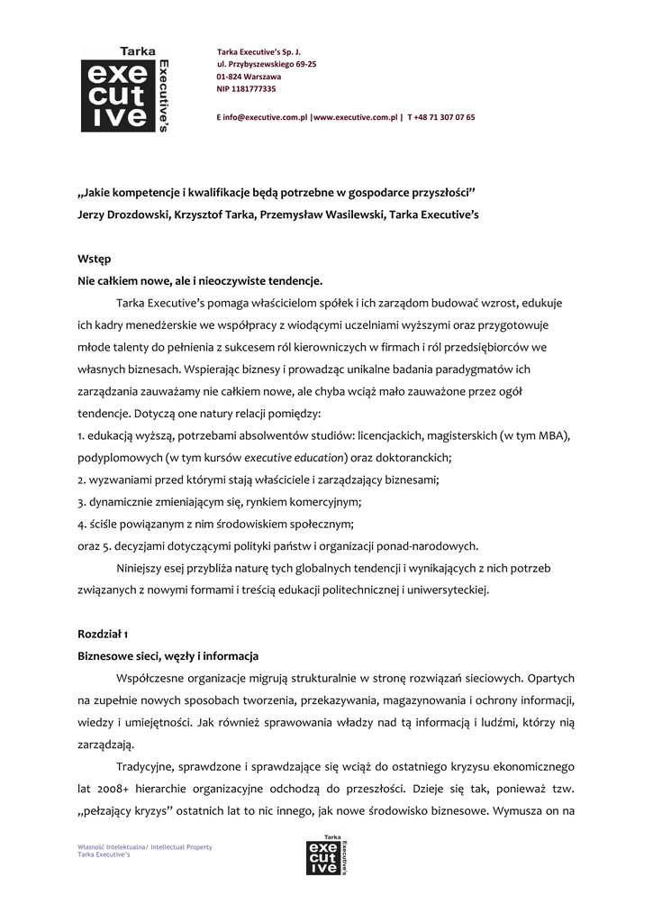 Tarka Executive’s Sp. J. ul. Przybyszewskiego 69-25 01-824 Warszawa NIP 1181777335 E [email protected] |www.executive.com.pl | T +48 71 307 07 65 „Jakie kompetencje i kwalifikacje będą potrzebne w gospodarce przyszłości” Jerzy Drozdowski, Krzysztof Tarka, Przemysław Wasilewski, Tarka Executive’s Wstęp Nie całkiem nowe, ale i nieoczywiste tendencje. Tarka Executive’s pomaga właścicielom spółek i ich zarządom budować wzrost, edukuje ich kadry menedżerskie we współpracy z wiodącymi uczelniami wyższymi oraz przygotowuje młode talenty do pełnienia z sukcesem ról kierowniczych w firmach i ról przedsiębiorców we własnych biznesach. Wspierając biznesy i prowadząc unikalne badania paradygmatów ich zarządzania zauważamy nie całkiem nowe, ale chyba wciąż mało zauważone przez ogół tendencje. Dotyczą one natury relacji pomiędzy: 1. edukacją wyższą, potrzebami absolwentów studiów: licencjackich, magisterskich (w tym MBA), podyplomowych (w tym kursów executive education) oraz doktoranckich; 2. wyzwaniami przed którymi stają właściciele i zarządzający biznesami; 3. dynamicznie zmieniającym się, rynkiem komercyjnym; 4. ściśle powiązanym z nim środowiskiem społecznym; oraz 5. decyzjami dotyczącymi polityki państw i organizacji ponad-narodowych. Niniejszy esej przybliża naturę tych globalnych tendencji i wynikających z nich potrzeb związanych z nowymi formami i treścią edukacji politechnicznej i uniwersyteckiej. Rozdział 1 Biznesowe sieci, węzły i informacja Współczesne organizacje migrują strukturalnie w stronę rozwiązań sieciowych. Opartych na zupełnie nowych sposobach tworzenia, przekazywania, magazynowania i ochrony informacji, wiedzy i umiejętności. Jak również sprawowania władzy nad tą informacją i ludźmi, którzy nią zarządzają. Tradycyjne, sprawdzone i sprawdzające się wciąż do ostatniego kryzysu ekonomicznego lat 2008+ hierarchie organizacyjne odchodzą do przeszłości. Dzieje się tak, ponieważ tzw. „pełzający kryzys” ostatnich lat to nic innego, jak nowe środowisko biznesowe. Wymusza on na Własność Intelektualna/ Intellectual Property Tarka Executive’s Politechnika Warszawska Tarka Executive’s JAKIE KOMPETENCJE? firmach komercyjnych nowe rozwiązania organizacyjne. Muszą one odpowiadać wymogom i wyzwaniom nowego środowiska rynkowego. Stąd nowe rozwiązania organizacyjne stosowane przez biznesy i wszystkie współpracujące z nimi instytucje muszą ewoluować tak, by stać się adekwatną odpowiedzią na nowe wymogi i wyzwania środowiska rynkowego, politycznego i społecznego. Dotyczy to definicji ról, które pełnimy w organizacjach i wobec organizacji jako właściciele, zarządzający, menedżerowie i profesjonaliści. Przy tym zmieniają się nie tylko same role, ale i współzależność człowieka i wypełnianej przez niego odpowiedzialności. Wyłaniają się nowe zasady współpracy pomiędzy ludźmi, ich zespołami, organizacją, w ramach której grupy funkcjonują oraz instytucjami i otaczającym je rynkiem. Szerzej te procesy opisane są w Rozdziale „Ewolucja w ogniu walki”. Jest to część szerszego procesu antycypowanego już przez Alvina Tofflera pod koniec lat 70-tych XX wieku. Toffler w swojej profetycznej pozycji „Zmiana Władzy” wskazał na procesy utraty i uzyskiwania kontroli w kolejnych fazach rozwoju historyczno-gospodarczego. Zdaniem tego autora pod koniec XX wieku i na początku XXI następuje przejście od gospodarki przemysłowej zwanej przez niego „Drugą Falą” do gospodarki cyfrowej – gospodarki „Trzeciej Fali”. W tej „Drugiej” władza elit oparta była na bogactwie i kapitale. W tej „Trzeciej” na wiedzy i kompetencjach. Obecne światowe kariery biznesów takich jak Alphabet/ Google oraz Facebook, jak i wzrost potęgi ich właścicieli: Brina, Page’a, czy Zuckerberga stanowią świetną ilustrację tej tezy. To nowe środowisko rynkowo-organizacyjne oparte na sieciowości wymaga zestawu nowych kompetencji. Kompetencji rozumianych jako czynniki sukcesu prowadzące do wysokiej skuteczności osobistej, zespołowej, organizacyjnej i rynkowej. To, że dany pracownik, zespół, czy firma są kompetentni nie jest prawdą absolutną, lecz zależy od tego na ile ich repertuar postaw, wiedzy i zachowań pasuje lub nie do otaczającego ich środowiska. Działające w tym przypadku mechanizmy są czysto darwinowskie, powiązane z zasadą przetrwania i zwiększonej reprodukcji najbardziej przystosowanego („the survival of the fittest”). Firmy, organizacje, zespoły i ludzie w nich pracujący muszą posiadać i „produkować” nowe kompetencje, jeśli chcą odnieść sukces na współczesnym i przyszłym, jeszcze bardziej sieciowym rynku. Firmy, organizacje, zespoły i ludzie „produkujący” kompetencje sprawdzone w poprzednim otoczeniu będą ponosić coraz większe porażki. A ich biznesy przegrają z nową, nastawioną na sieciowość falą rozwiązań komercyjnych. Z samej natury sieci wynika przede wszystkim koncentracja uwikłanych w nią podmiotów na przetwarzaniu i zarządzaniu informacją (wiedzą i umiejętnościami). Drugą immanentną cechą sieci jest jej organizacja splotu w „węzły” koncentrujące uwagę i decyzje otaczających je podmiotów. Obie te cechy: krytyczne znaczenie zarządzania informacją oraz kluczowa waga Własność Intelektualna/ Intellectual Property Tarka Executive’s 2 Politechnika Warszawska Tarka Executive’s JAKIE KOMPETENCJE? tworzenia i zachowania się węzłów definiują nowe paradygmaty zachowania. Opisujemy je w Rozdziale „Nowe kompetencje Sukcesu”. Dotyczą one sprawowania „władzy” i okazywania „podległości” w sieciowej organizacji. Kompetencje skoncentrowane na informacji i na węzłach stają się najważniejsze dla sukcesu biznesów w nowym otoczeniu rynkowym. Paradoksalnie proces ten dotyczy również innych podmiotów społecznych i rynkowych, takich j