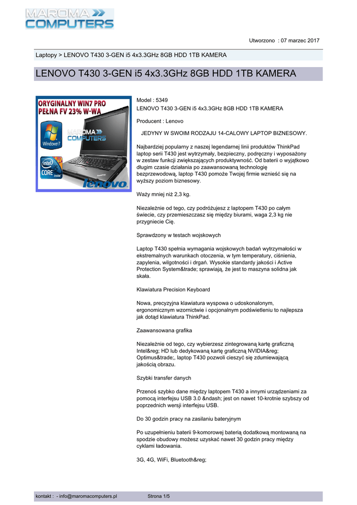 Utworzono : 07 marzec 2017 Laptopy > LENOVO T430 3-GEN i5 4x3.3GHz 8GB HDD 1TB KAMERA LENOVO T430 3-GEN i5 4x3.3GHz 8GB HDD 1TB KAMERA Model : 5349 LENOVO T430 3-GEN i5 4x3.3GHz 8GB HDD 1TB KAMERA s r te Producent : Lenovo JEDYNY W SWOIM RODZAJU 14-CALOWY LAPTOP BIZNESOWY. Najbardziej popularny z naszej legendarnej linii produktów ThinkPad laptop serii T430 jest wytrzymały, bezpieczny, podręczny i wyposażony w zestaw funkcji zwiększających produktywność. Od baterii o wyjątkowo długim czasie działania po zaawansowaną technologię bezprzewodową, laptop T430 pomoże Twojej firmie wznieść się na wyższy poziom biznesowy. u p m o Waży mniej niż 2,3 kg. Niezależnie od tego, czy podróżujesz z laptopem T430 po całym świecie, czy przemieszczasz się między biurami, waga 2,3 kg nie przygniecie Cię. C a Sprawdzony w testach wojskowych m ro a M Laptop T430 spełnia wymagania wojskowych badań wytrzymałości w ekstremalnych warunkach otoczenia, w tym temperatury, ciśnienia, zapylenia, wilgotności i drgań. Wysokie standardy jakości i Active Protection System™ sprawiają, że jest to maszyna solidna jak skała. Klawiatura Precision Keyboard Nowa, precyzyjna klawiatura wyspowa o udoskonalonym, ergonomicznym wzornictwie i opcjonalnym podświetleniu to najlepsza jak dotąd klawiatura ThinkPad. Zaawansowana grafika Niezależnie od tego, czy wybierzesz zintegrowaną kartę graficzną Intel® HD lub dedykowaną kartę graficzną NVIDIA® Optimus™, laptop T430 pozwoli cieszyć się zdumiewającą jakością obrazu. Szybki transfer danych Przenoś szybko dane między laptopem T430 a innymi urządzeniami za pomocą interfejsu USB 3.0 – jest on nawet 10-krotnie szybszy od poprzednich wersji interfejsu USB. Do 30 godzin pracy na zasilaniu bateryjnym Po uzupełnieniu baterii 9-komorowej baterią dodatkową montowaną na spodzie obudowy możesz uzyskać nawet 30 godzin pracy między cyklami ładowania. 3G, 4G, WiFi, Bluetooth® kontakt : - [email protected] Strona 1/5 Utworzono : 07 marzec 2017 Laptopy > LENOVO T430 3-GEN i5 4x3.3GHz 8GB HDD 1TB KAMERA LENOVO T430 3-GEN i5 4x3.3GHz 8GB HDD 1TB KAMERA Z pełnym pakietem technologii bezprzewodowych możesz korzystać z łączności gdziekolwiek jesteś. s r te Wbudowana kamera internetowa 720p HD oraz podwójne mikrofony Wysoka jakość obrazu i dźwięku oraz funkcje śledzenia twarzy i wytłumiania odgłosów klawiatury zapewnią nowy wymiar konferencji internetowych. u p Wyświetlacz HD lub HD+ 14" Wyświetlacze HD i HD+ zapewniają jasny i żywy obraz w laptopie T430 — nawet patrząc na niego pod dużym kątem. m o Głośniki Dolby® z technologią Advanced Audio™ v2 Przygotuj się na niezapomniane doznania dźwiękowe, niezależnie od tego, czy słuchasz prezentacji czy relaksujesz się przy filmie. C a Technologie Lenovo ThinkVantage® Z Lenovo uzyskujesz dostęp do prostych w obsłudze, praktycznych i bezpiecznych pakietów oprogramowania, takich jak Password Manager, Rescue and Recovery czy Access Connections™. m ro a M Powyżej zdjęcia poglądowe. Towar używany - Klasa A, bez żadnych pęknięć, odgnieceń itd. W razie potrzeby możemy wysłać zdjęcia realphoto. W konfiguracji komputera proszę się sugerować opisem w ramce ! Rodzina produktów: Lenovo ThinkPad Procesor: Intel® Core™ i5-3320M Processor - 4 wątki, 2 rdzenie x 2.6 GHz Procesor 3 generacji Intel Ivy Bridge (3M Cache, 64-bit, 5 GT/s maks. 3.30GHz ) kontakt : - [email protected] Strona 2/5 Utworzono : 07 marzec 2017 Laptopy > LENOVO T430 3-GEN i5 4x3.3GHz 8GB HDD 1TB KAMERA LENOVO T430 3-GEN i5 4x3.3GHz 8GB HDD 1TB KAMERA s r te Matryca: 14" 16:9, HDTV 1366x768 pikseli - Color, Anti-glare, LED backlight Kontroler graficzny: u p m o Karta graficzna - Intel GMA HD Integrated Graphics 4000 (1695MB pamięci współ.) C a Pamięc RAM: m ro a M 8192 MB DDR3 - możliwość zwiększenia pamięci ram Sprawdź ! Dysk twardy: Dysk 1TB SATA, możliwość zamiany na dysk 250GB SSD Sprawdź ! Napęd: DVD+/-RW ( Nagrywarka Multi-Burner/DVD CD Multi-Rec ) Dźwięk: Realtek ALC269 - Dolby® Advanced Audio™ 2.0 kontakt : - [email protected] Strona 3/5 Utworzono : 07 marzec 2017 Laptopy > LENOVO T430 3-GEN i5 4x3.3GHz 8GB HDD 1TB KAMERA LENOVO T430 3-GEN i5 4x3.3GHz 8GB HDD 1TB KAMERA s r te Karta sieciowa: Intel 82579LM Gigabit Network Connection (10/100/1000MBit) u p Modem: xxx C a m o Komunikacja bezprzewodowa: Intel Centrino Advanced-N 6205 (a b g n ) ; 4.0 Bluetooth (niektóre modele) m ro a M Porty: 2 x USB 3.0 (Bardzo szybkie złącze) 1 x USB 2.0 1 x Gniazdo USB 2.0 zawsze włączone Mini DisplayPort z obsługą dźwięku (cyfrowe wejście audio wideo) VGA Combo jack 3,5 mm: słuchawki/mikrofon Czytnik kart SD 4-w-1 (SD/SDHC/SDXC/MMC) Express Card 34 mm Blokada Kensingtona Wprowadzanie danych: Touchpad + TrackPoint ( funkcja multitouch ) Klawiatura ThinkPad Precision: układ wyspowy, 6 rzędów, odporna na zalania Laptop wyposażony jest w klawiaturę o standardzie UK qwerty (możliwe naklejki gratis) kontakt : - [email protected] Strona 4/5 Utworzono : 07 marzec 2017 Laptopy > LENOVO T430 3-GEN i5 4x3.3GHz 8GB HDD 1TB KAMERA LENOVO T430 3-GEN i5 4x3.3GHz 8GB HDD 1TB KAMERA s r te Bateria: Bateria wybierana losowo System operacyjny: u p m o Windows 7 Professional 64bit (COA) - system zainstalowany na dysku + licencja C a Dodatki: Układ szyfrujący TPM, Kamera 720p HD z funkcją śledzenia twarzy (niektóre modele) m ro a M Gwarancja: 3 miesiące - realizowana w naszym serwisie Stan: Używany Cena : 1.799,00 zł Brutto ( 1.474,59 zł Netto) Dostępność: Produkt dostępny w naszym sklepie od 21 styczeń 2016 kontakt : - [email protected] Strona 5/5